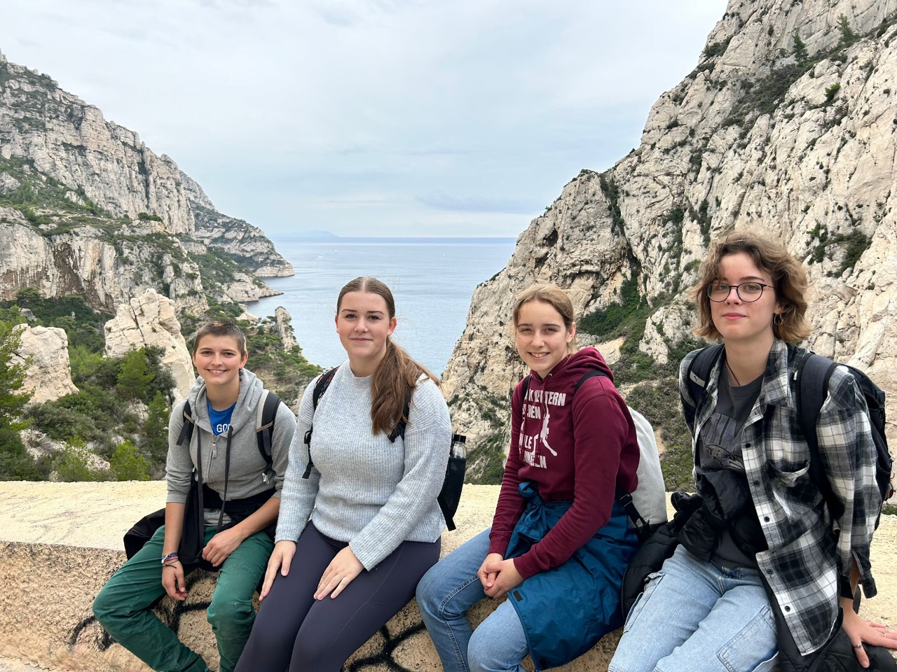 Am Sonntag (06.10.) hieß es für einige von uns früh aufstehen, da wir einen Ausflug in die Calanques bei Marseille ans Meer machen wollten. Nach einer schönen, aber auch etwas anstrengenden Wanderung, für die uns der Ausblick auf jeden Fall entschädigte, erreichten wir das türkisblaue Meer erreicht, in dem ein paar Schülerinnen sogar auch schwimmen waren, während sich der Rest der Gruppe mit einem gemütlichen Picknick stärkte, denn auf dem Rückweg mussten wir den stoppligen Berg natürlich auch wieder nach oben laufen. Nach diesem weiteren wunderschönen fünften Tag hatten wir uns das gemeinsame Abendessen als Ausklang mit allen Gastfamilien im Restaurant „Au Bureau” mit Blick auf das wunderschöne „Château de l’Emperi” mehr als verdient. So trafen wir uns mit insgesamt zwanzig Personen und entdeckten bei einer gemütlichen und lockeren Unterhaltung weitere Gerichte der französischen Küche.