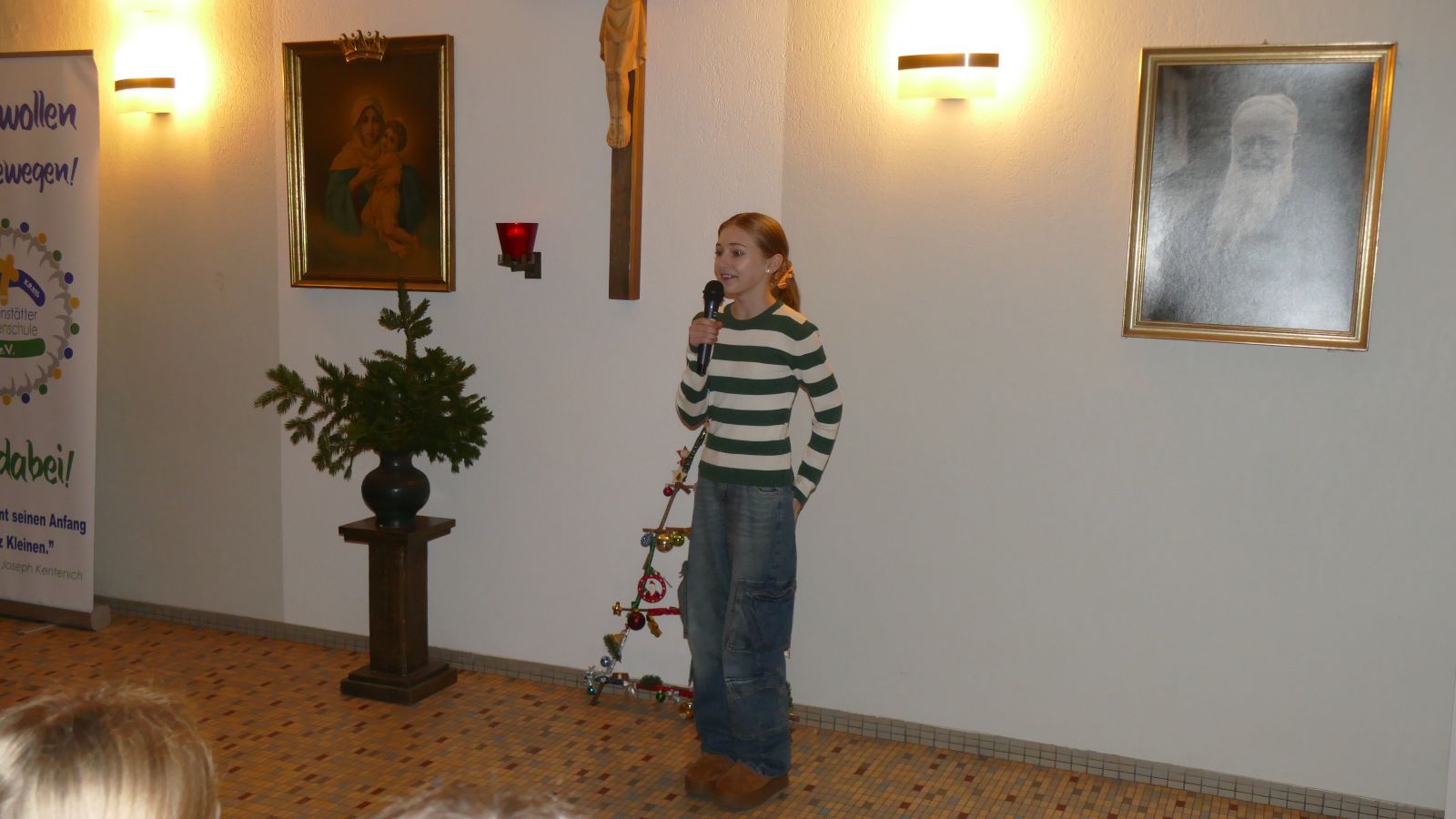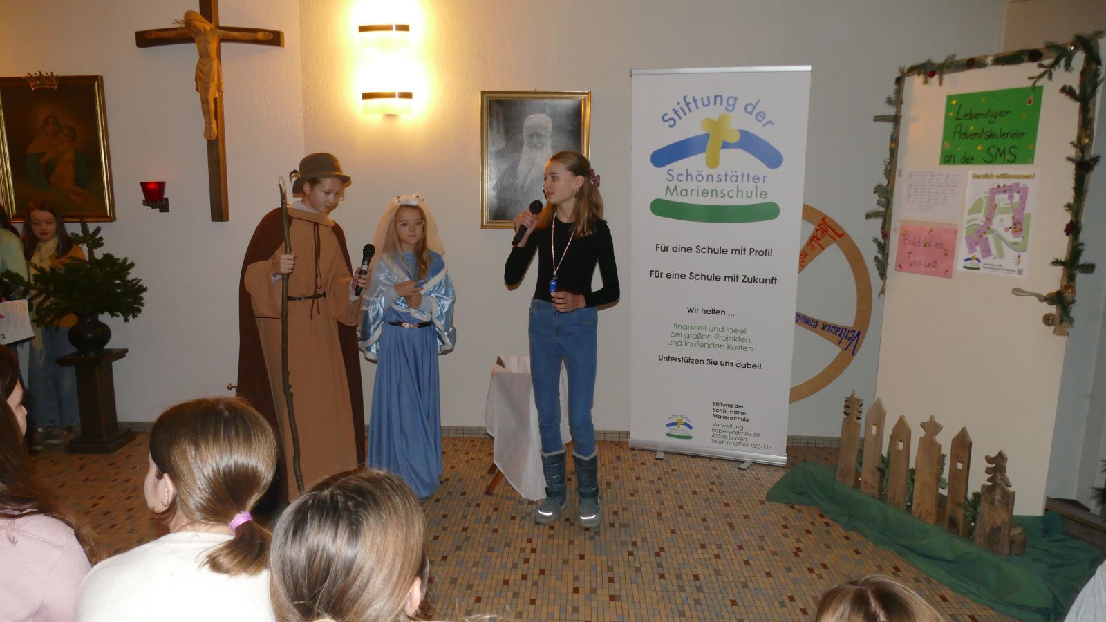 Die Schülerin stellte eine leere Krippe vor Maria und Josef und verwies auf die im Bacheingang eigens aufgestellte Tür mit Plakaten zum „Lebendigen Adventskalender an der SMS“. Darauf ist zu lesen, welche Klasse an welchem Tag ihre Tür gestaltet, dekoriert und zur Mitfreude einlädt.