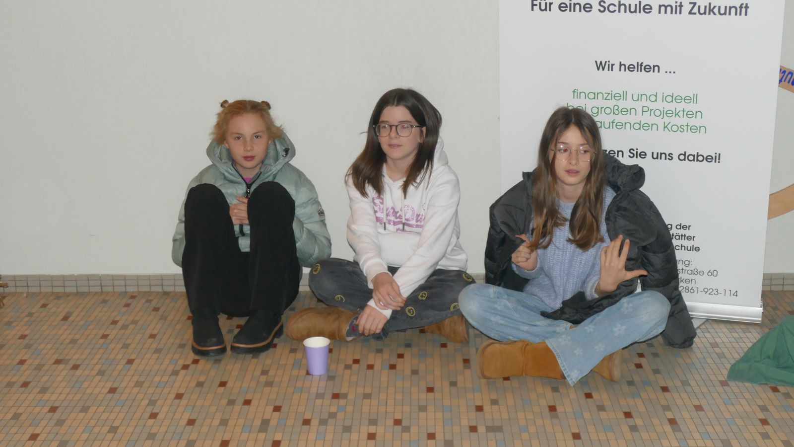 Danach bot die Klasse drei Spielszenen dar. In der ersten begegnen mehrere Leute bettelnden Menschen, manche von ihnen achtlos, andere mit Respekt. Die zweite Szene spielte in der Schule unter Schülerinnen, die ein Mädchen mit Ablehnung gewissermaßen draußen vor der Tür stehen lassen. Eine offene Tür fand die Ausgeschlossene dann bei einer Gruppe, die ihr entgegenkam und sie bei sich aufnahm. <
