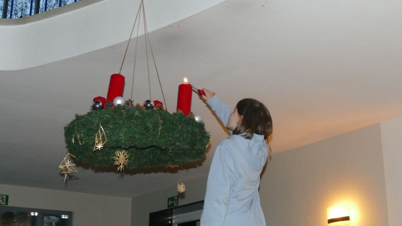 In der Adventszeit hat so gut wie jede Klasse in der Marienschule ihren eigenen Adventskranz. Auch im Klassenzimmer darf man sich daran erinnern, dass die Wochen vor Weihnachten eine besondere Zeit sind. Viele Klassen haben ihre Rituale und pflegen lieb gewordene Traditionen. Bein großen Adventskranz am Bacheingang lassen sich am Montag und Dienstag nach dem ersten Advent alle Klassen der SMS einstimmen in die Adventszeit.