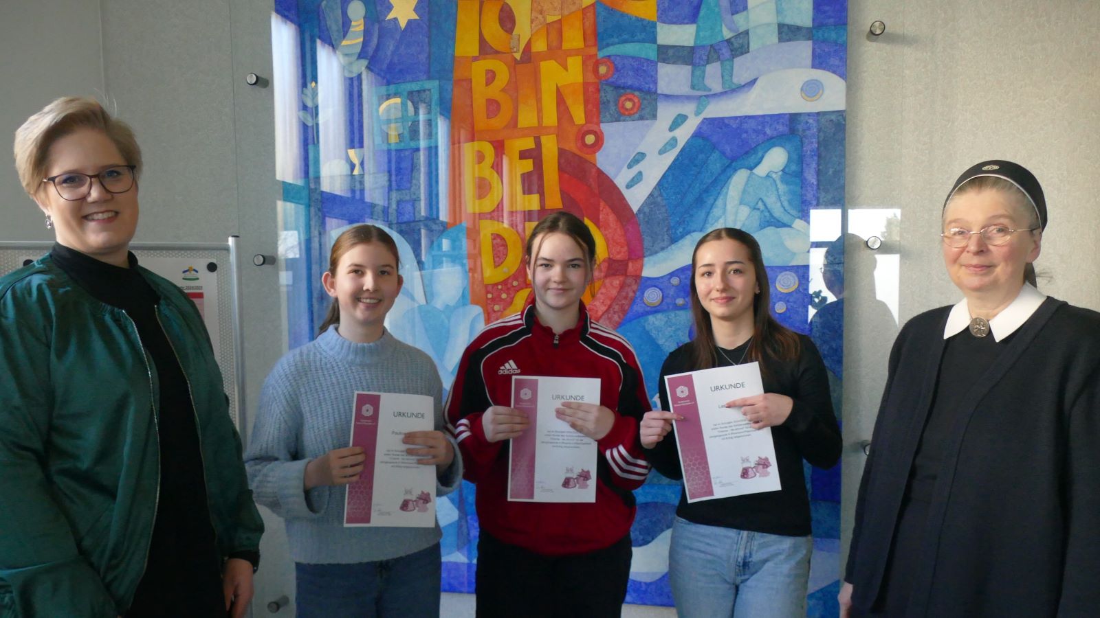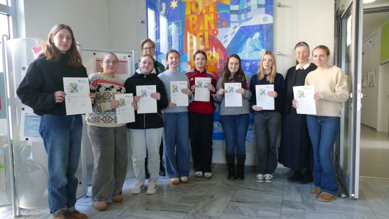 Sr. M. Gabriele überreichte gemeinsam mit Fr. Böhm, der Leiterin des „Chemie macht Spaß“-Teams, die verdienten Urkunden und gratulierte zum Wettbewerbsgeist und dem guten Abschneiden der Teilnehmerinnen.