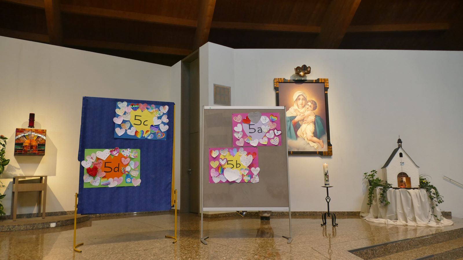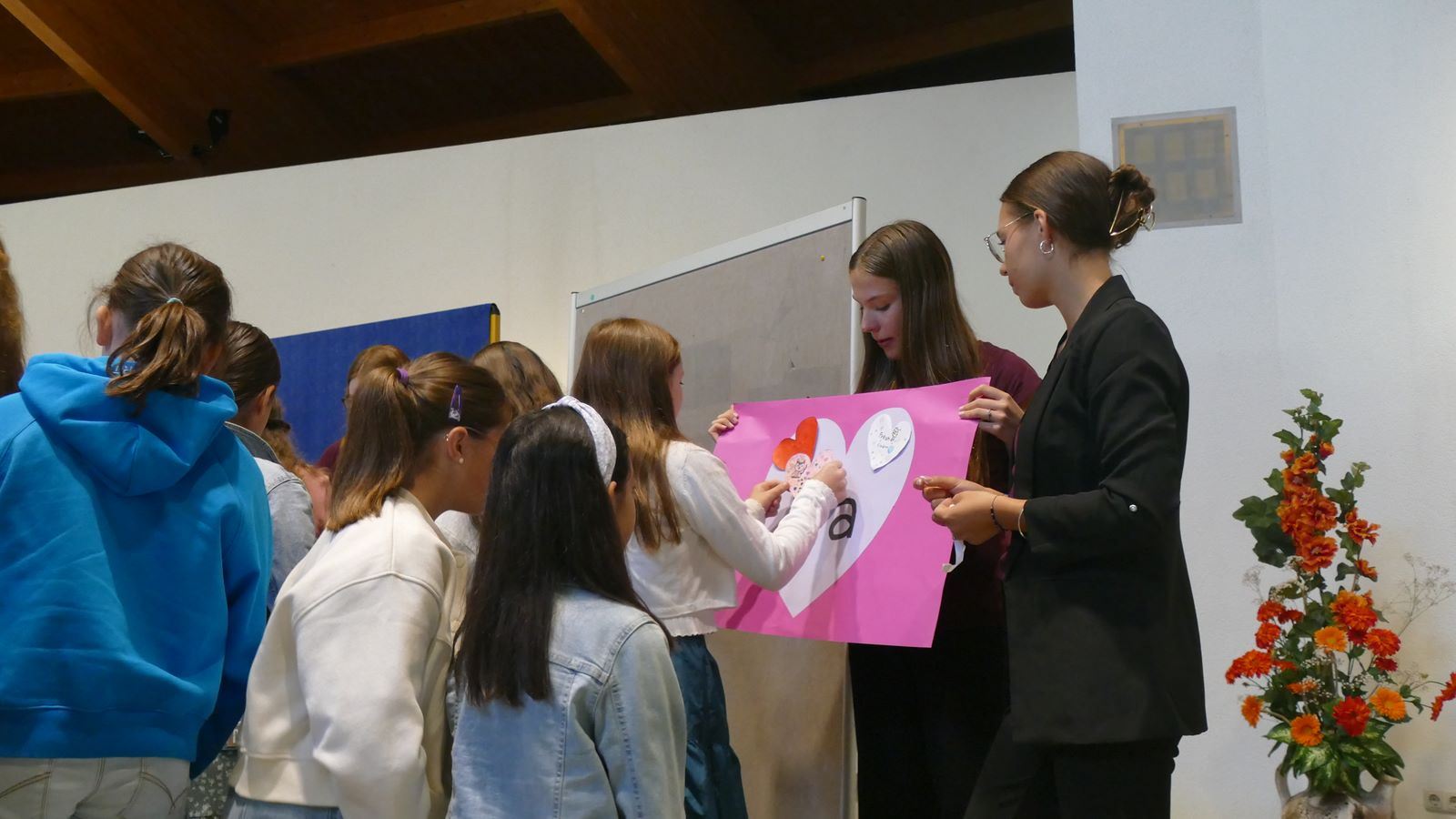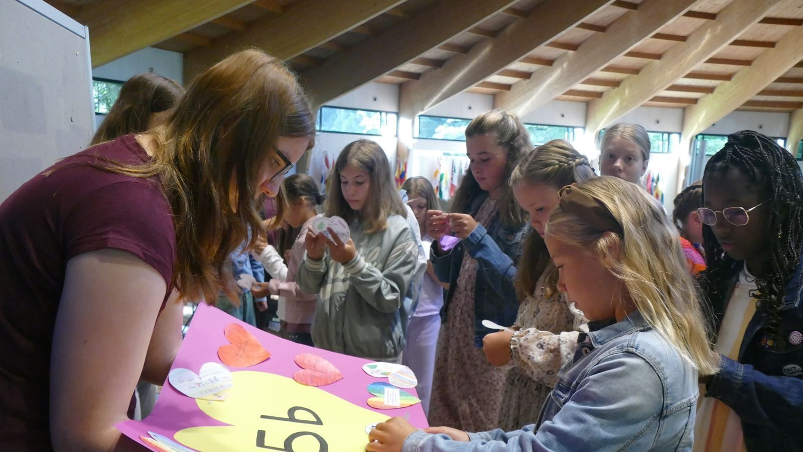 In den Einschulungsgottesdienst haben die neuen Schülerinnen Papierherzen mitgebracht, auf die sie persönliche „Herzenswünsche“ geschrieben hatten. Es war ein besonderer Moment für alle, als diese Herzen von den Patinnen der Neuen auf großen Herzen mit der Aufschrift „5a“, „5b“, 5c“, „5d“ geklebt wurden. Die Herzplakate hängen bereits in den Klassenzimmern der Unterstufe. So können die gesammelten Herzenswünsche Wegweiser für die erste aufregende Zeit an der SMS sein.
