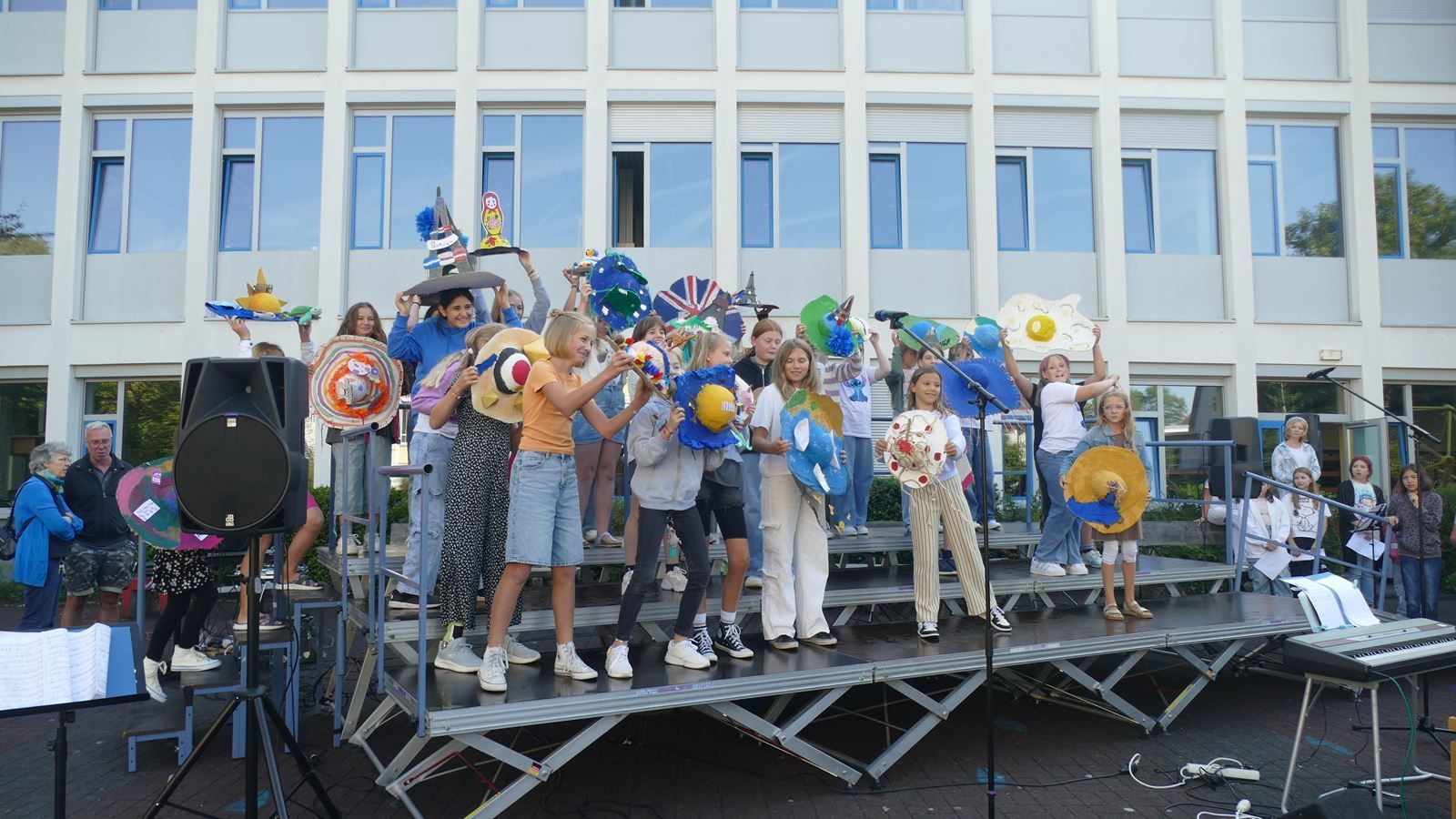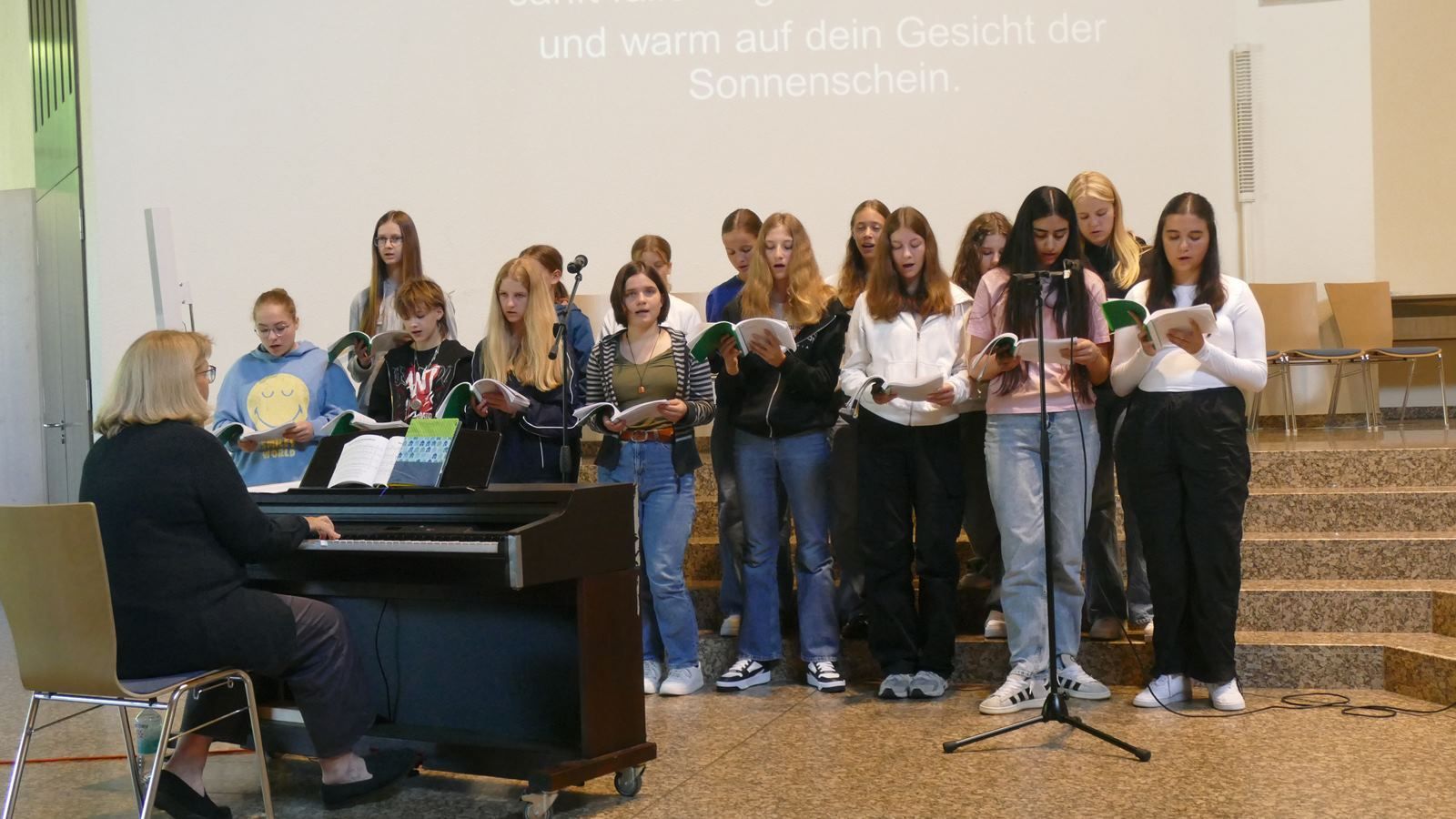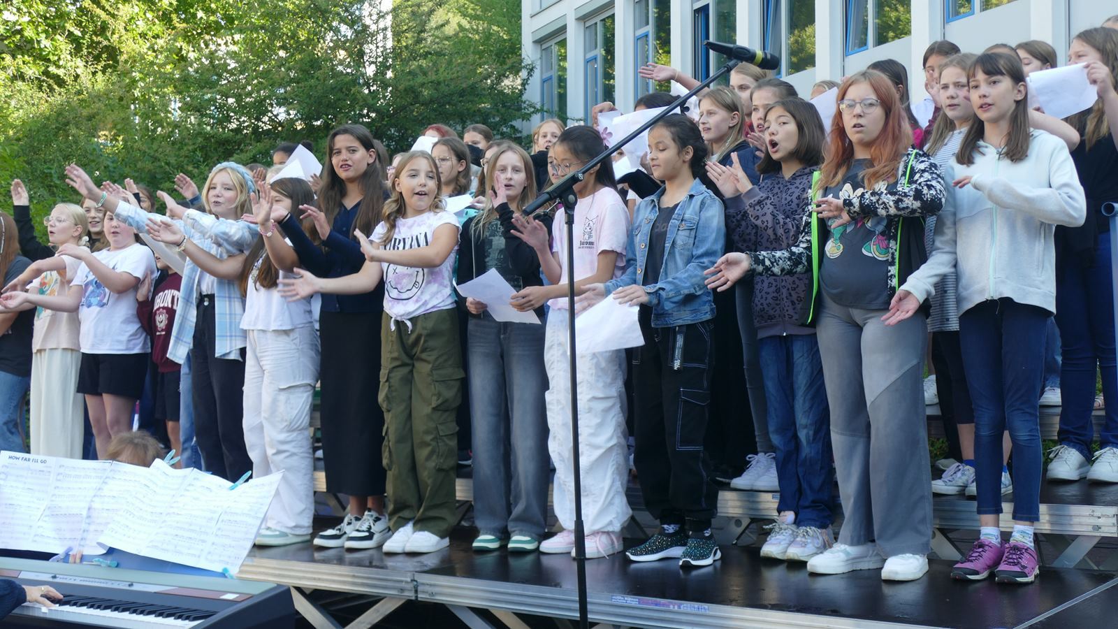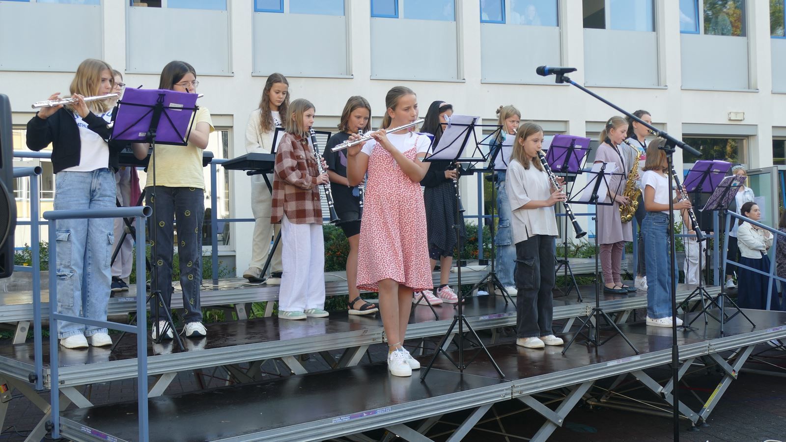Nach dem Gottesdienst in der Pilgerkirche fand die Feier der Einschulung auf dem Schulhof der SMS ihre Fortsetzung. Die Schulleiterinnen, Sr. M. Gabriele und Frau Luß, begrüßten die neuen Schülerinnen und ihre Familien. In einem Bühnenprogramm erhielten die Neuen Einblick in die musischen Wahlpflichtfächer Orchester, Chor und Bildende Kunst.