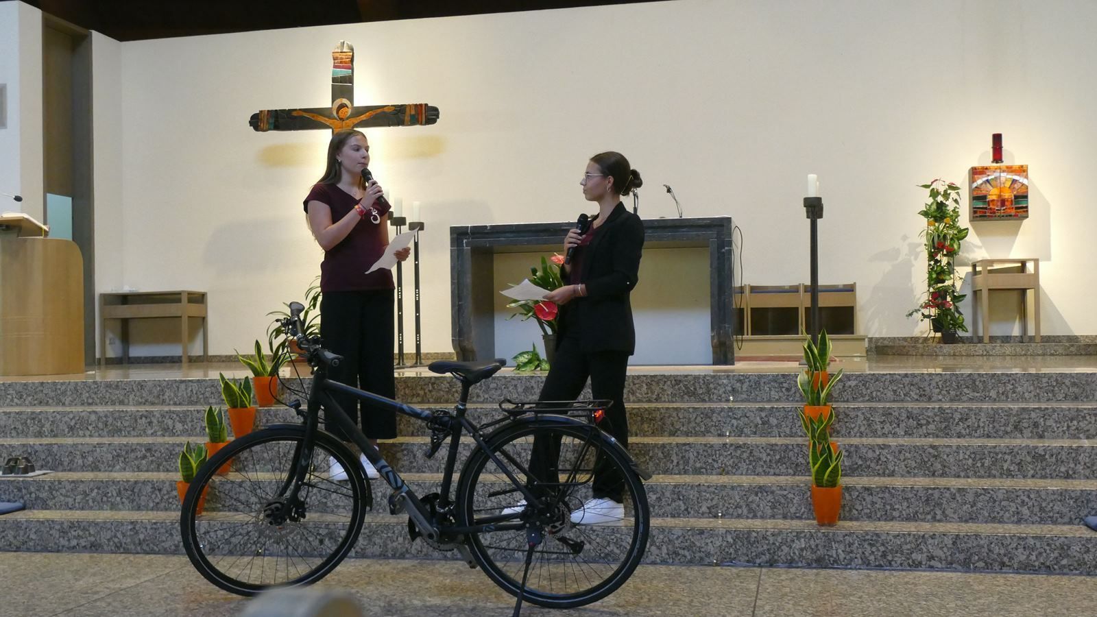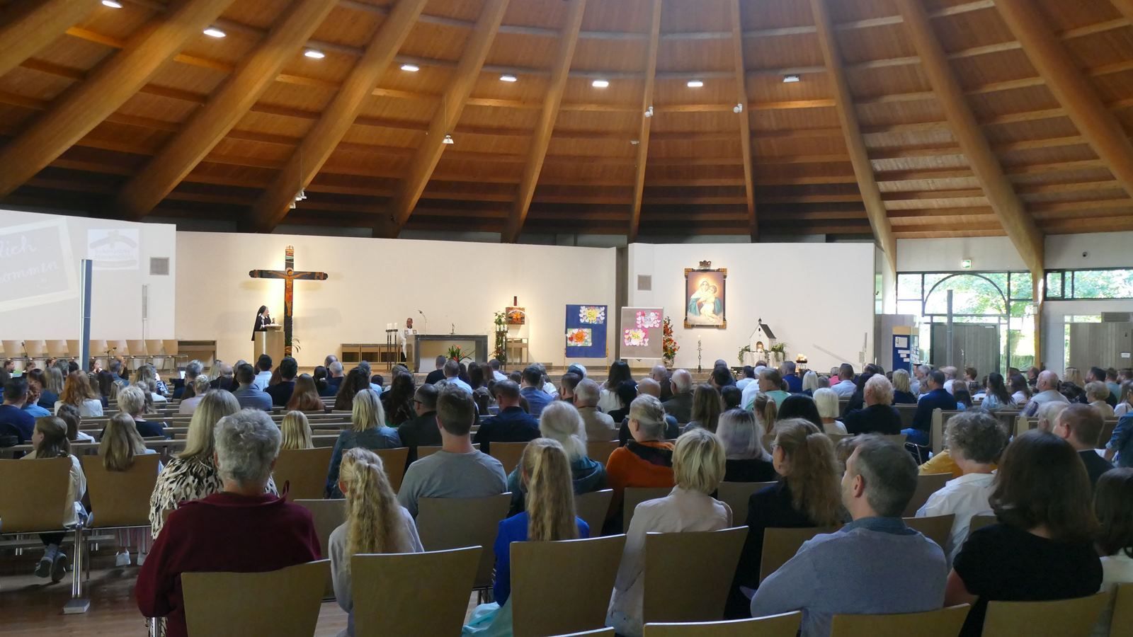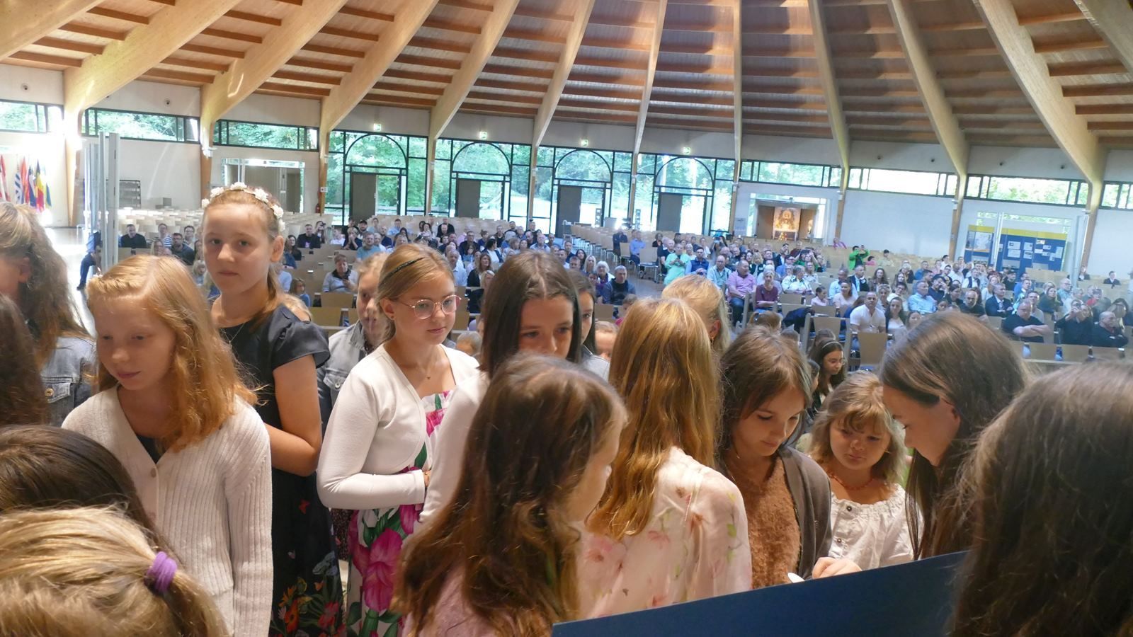 Zur Verjüngung haben vier neue Klassen mit Fünftklässlerinnen beigetragen. Für sie begann am 27.08.2024 die Schulzeit an der Marienschule. Begleitet von ihren Familien starteten sie in den neuen Lebensabschnitt mit einem Wortgottesdienst in der Pilgerkirche in Schönstatt. Neuntklässlerinnen, die auch die Paten der neuen Fünfer sind, hatten den Gottesdienst zusammen mit Frau Humberg vorbereitet und unter das Motto: „Das neue Schuljahr kommt ins Rollen" gestellt. Am Anfang kam eine Schülerin aus der Jahrgangsstufe 9 mit dem Fahrrad in die Kirche gefahren. In einem Dialog über Teile des Rades wie z.B. die Reifen, Speichen, Bremsen und Pedale, den Sattel und die Nabe gaben die Paten den Fünftklässlerinnen Tipps für einen gelingenden Start an der SMS.