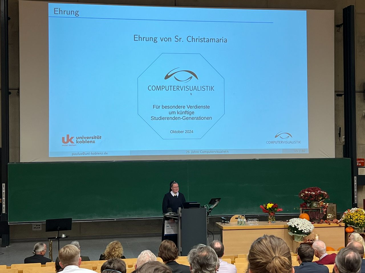 Am Freitag, den 25. Oktober 2024, wurde Sr. Christamaria im Rahmen des 25-jährigen Jubiläums der Fakultät für Computervisualistik an der Universität Koblenz geehrt. Bei einem Akademischen Festakt wurde ihr besonderer Einsatz für die Förderung junger Talente in der Informatik gewürdigt.
