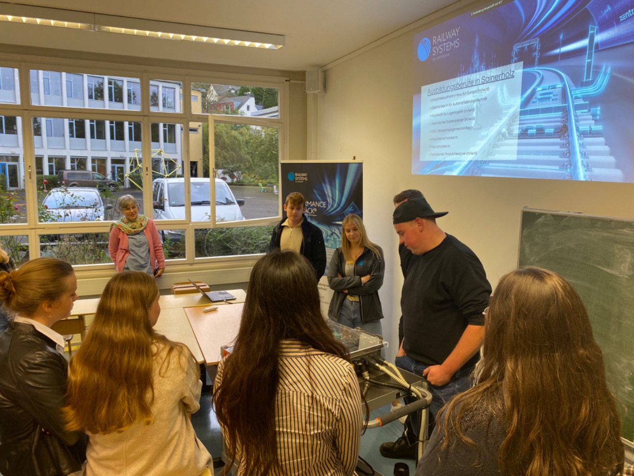 Einige Schülerinnen der Oberstufe nahmen Einblick in die vielseitige Arbeit der Firma Voestalpine Signaling aus Siershahn und Sainerholz im Westerwald. Spezialisiert auf Eisenbahn-, Diagnose- und Überwachungstechnologien sind die Mitarbeiter und Mitarbeiterinnen weltweit vor Ort an Eisenbahnsystemen tätig bzw. warten die IT. Die Vielseitigkeit der Tätigkeiten war genauso interessant wie die Tatsache, dass diese Firma fast vor unserer Haustüre liegt. Neben lebendigen Vorträgen gab es auch ein eindrucksvolles Modell, an dem die neueste Technik praktisch ausprobiert werden konnte.