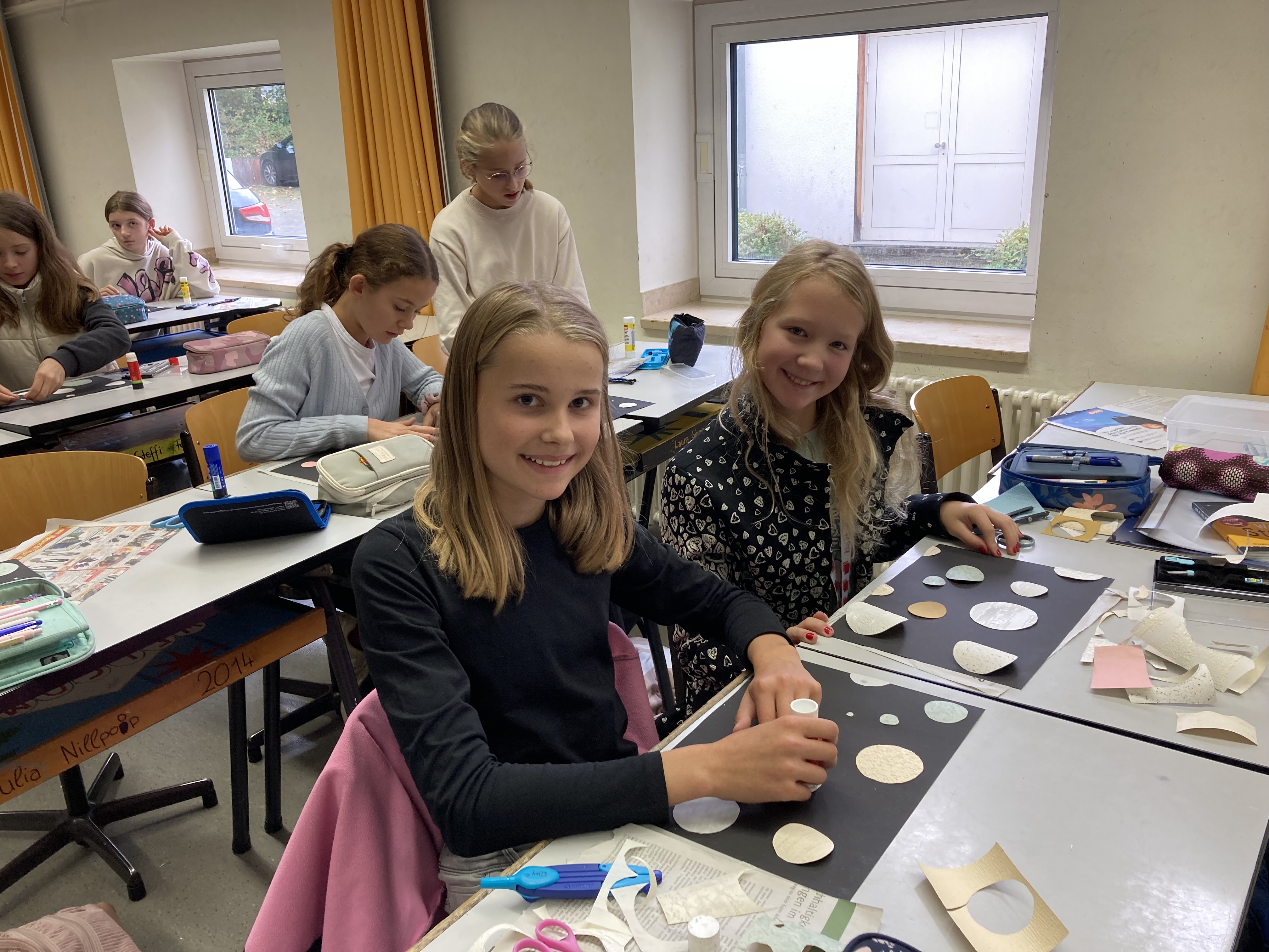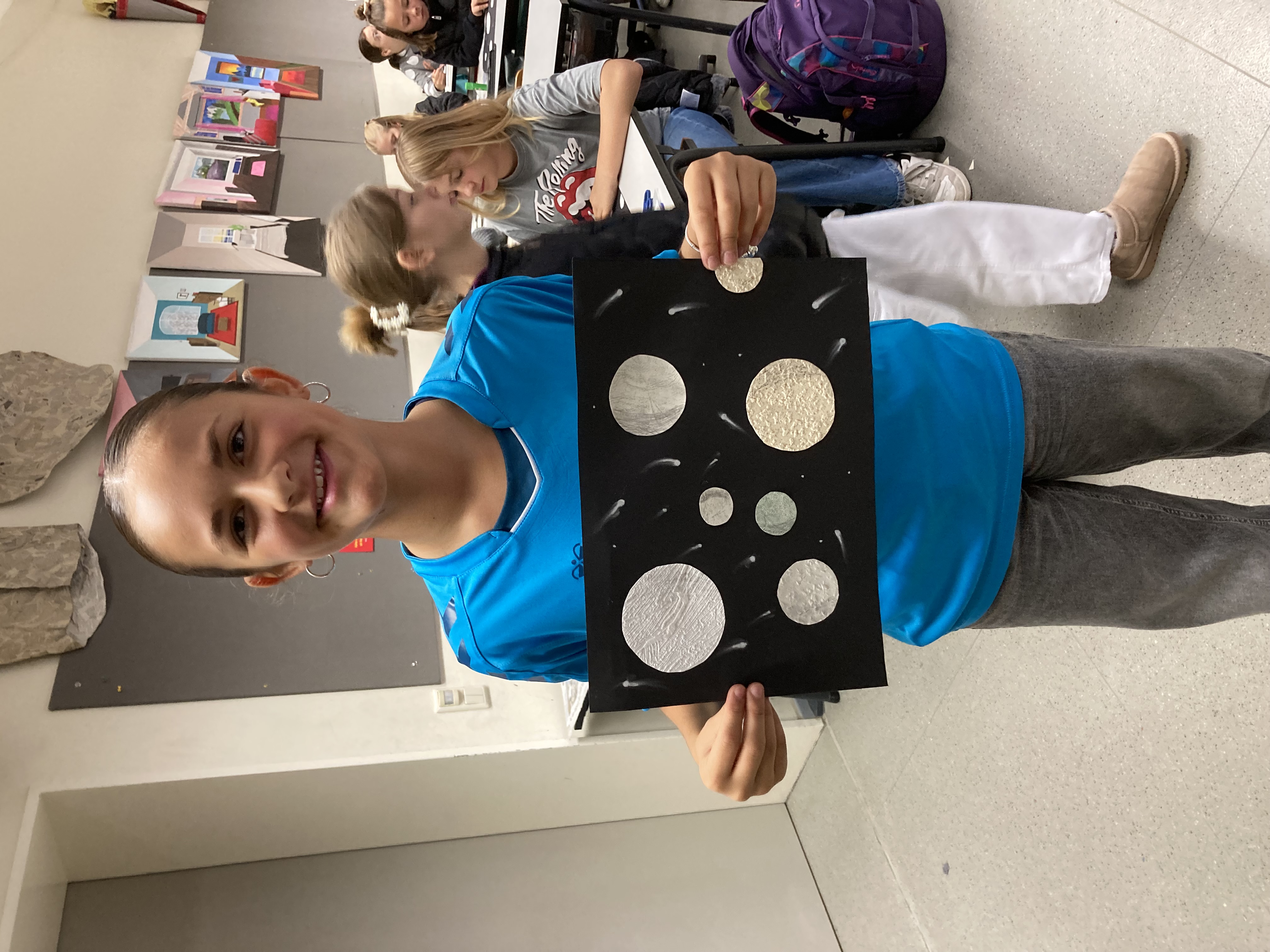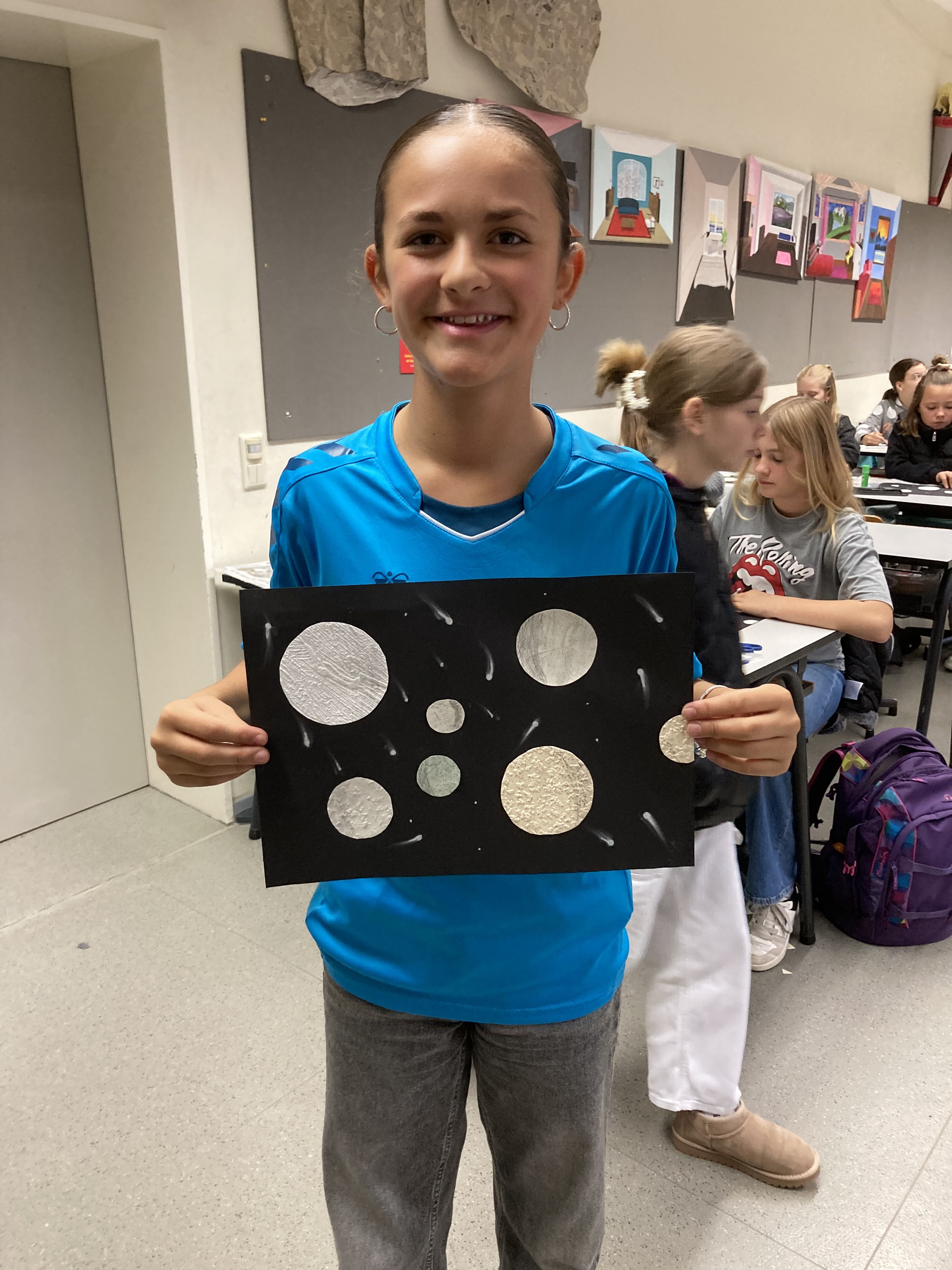 Wie unterschiedlich der sein kann, zeigt die Auswahl von Bildern der Klassen 6 a - d, die bei ihrem Astronomietag nur knapp 45 Minuten Zeit hatten um ihre fantasievollen Vorstellungen in sehenswerte Ergebnisse umzusetzen.