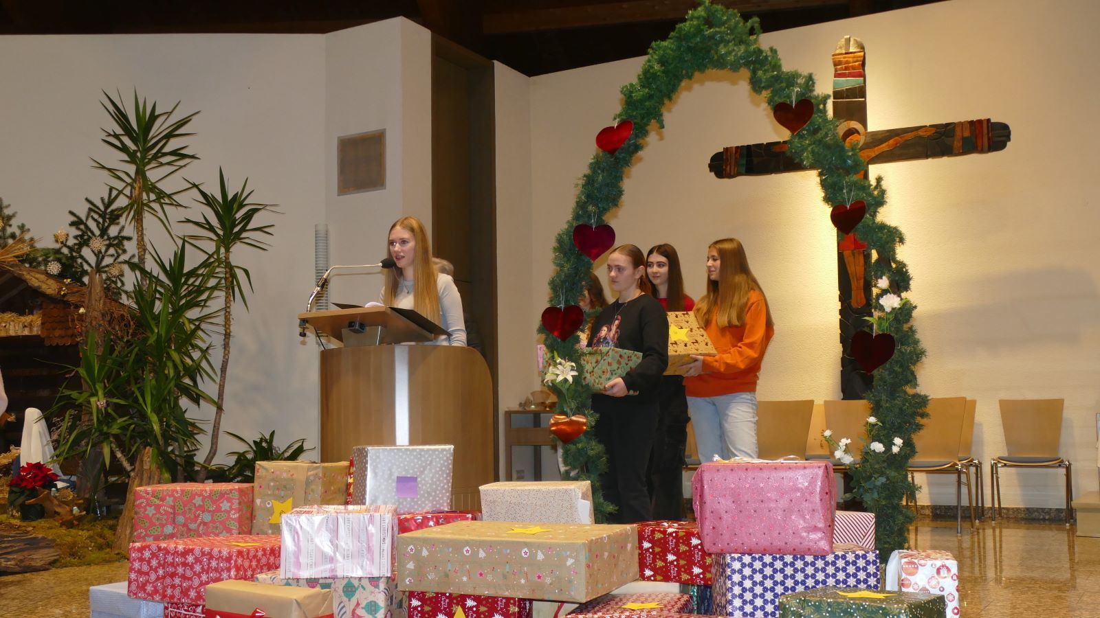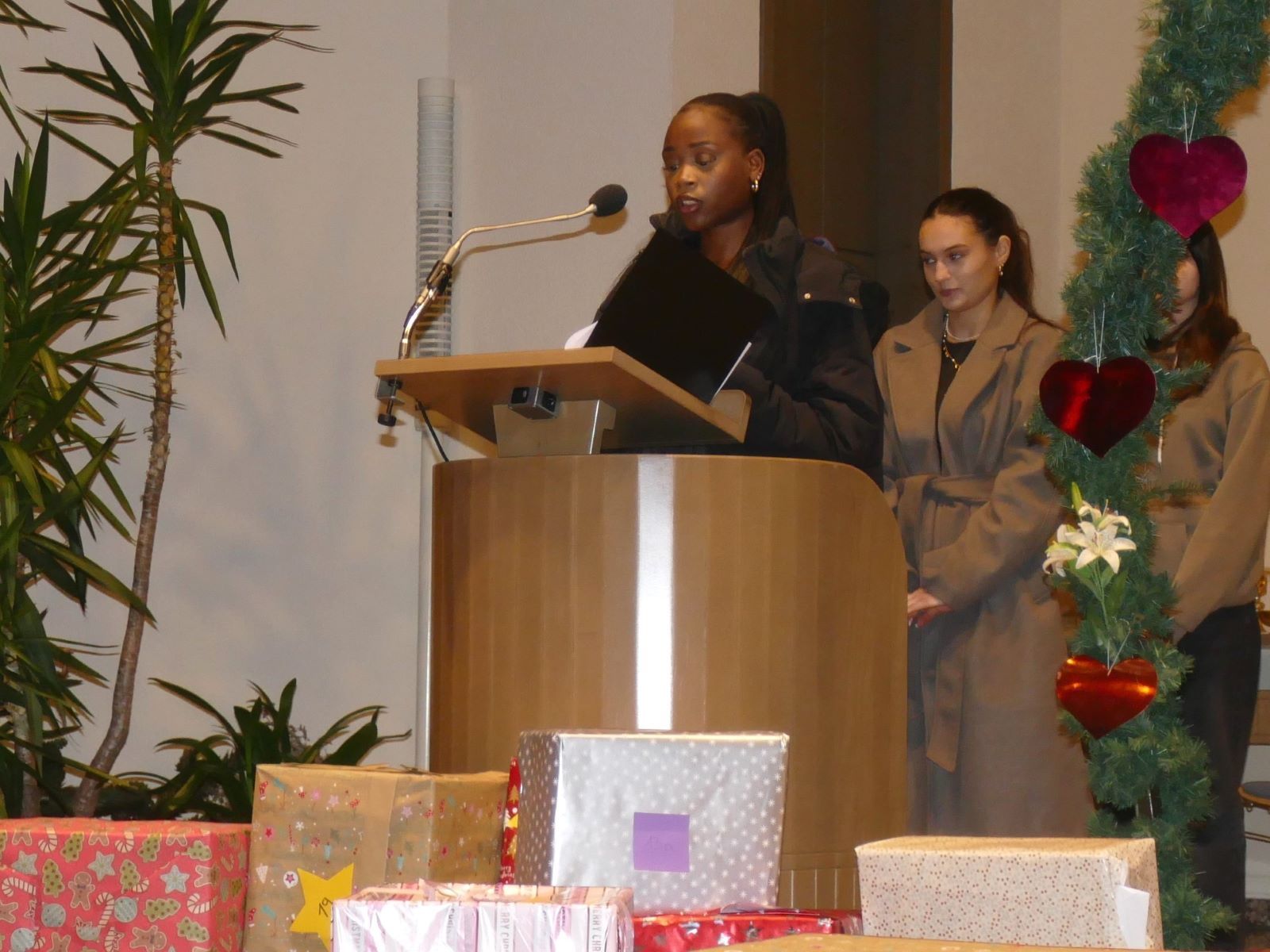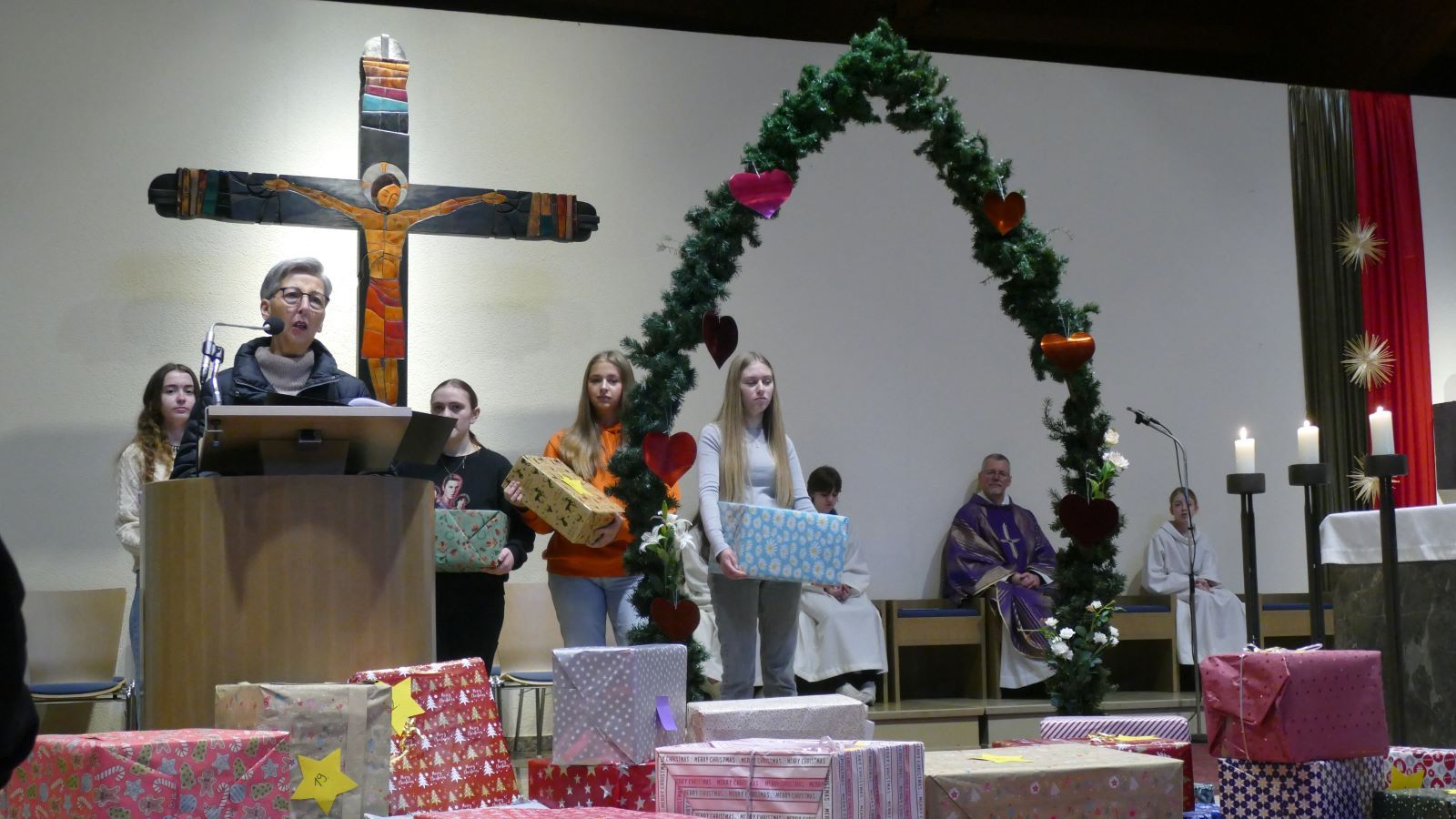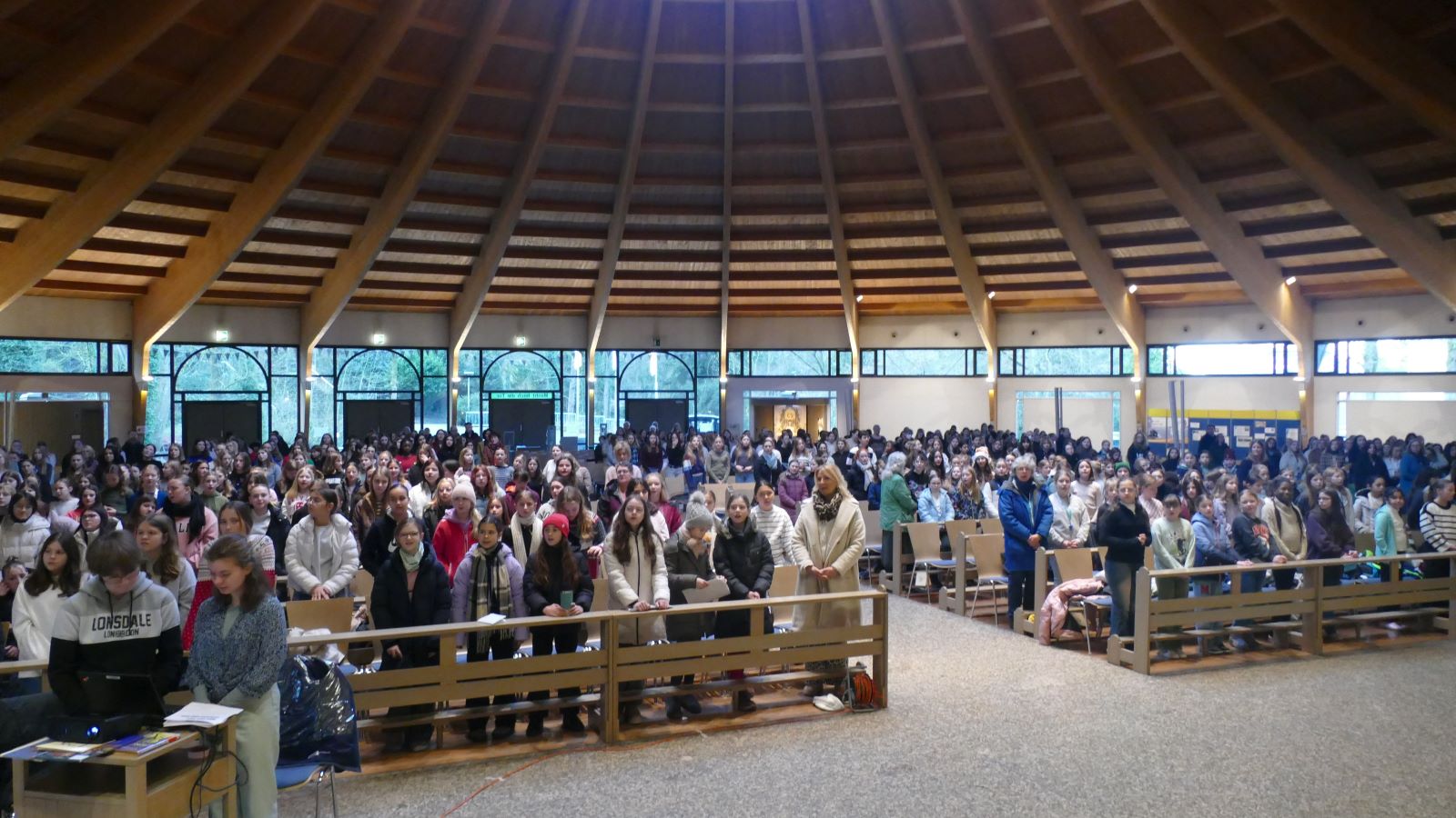 Am Ende des Gottesdienstes überreichte die SV Frau Eichenberg von Lichtzeichen e.V. mehr als 40 Pakete mit Lebensmittel, die die Klassen für schwangere Frauen gepackt hatten. Frau Eichenberg wies darauf hin, dass die Entstehung eines kleinen Menschen ein Wunder ist, das sich kein Mensch ausdenkt und auch alle Schülerinnen ein Wunder sind, das sich kein Mensch ausdenkt.