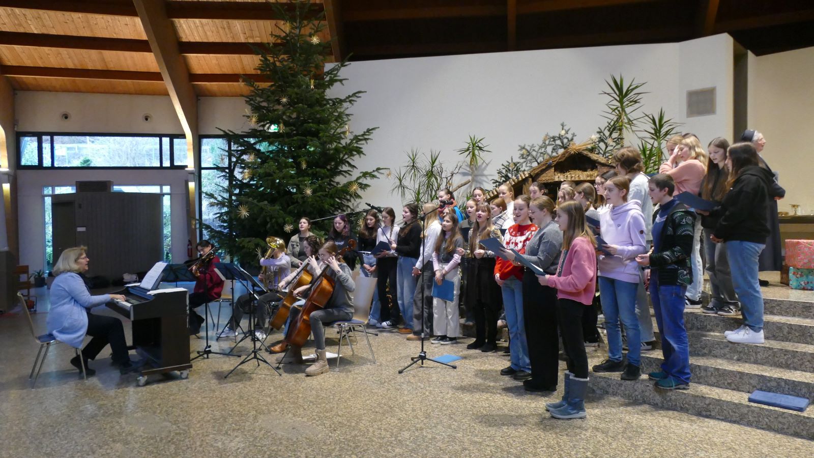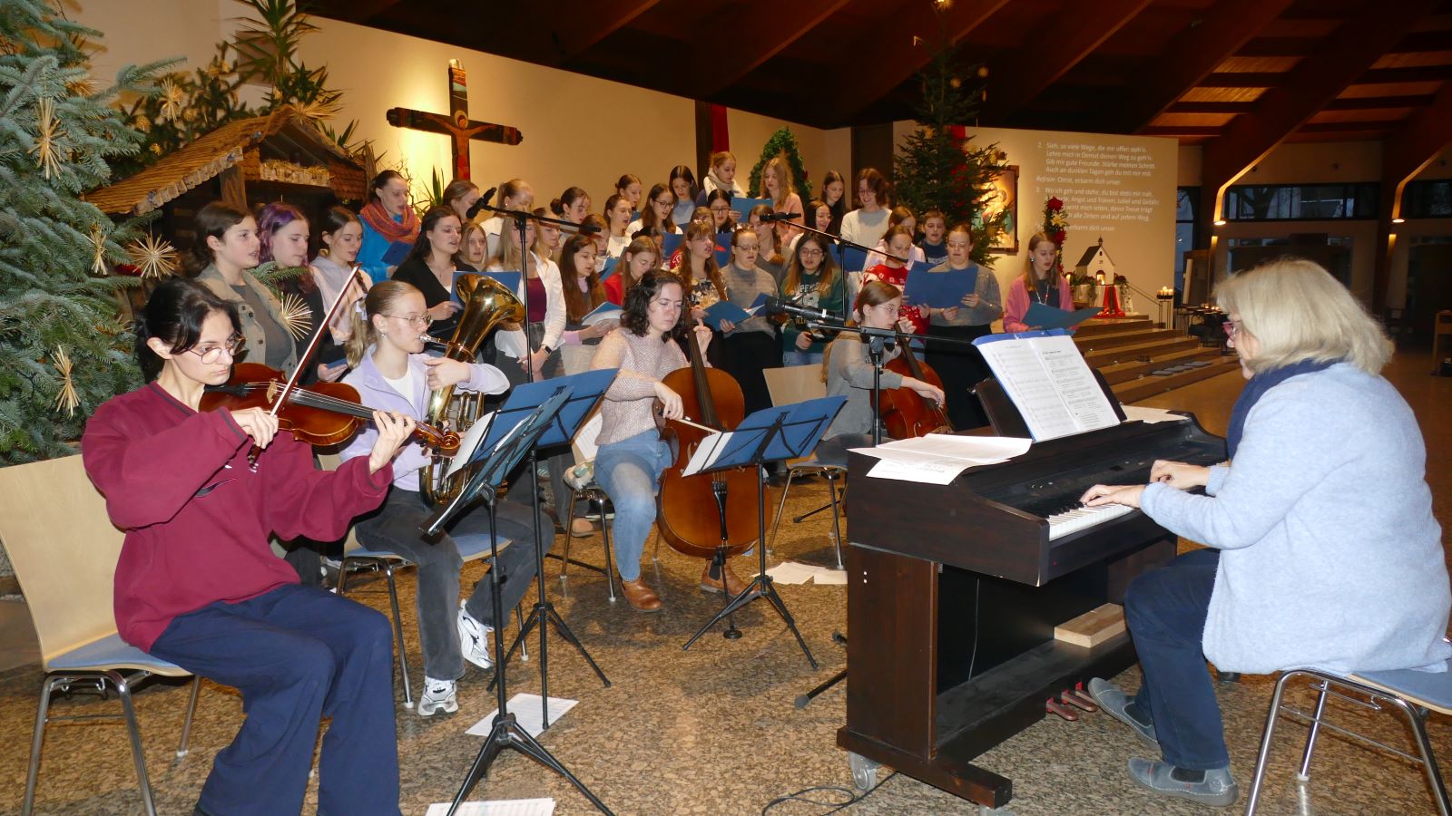 Die Weihnachtsbotschaft wurde musikalisch durch den Chor, Sängerinnen der Jahrgangsstufe und dem Orchester unter der Leitung von Frau Jocks untermalt: