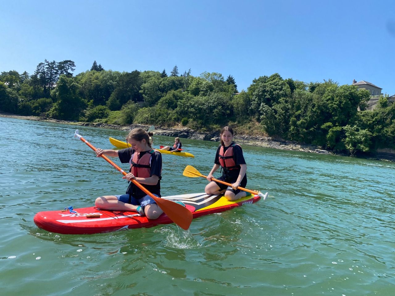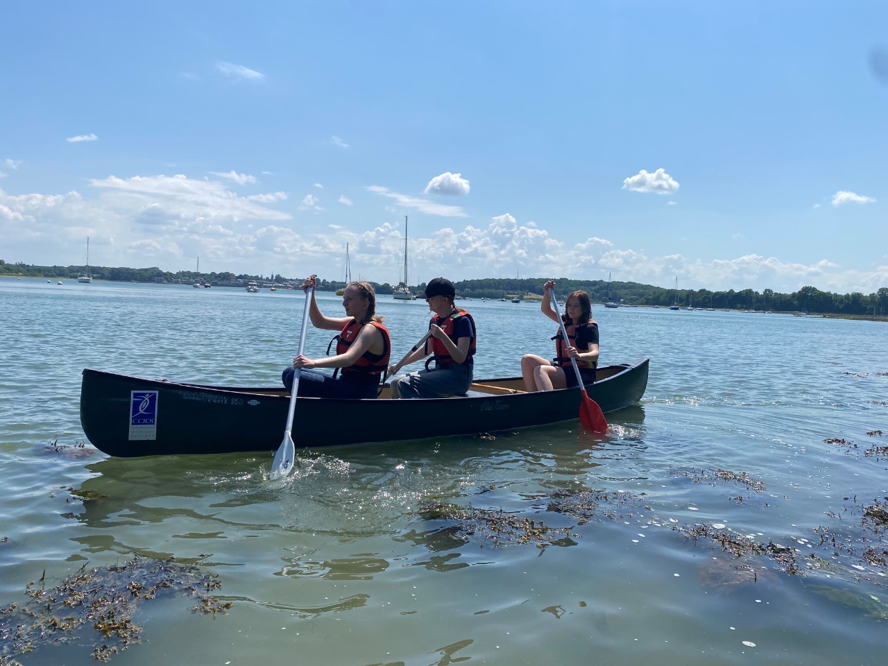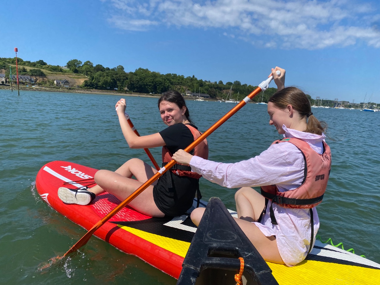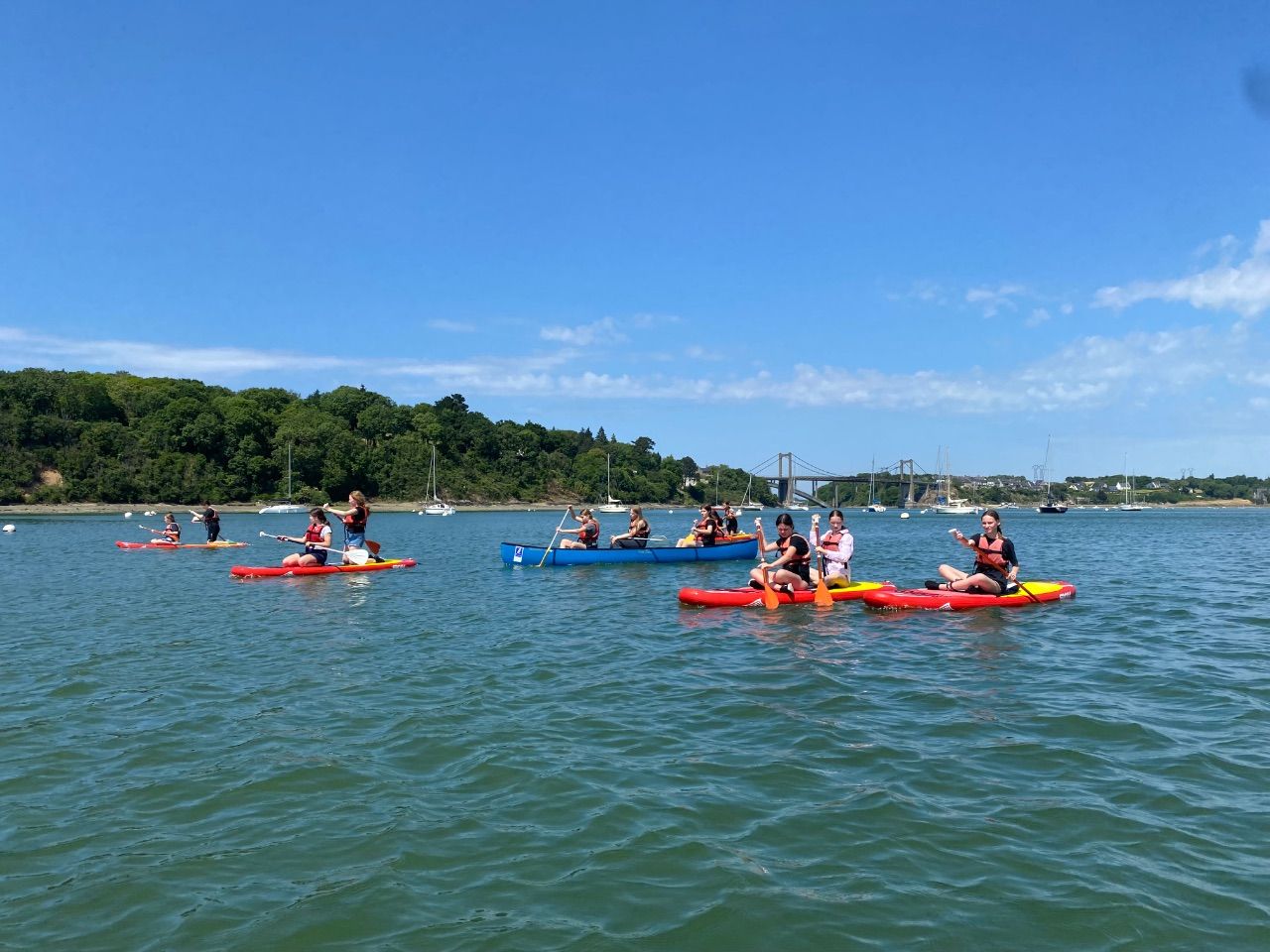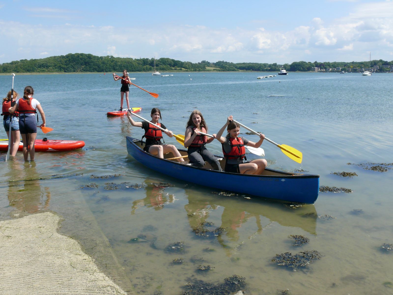 Nach dem Kulturprogramm war am Nachmittag ein sportliches Angebot angesagt. An der Rance lagen Paddelboote und Kajaks bereit. Erst ging es ins Wasser und dann auf die Boote. Zwei Stunden lang vergnügten sich die Schülerinnen bei Sonne und Wind und zum Teil im Salzwasser.