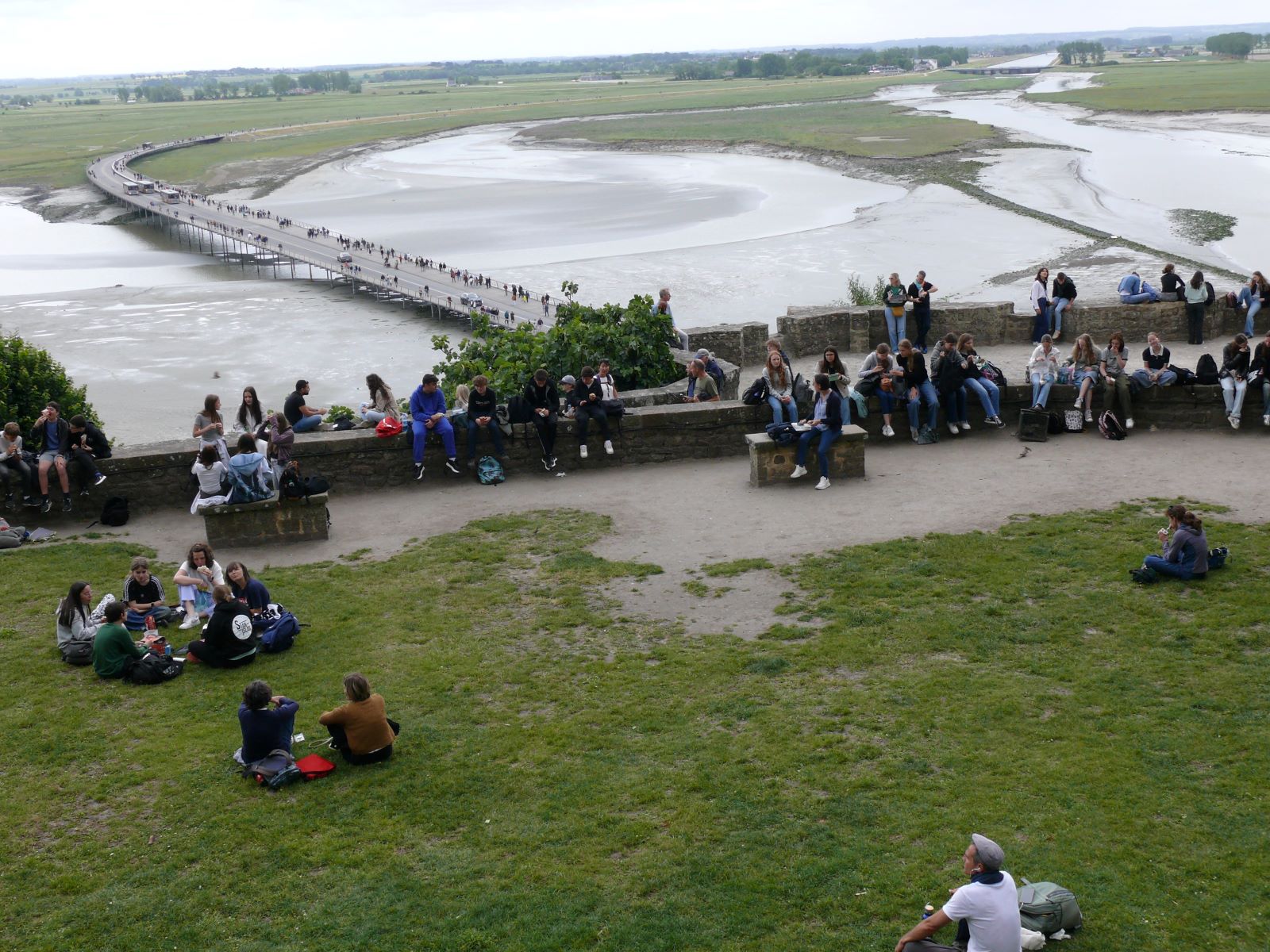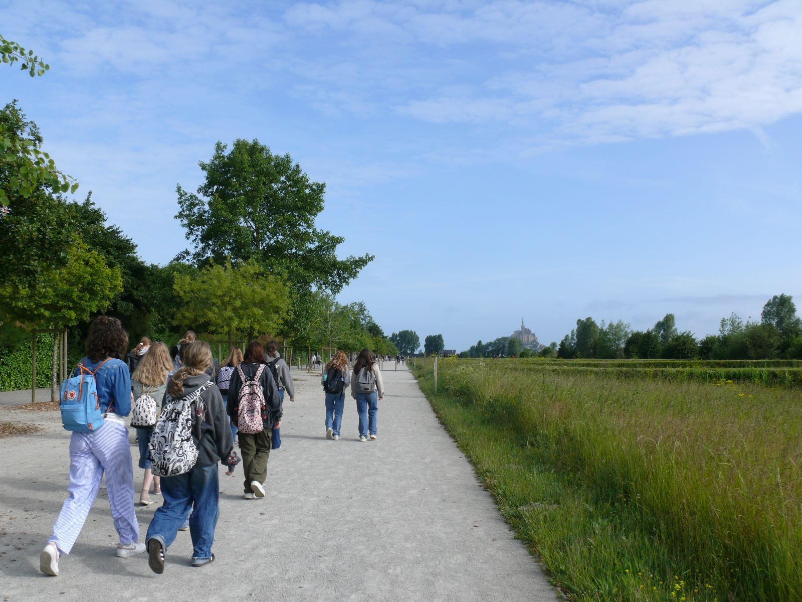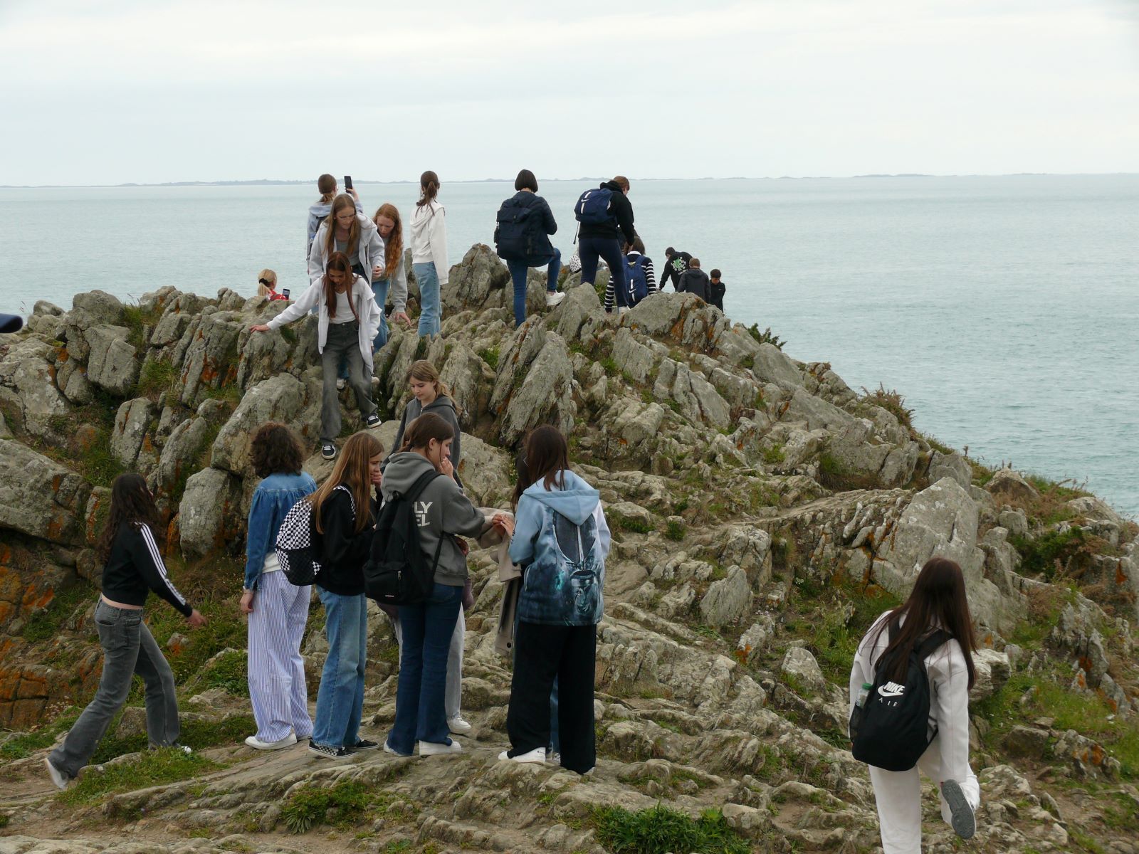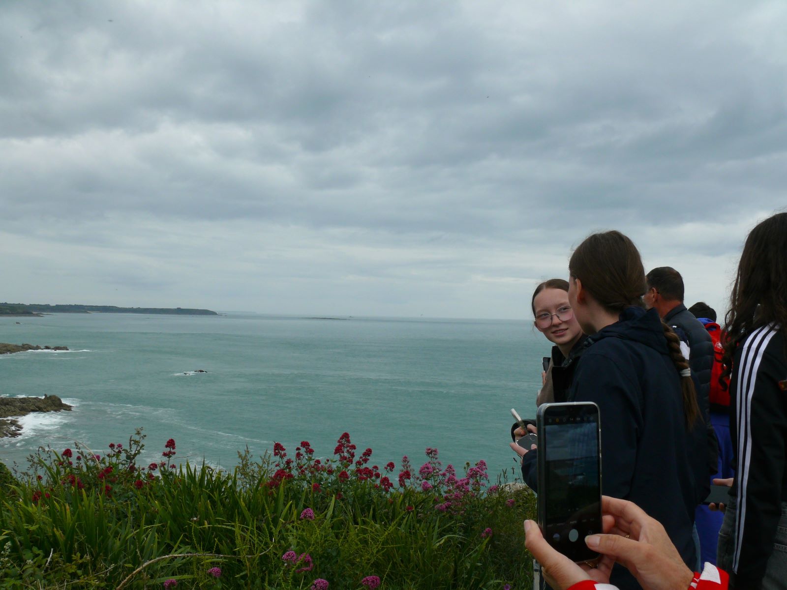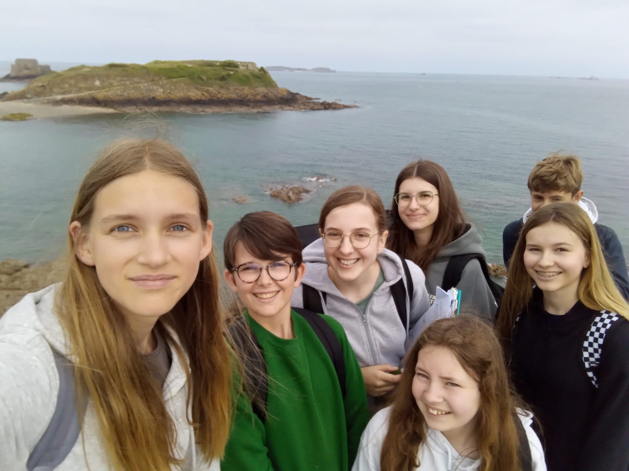 Ein „must-have“ ist ein Pilgermarsch zum Mont Saint Michel, genannt „la merveille“ – das Wunder. Der Mont-Saint-Michel und seine Bucht ist eine von der UNESCO gelistete Stätte des Weltkulturerbes in Frankreich. Sie umfasst die Felseninsel Mont Saint-Michel mit der gleichnamigen Abtei und der umliegenden Meeresbucht im Ärmelkanal vor der Küste der Normandie. In die im 8. Jahrhundert beginnende Geschichte und Architektur des Klosterbergs, der zu den meistbesuchten Sehenswürdigkeiten Frankreichs gehört, ließen sich die Schülerinnen durch eine interaktive Führung via Tablet einführen. So hatte jede die Möglichkeit, in ihrem Tempo und mit ihren Interessensschwerpunkten die Weltkulturstätte zu entdecken und das Panorama auf seine Bucht und das Meer zu genießen. Die Gezeiten ließen den Mont-Saint-Michel zur Insel werden. Nach einem Picknick in einem in der Felsenanlage angelegten Garten brach die Gruppe nach Cancale auf. An der Pointe du Gourin, einer Landzunge an der Côte d’Émeraude, unternahmen die Schülerinnen und Schüler eine Wanderung und erklommmen die Klippen aus Plutonitgestein, die steil zum Wasser hin abfallen und eine Höhe von bis zu 50 Metern aufweisen.