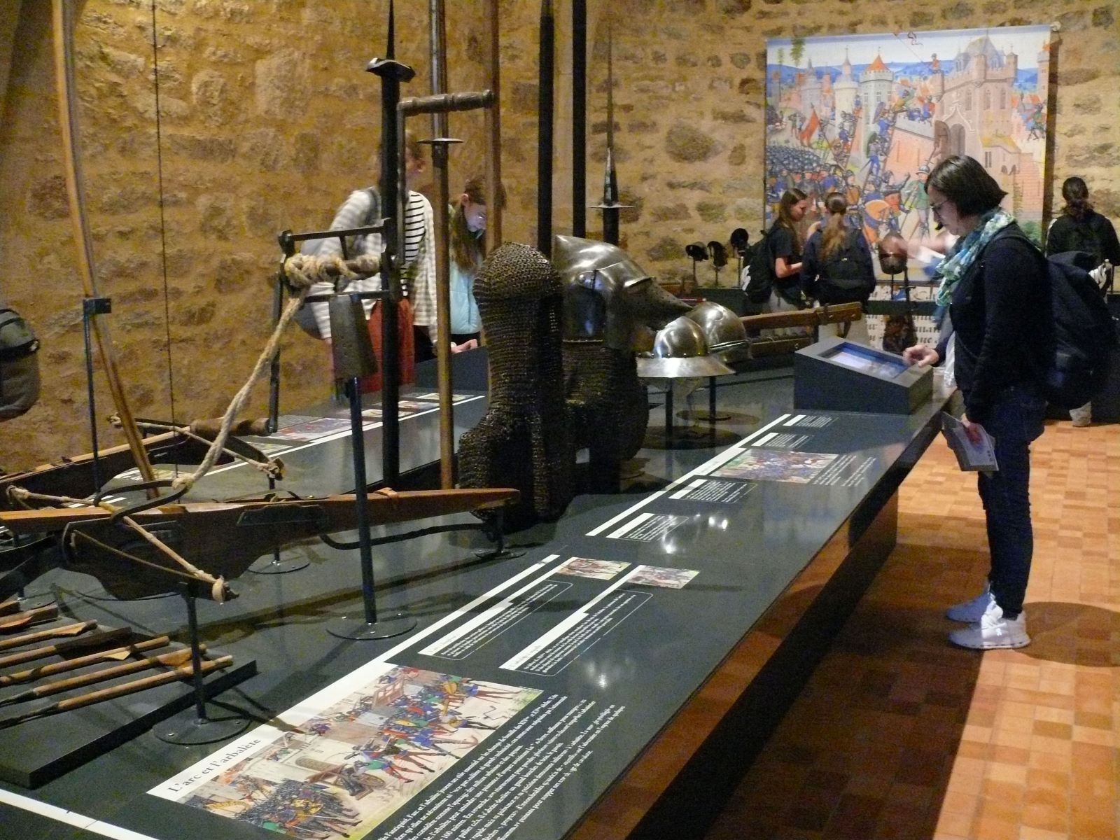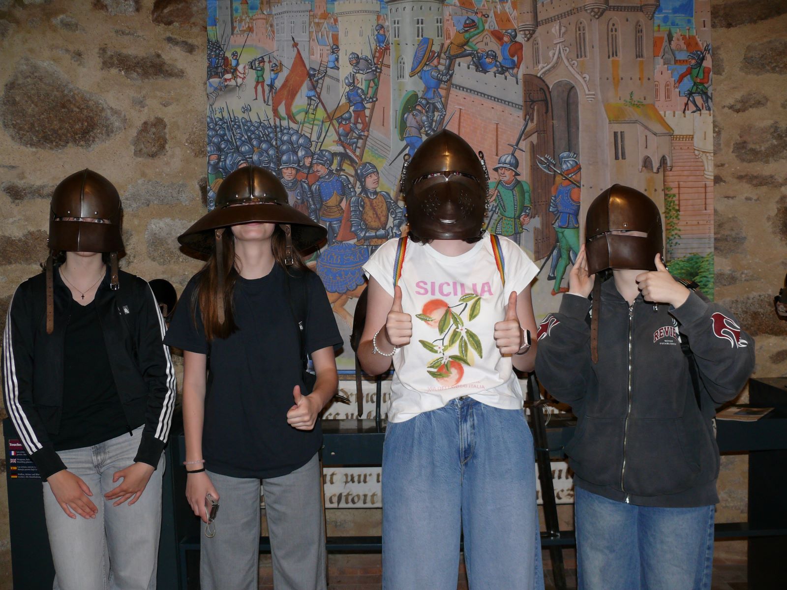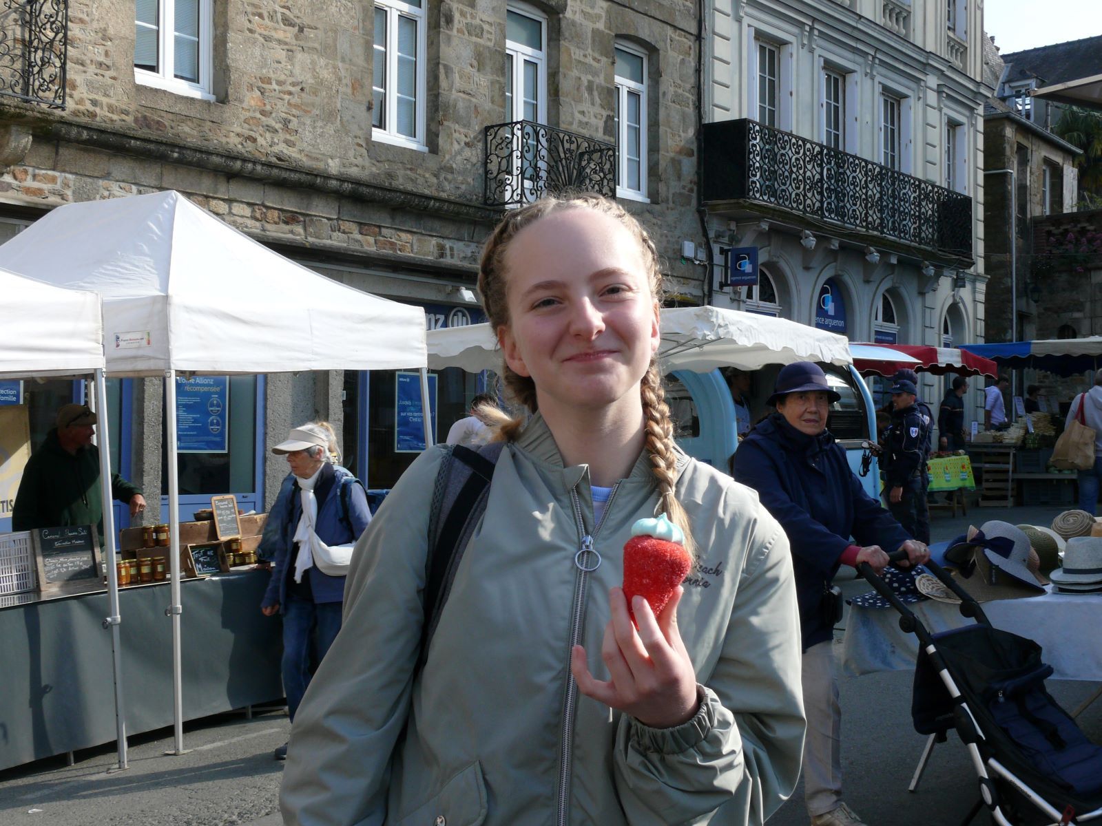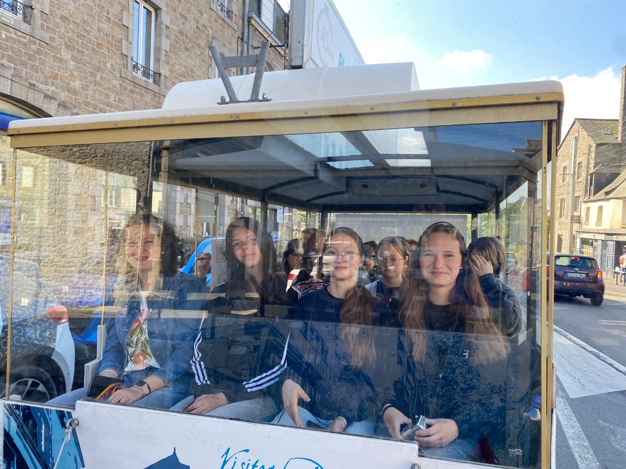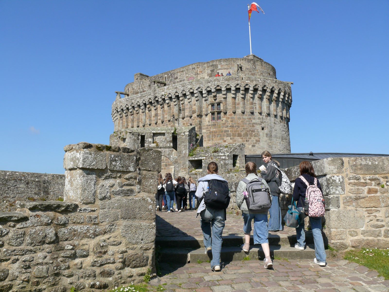 Nach den ersten Tagen in der Bretagne, in denen rund um die Uhr Französisch gehört und gesprochen wurde, war eine kleine Auszeit willkommen. Die deutsche Gruppe machte einen Tagesausflug nach Dinan, eine malerisch schöne mittelalterliche Stadt an der Rance. Dort gibt es donnerstags immer einen großen bretonischen Wochenmarkt, auf dem die Schülerinnen bei herrlichem Sonnenschein flanierten und die eine oder andere Spezialität der Region ausprobierte. In einem „petit train touristique“ bewegte sich die Gruppe anschließend durch die Ober- und Unterstadt und erhielt wahlweise über Kopfhörer eine Führung auf Französisch, Englisch, Deutsch oder Niederländisch. Am Nachmittag besichtigen die Schülerinnen das neu eröffnete aufwändig restaurierte „Château de Dinan“. Hintergrundwissen zu der Burganlage aus dem 14. Jahrhundert mit ihren großen Türmen erhielten die Schülerinnen über große Infotafeln und viel Bildmaterial sowie über einen Film. Sie erfuhren etwas über die Herzöge der Bretagne, die Geschichte der Stadt und die Nutzung der Räume in der Burg.
