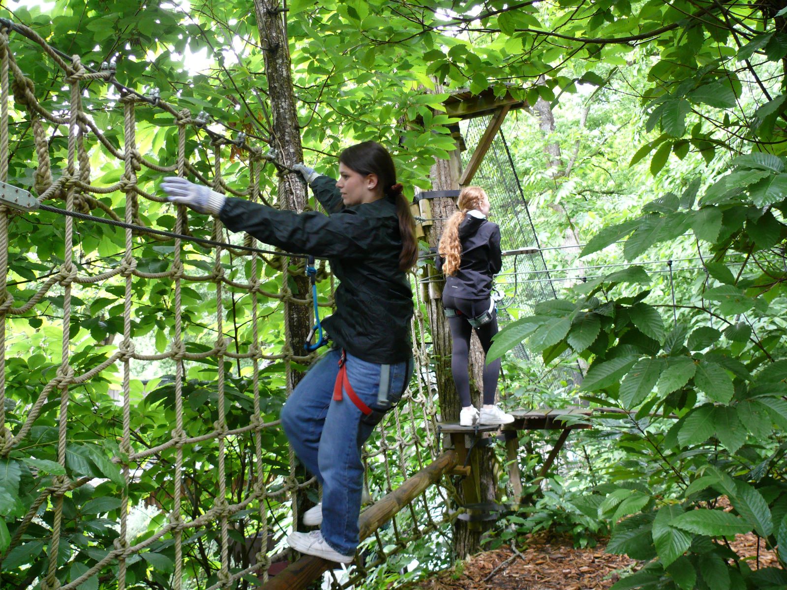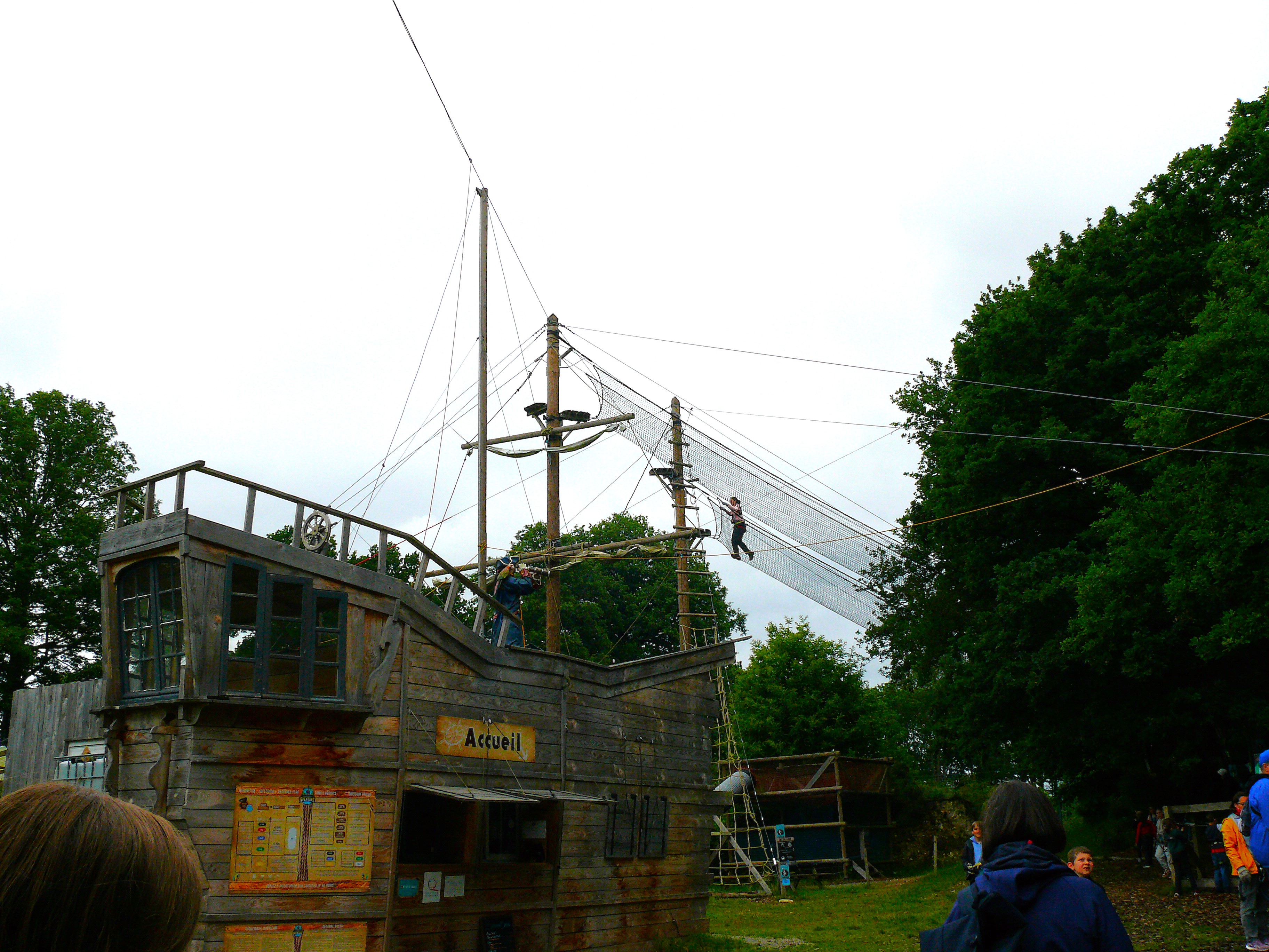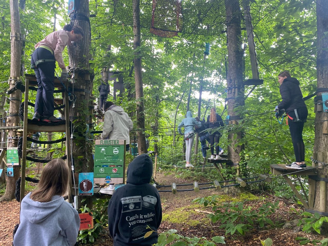 Der Höhepunkt des zweiten Tages war die Fahrt zum Kletterwald „Corsaire Anventure“ in Saint-Père. Dort standen über ein Dutzend Parcours zur Auswahl. Nach der Einführung und einem Probeklettern ging es für alle hoch hinaus. Ein besonderes Erlebnis waren die außergewöhnlich langen Seilbahn-Parcours. So manche(r) wagte während der Stunden im Kletterwald mehr, als er sich anfangs zugetraut hatte.