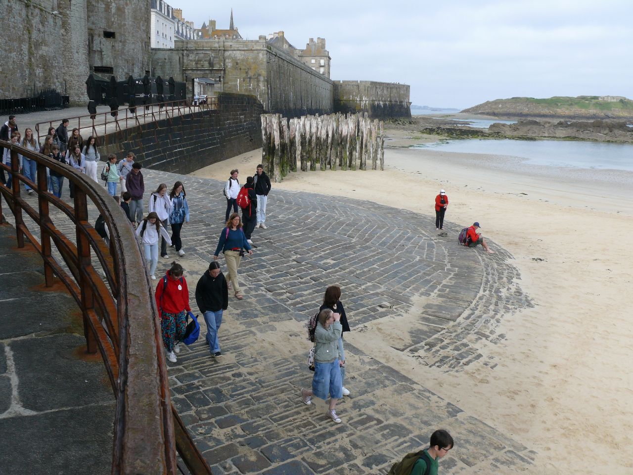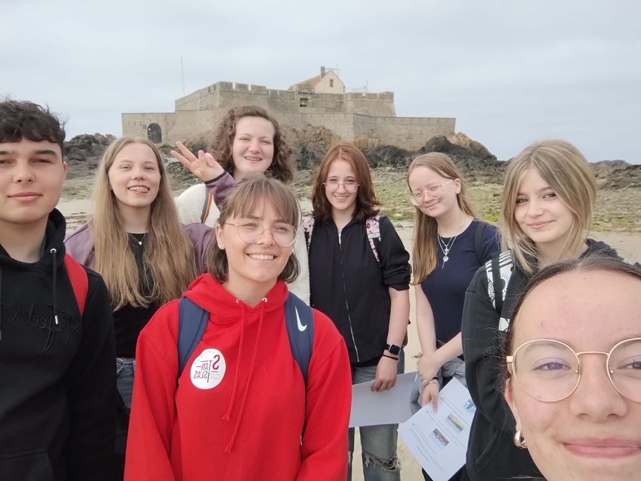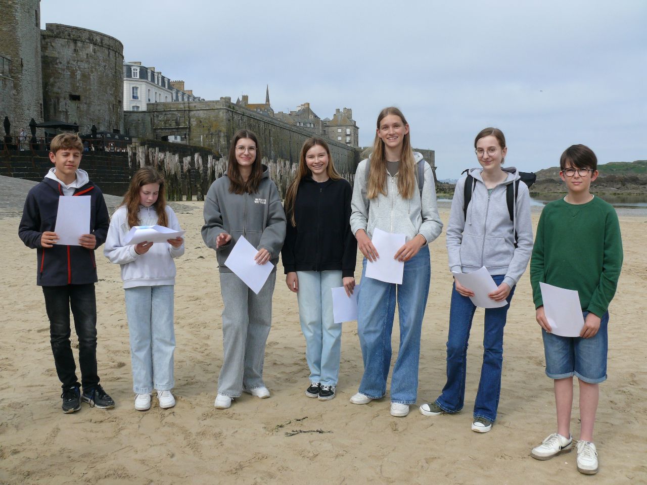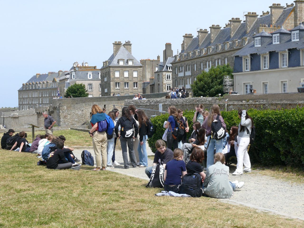 Wenn man schon in der Bretagne weilt und ein Sonnentag gemeldet ist, dann sollte man ans Meer fahren. Die deutschen und französischen Schülerinnen und Schüler verbrachten den Tag in St. Malo, der legendären Korsaren-Stadt. Am Vormittag stand „nettoyage de la plage“, Strandreinigung, auf dem Programm. Als positive Erfahrung konnte verzeichnet werden, dass der Strand nicht zugemüllt war. Doch Glasscherben, Plastik- und Aluminiumabfälle etc. fand man dennoch. Die französische Kollegin des Collège, die den Ausflug begleitete, ließ die Schülerinnen und Schüler schätzen, wie lange es dauert, bis die Fundstücke verrotten. Es gab Erstaunen und Betroffenheit angesichts der Fakten – Glasflaschen: 4000 Jahre, Plastikflaschen: 1000 Jahre, Sardinenbüchsen: 500 Jahre, Plastiktüten: 400 Jahre, Cola-Dosen: 200 Jahre, Zigarettenstummel: 2 Jahre …