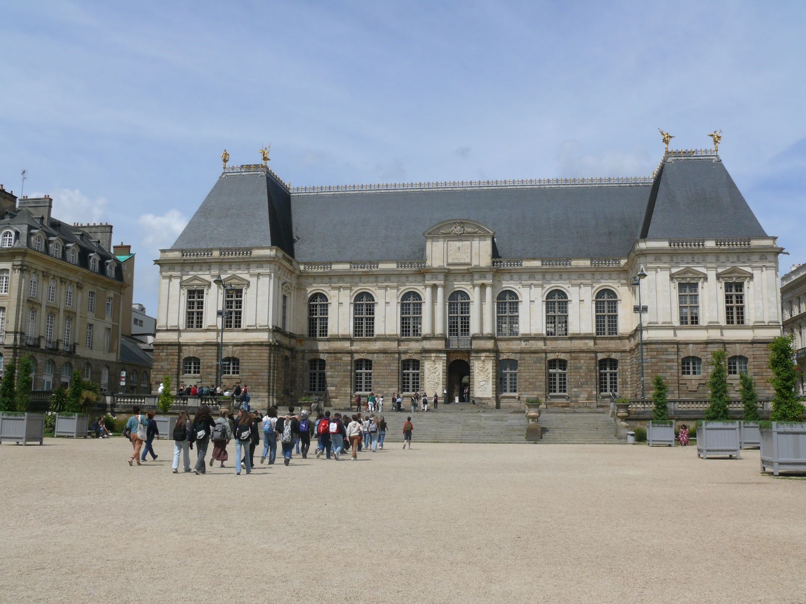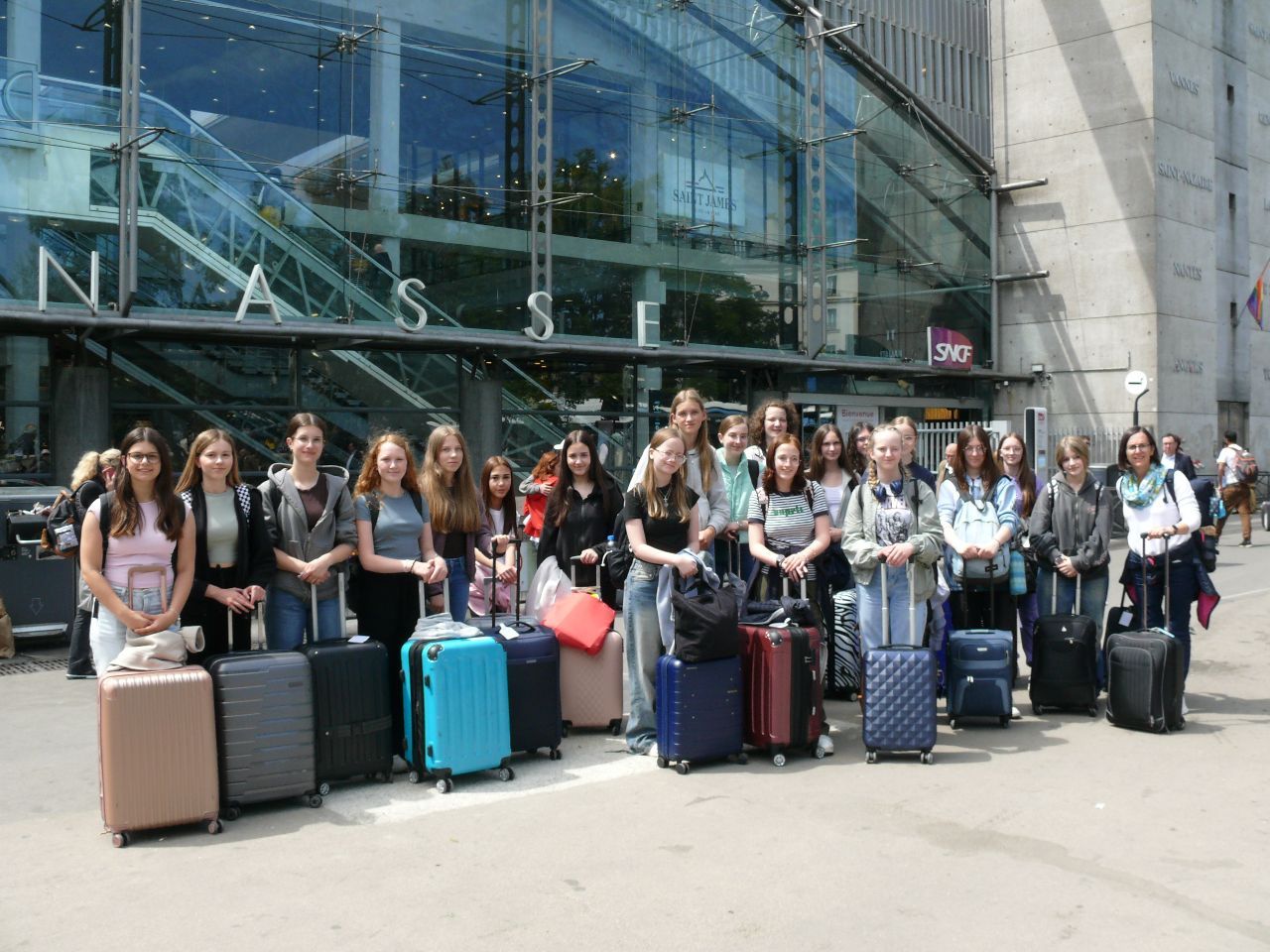 Um 5.45 traf sich die Reisegruppe vor der Marienschule. Das erste Gruppenfoto wurde vor dem Kölner Dom gemacht. In Köln stiegen alle den Thalys „Eurostar“ Richtung Paris Nord ein. In Frankreichs Hauptstadt angekommen nahmen sie die Metro und fuhren 14 Stationen quer durch Paris bis zum Bahnhof Montparnasse. Auch hier, mit Blick auf die „Tour Montparnasse“, wurde ein Gruppenbild aufgenommen. Mit dem TGV fuhren die Schülerinnen weiter bis nach Saint-Malo. Die letzte Etappe bis nach Plouër sur Rance legten sie im Bus zurück. Dort warteten die französischen Austauschschülerinnen und Schüler des Collège Saint Stanislas nach Schulschluss um 16.45 bereits. Dieser Moment der ersten Begegnung ist immer spannend und aufregend, ebenso wie der erste Abend in den Gastfamilien.