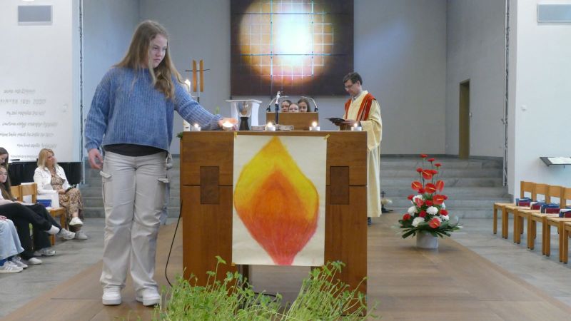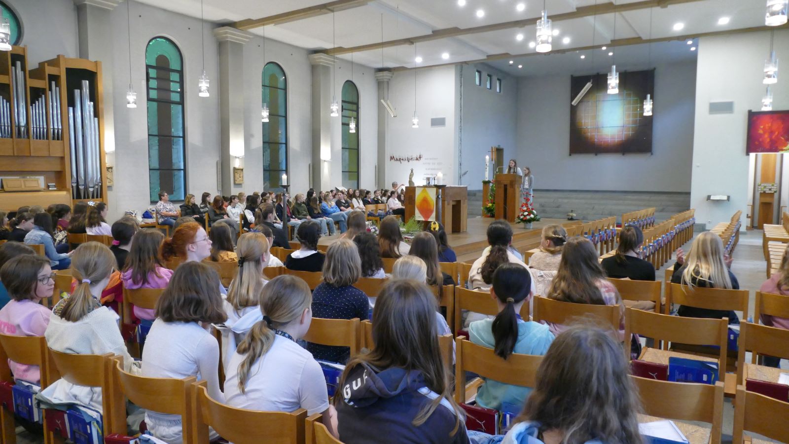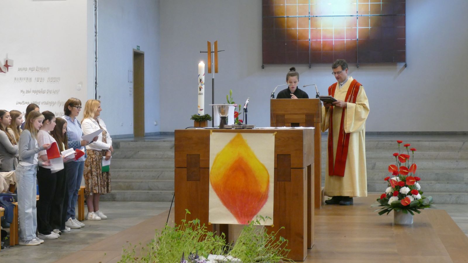 Am letzten Schultag vor Pfingsten gestaltete die 6a zusammen mit ihrer Religionslehrerin Frau Fölbach einen pfingstlichen Stufengottesdienst in die Pallottikirche. In Liedern, die Frau Blatt am Flügel begleitete, Bibeltexten, Gebeten und Meditationen wurde den Schülerinnen der 5. und 6. Klassen nähergebracht, was sich vor 2000 Jahren an Pfingsten in Jerusalem ereignet hat und wie der Heilige Geist heute in der in der Welt, in der Gemeinschaft und in jedem Einzelnen wirken kann und will.