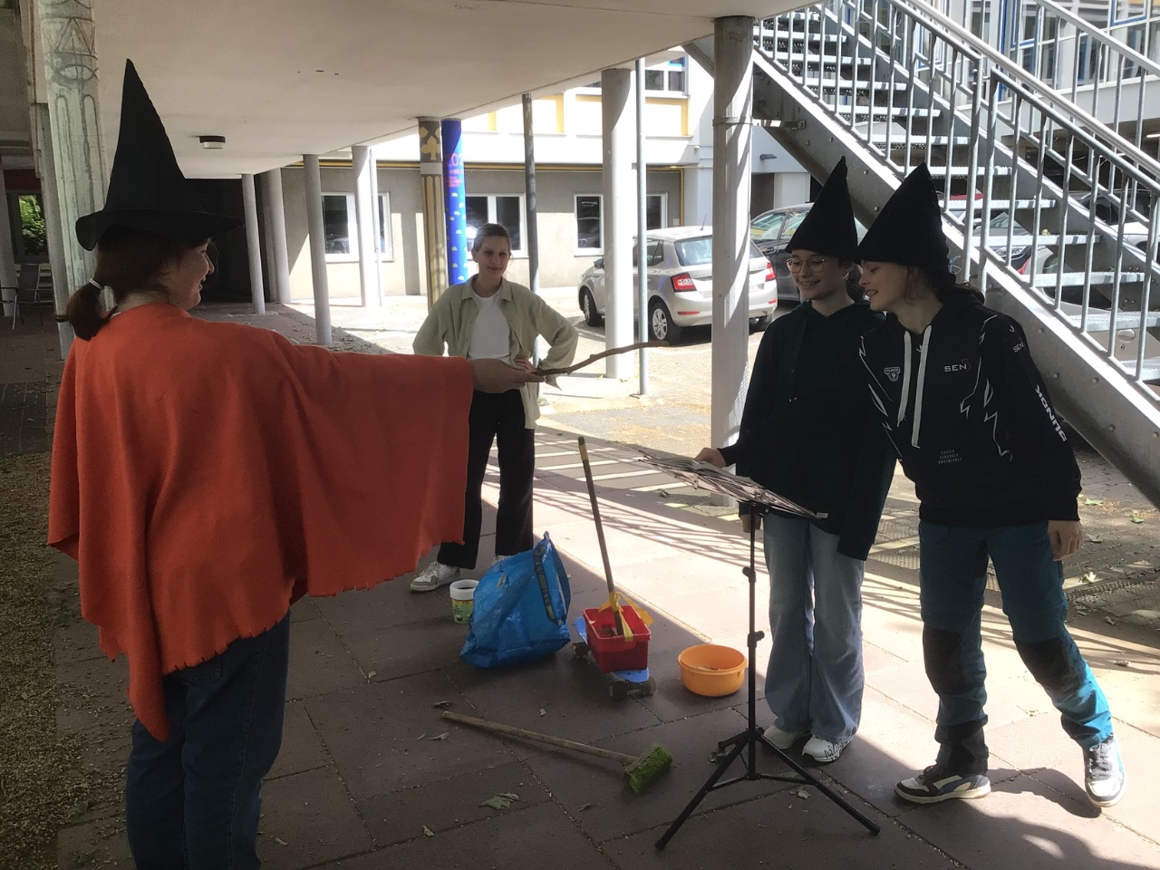 Im Rahmen der Unterrichtseinheit zu Balladen haben die Schülerinnen der Klasse 7c bei Frau Haas vor Augen und in die Ohren geführt, wie lebendig solche Texte sein können. So stürzte nicht nur der Zug aus „Die Brück‘ am Tay“ in einem umgebauten Pappkarton und mit ganz viel Equipment in seinen Untergang, sondern es lief auch ein Sensenmann begleitet von gruseliger Klaviermusik und klappernden Schlüssel für „Was war‘s“ über den Schulhof - als wären der Erlkönig und die Gestalten aus dem Moor nicht schon erschreckend genug?!