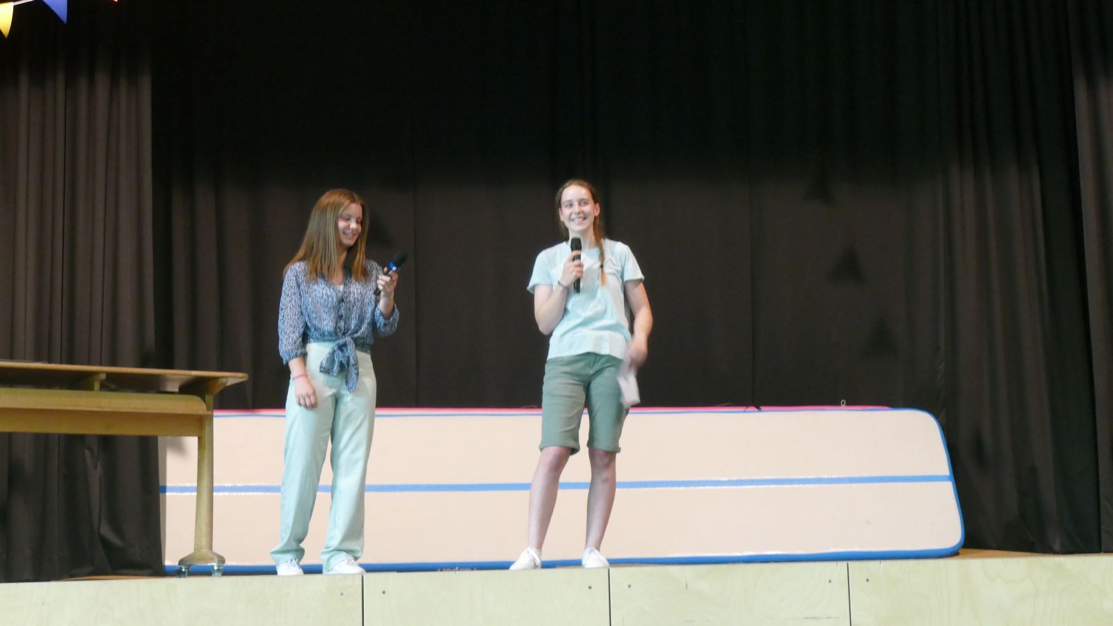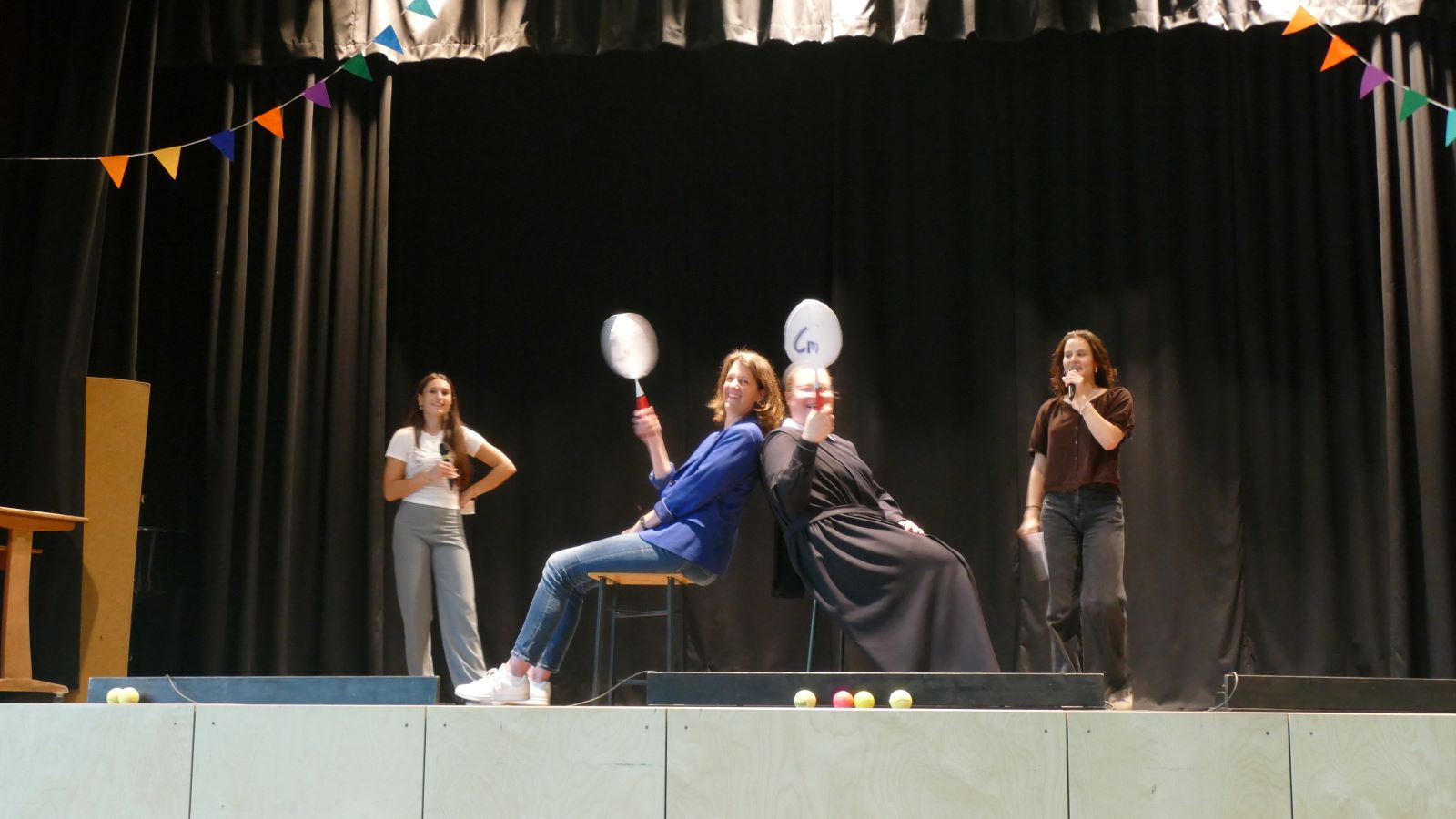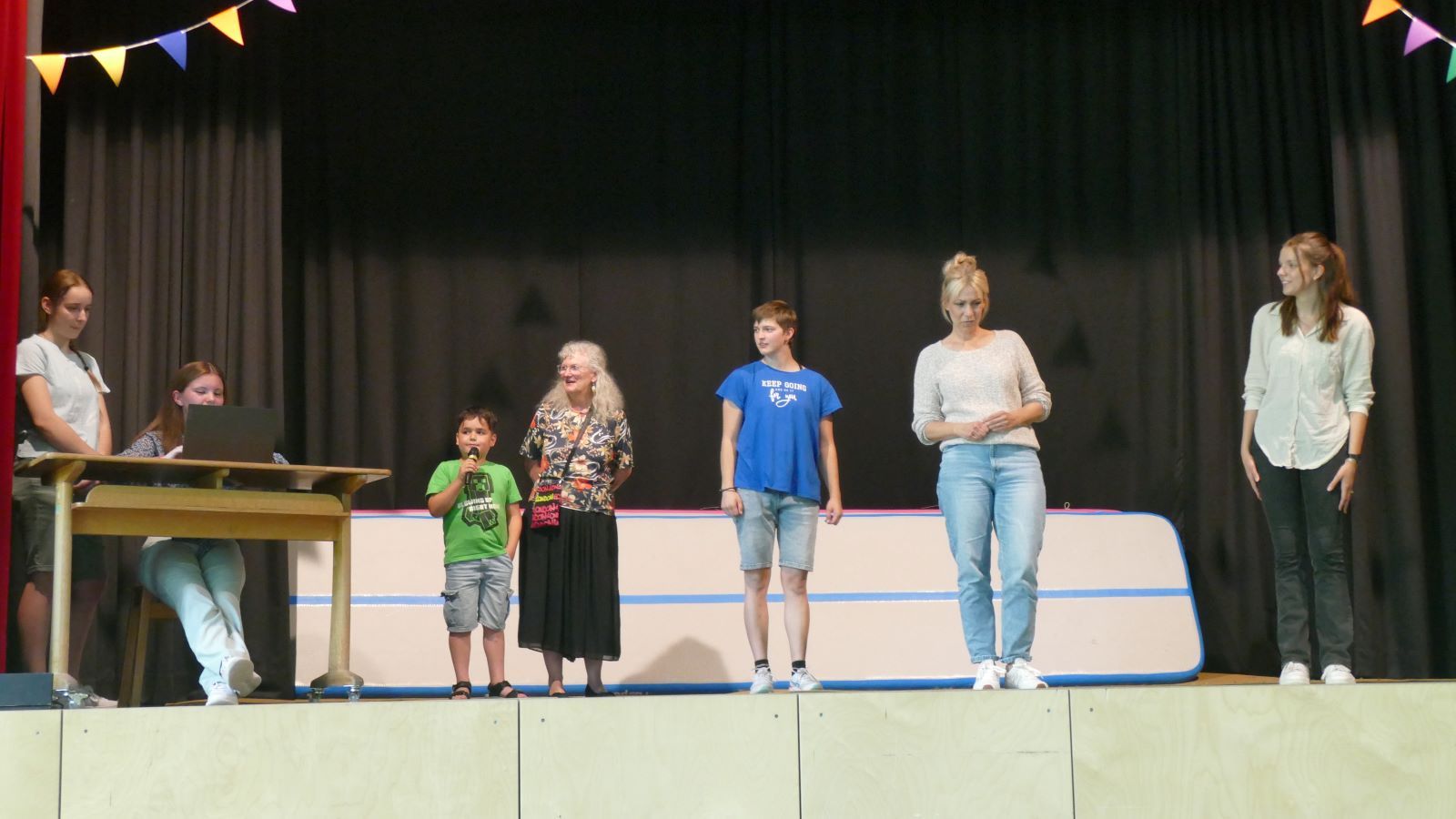 Danach wurde es wieder interaktiv. Beim Spiel „Wer würde eher?“ stellten sich die beiden Stammkursehrerinnen humorvollen Fragen, und im nächsten Spiel mussten sie erraten, welche Schülerin hinter ihnen „Hallo“ sagten. Die Stimmung war ausgelassen und fröhlich.