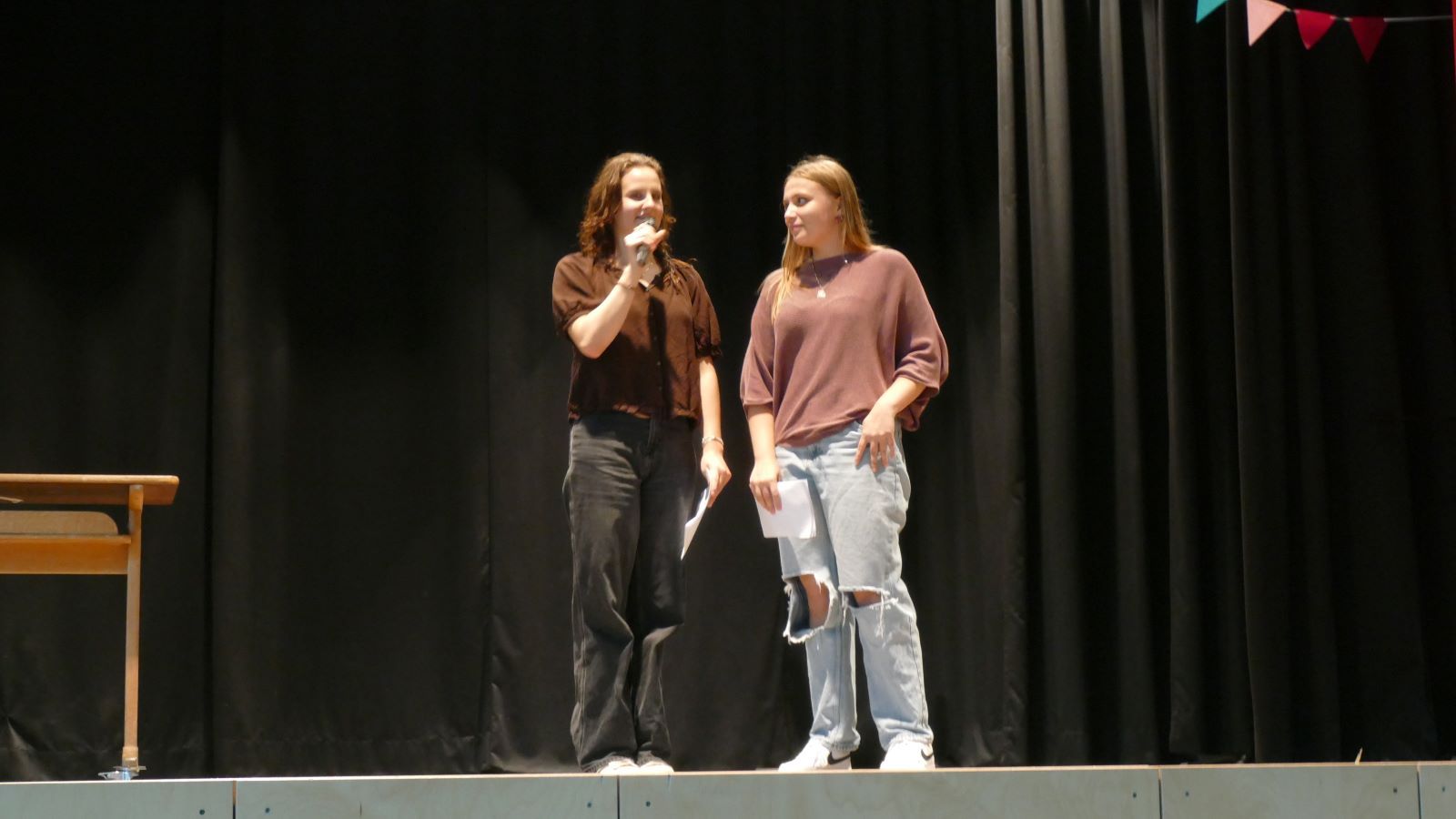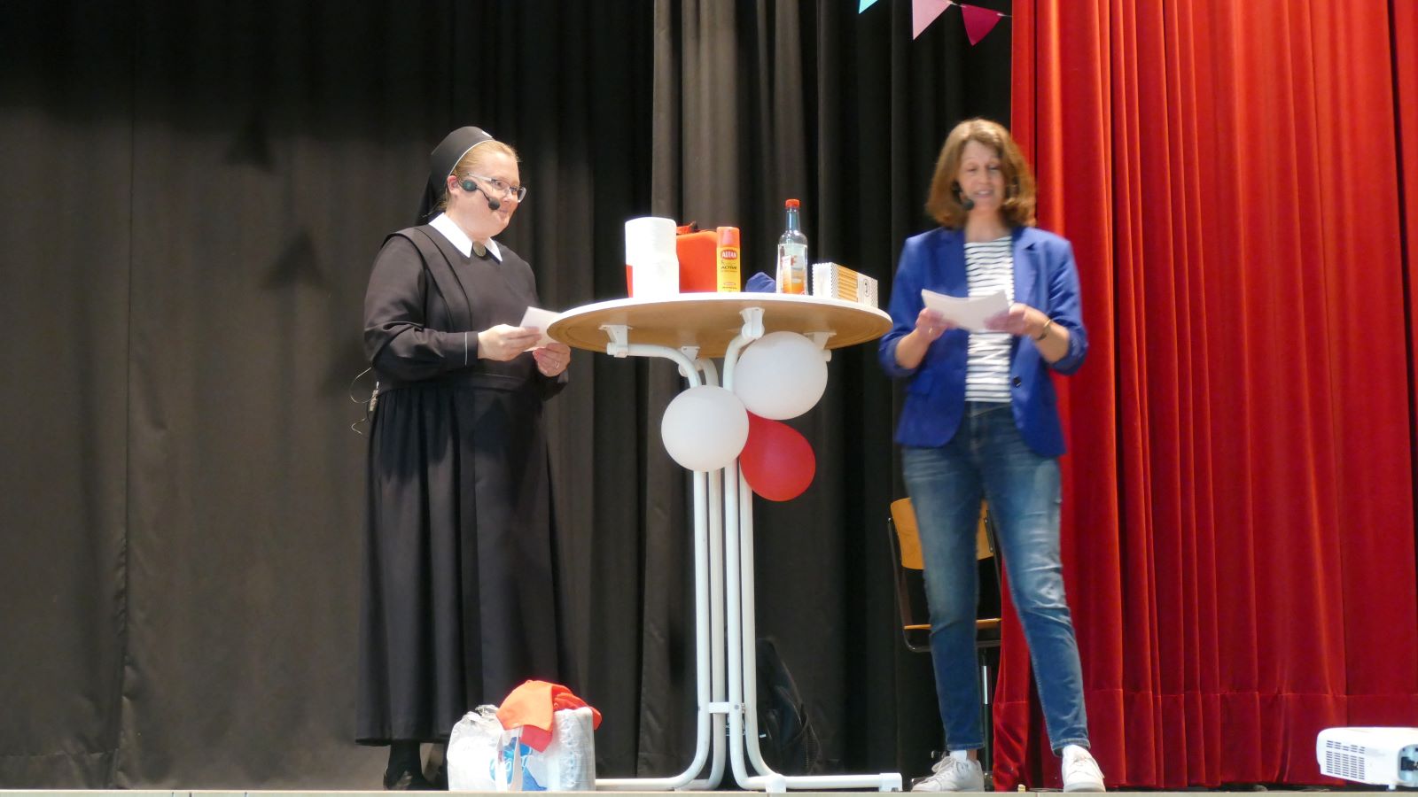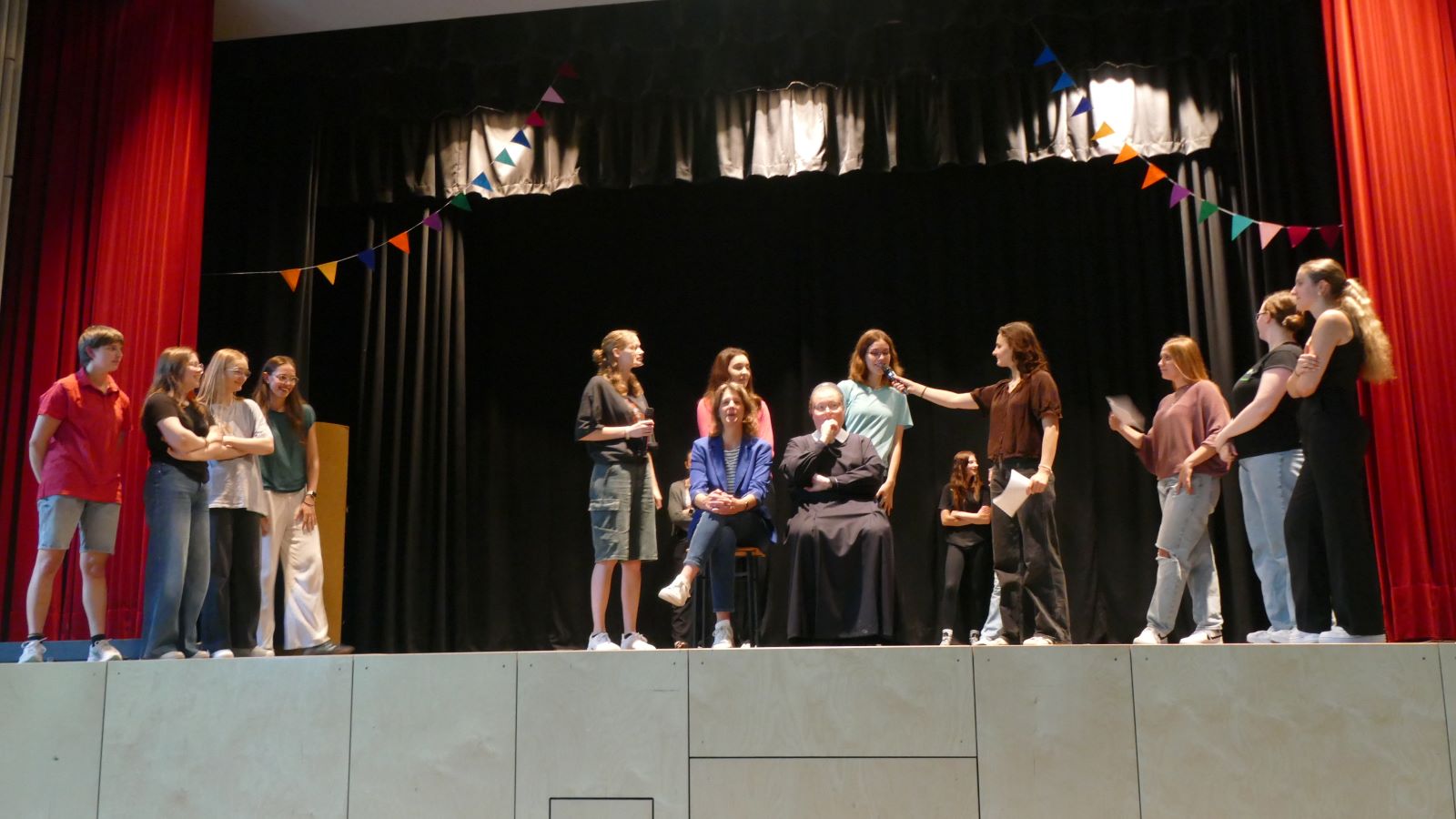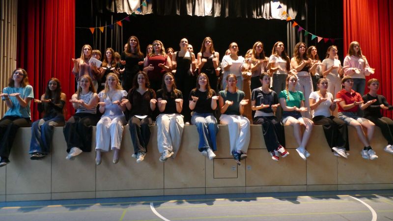 Danach wurde es wieder interaktiv. Beim Spiel „Wer würde eher?“ stellten sich die beiden Stammkursehrerinnen humorvollen Fragen, und im nächsten Spiel mussten sie erraten, welche Schülerin hinter ihnen „Hallo“ sagten. Die Stimmung war ausgelassen und fröhlich.