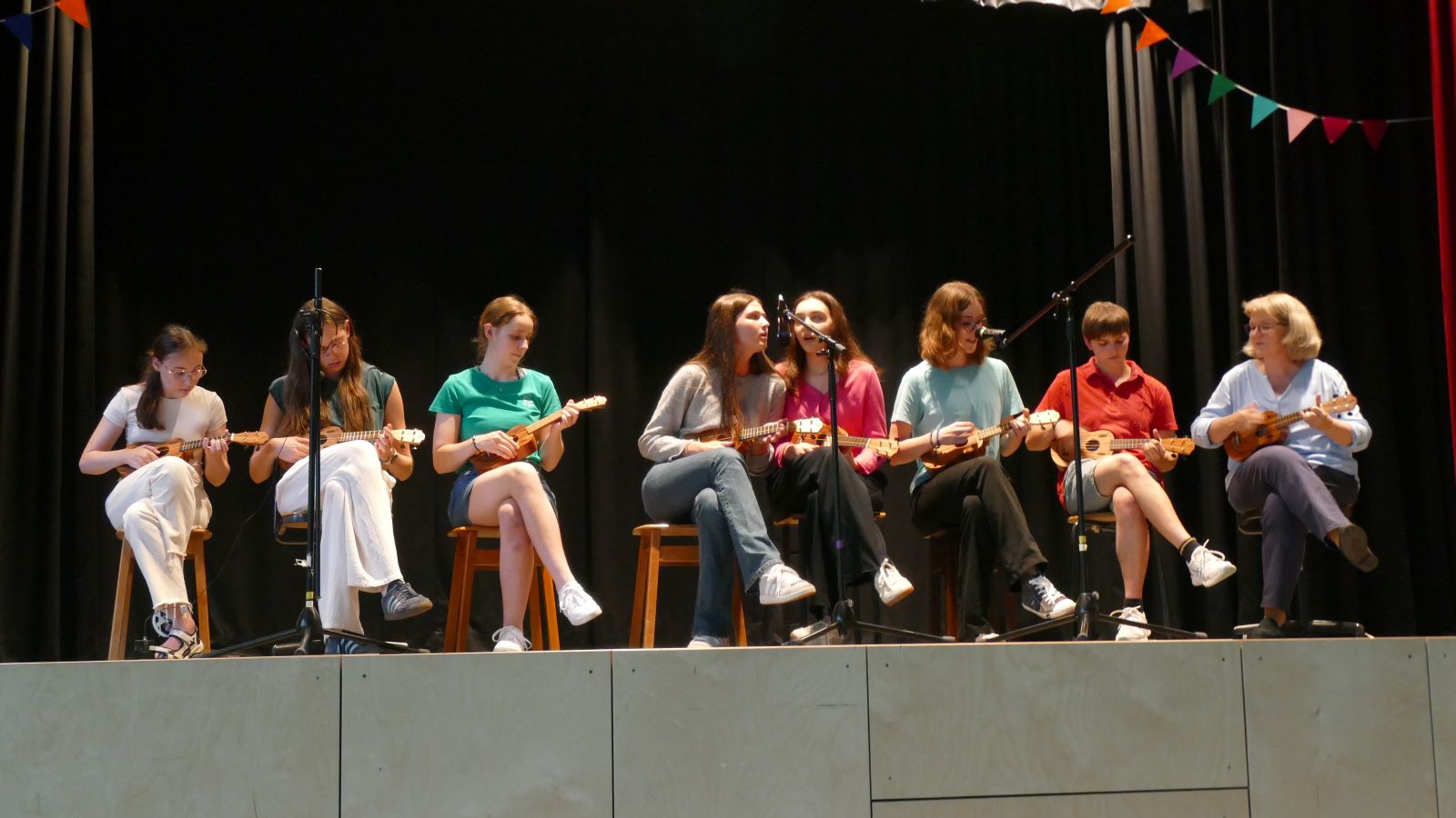 Weitere musikalische Beiträge folgten: Eine Schülerin überzeugte erneut mit ihrer Stimme, bevor der Musikkurs von Frau Jocks mit „Shape of You“ auf Ukulelen einen echten Ohrwurm präsentierte.