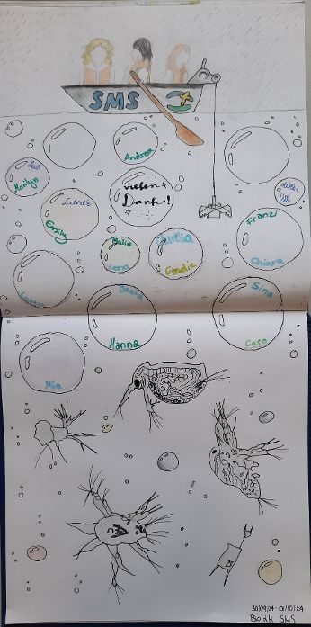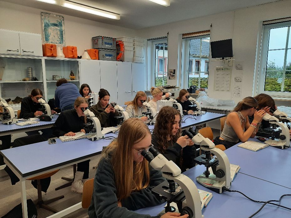 Am 30.9.2024 starteten 17 Schülerin des Biologie Leistungs- und Grundkurses zusammen mit Frau Weber und Herrn Ullenbruch in die Eifel zur Biologisch Ökologischen Station Bettenfeld der Universität Koblenz. Gut in Bettenfeld angekommen, wurden wir von der Stationsleiterin Frau Karger begrüßt, die uns dann ausführlich die Messgeräte erklärte, damit wir auf dem Maar verschiedene Untersuchungen durchführen und Wasserproben aus verschiedenen Tiefen nehmen konnten. Nun endlich ging es mit einem Schlauchboot und einem Blechkahn mit Schwimmwesten bekleidet raus auf das Wasser. Nach anfänglichen Koordinationsproblemen beim Rudern konnte doch zeitnah die Boje in der Maarmitte erreicht und das Boot festgemacht werden. Mit den professionellen und sehr teuren Messgeräten wurde in verschiedenen Wassertiefen der Sauerstoffgehalt, die elektrische Leitfähigkeit und der pH-Wert sowie die Fotosyntheseaktivität des Phytoplanktons bestimmt. Die Sichttiefe wurde ermittelt und Tiefenschlamm nach oben gebaggert und optisch, haptisch und olfaktorisch analysiert. Auf dem Rückweg wurde noch Plankton gefischt.