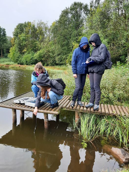 Vom Ufer aus lernten die Schülerinnen etwas über die Entstehung von Maaren und die spezielle Pflanzenzonierung im Uferbereich des Maares. Leider erging es dem Meerfelder Maar in den letzten 150 Jahren nicht besser wie vielen anderen Gewässern in Europa und das Wasser wurde durch die intensive Landwirtschaft und eingeleitete Haushaltsabwässer stark belastet. Dieses hatte eine Eutrophierung (Überdüngung) zur Folge, die zur Faulschlammbildung im Maar führte.
