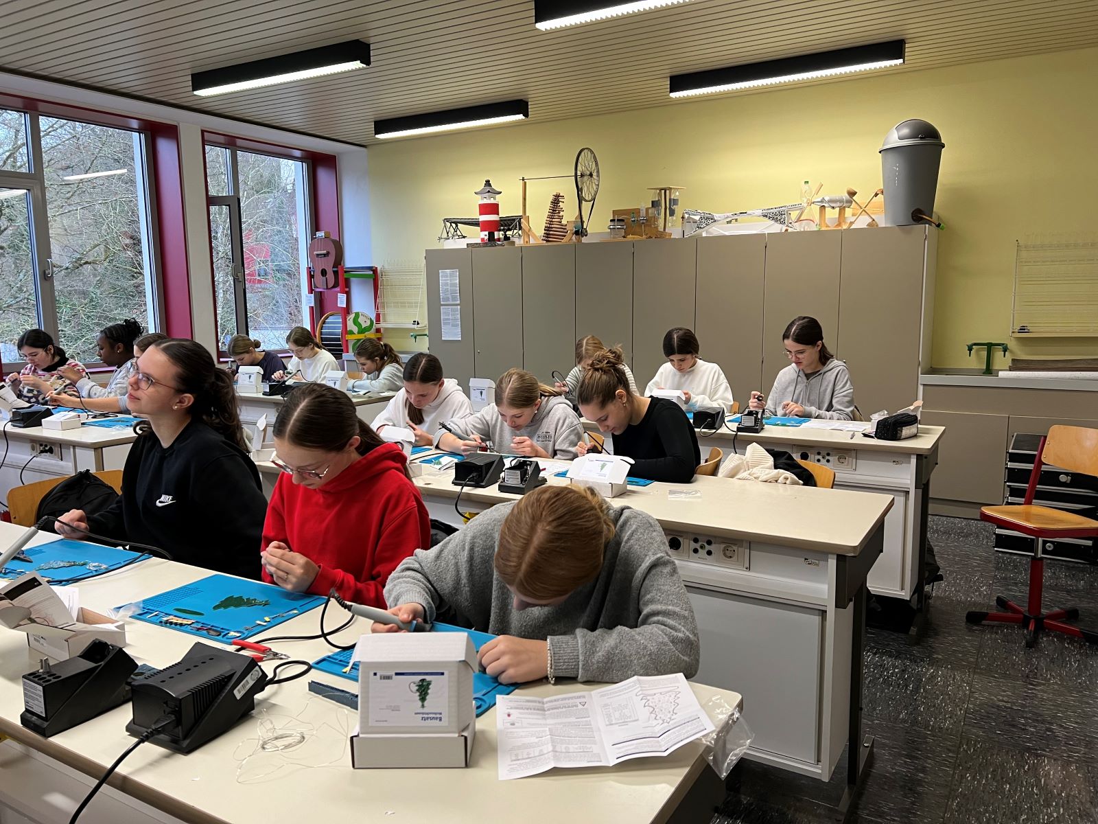 Am letzten Montag vor den Ferien stand für die Schülerinnen der Klasse 8c sowie des Physik-Grundkurses der Jahrgangsstufe 11 ein besonderes Projekt auf dem Plan: Unter der fachkundigen Anleitung von Frau Schwarz, Herrn Schwarz von der Firma Elektrotechnik Schwarz und Herrn Thielmann von der Universität Koblenz durften sie erstmals praktische Erfahrungen im Bereich der Elektronik sammeln. Ziel war es, kleine, blinkende Tannenbäume zu löten – ein Highlight, das Physik greifbar und erlebbar macht.