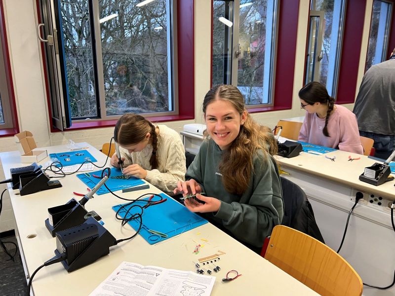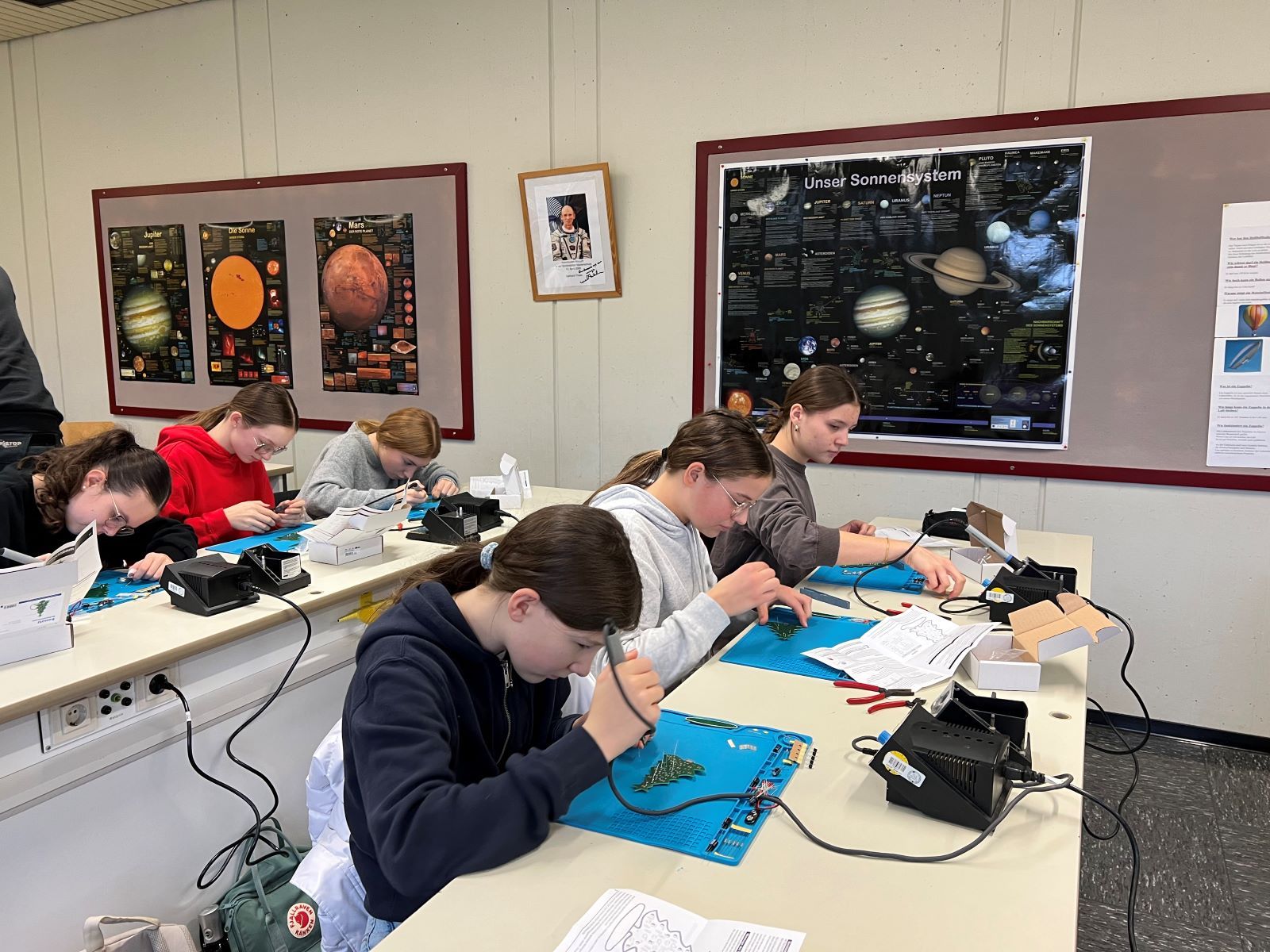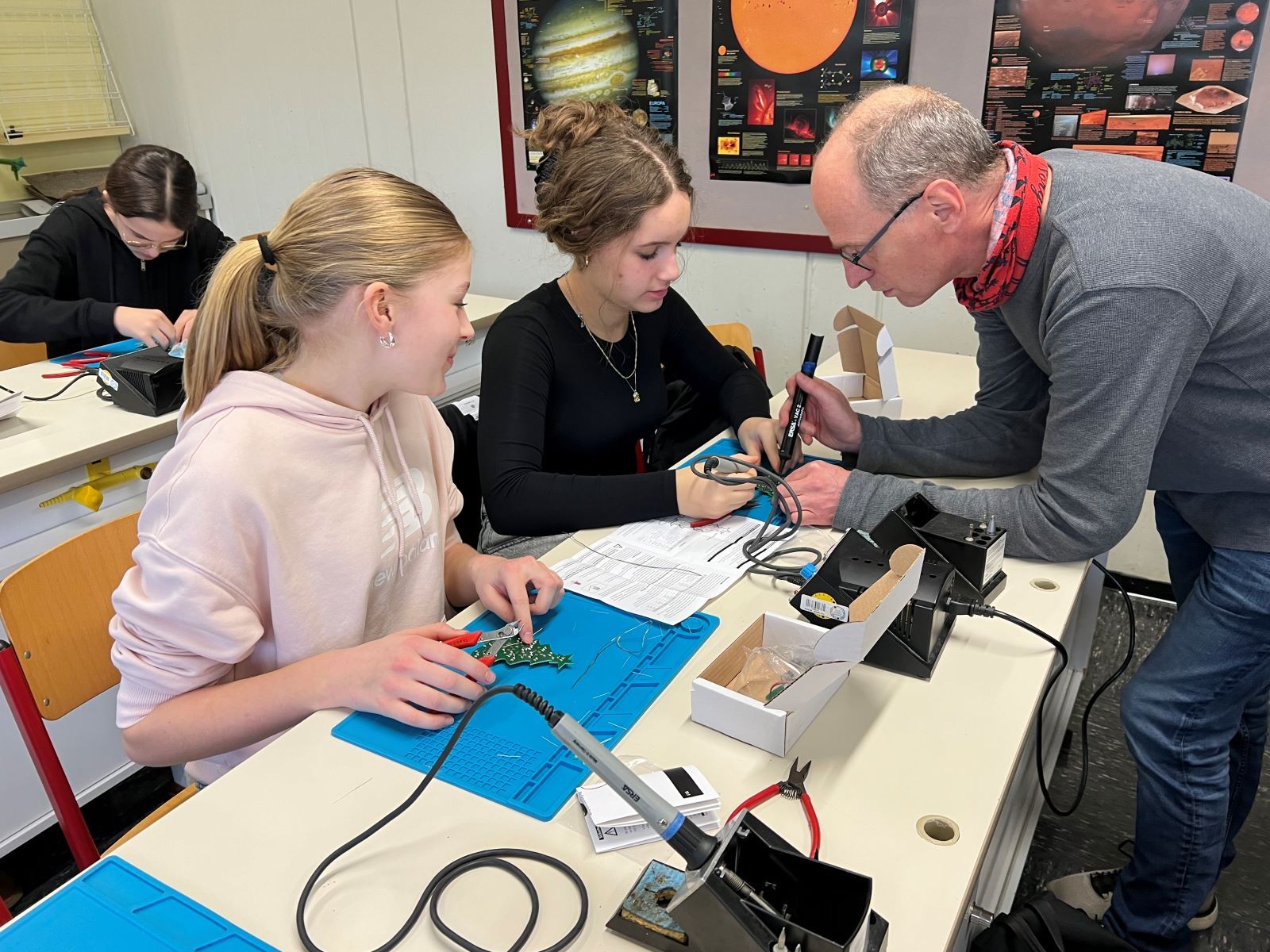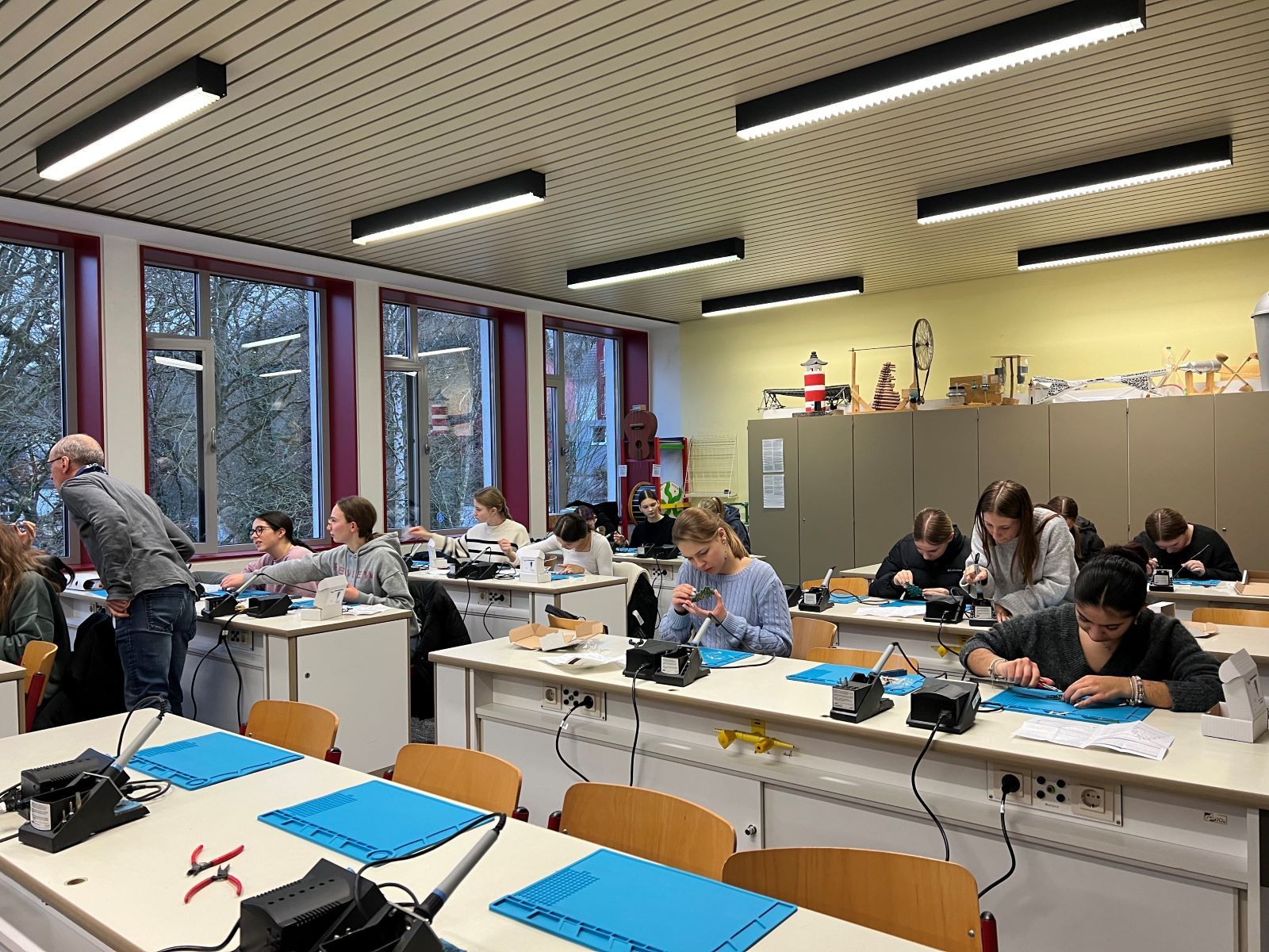 Löten für die Wissenschaft: Physik-Schülerinnen der Klassen 8c und Grundkurs 11 gestalten blinkende LED-Tannenbäume