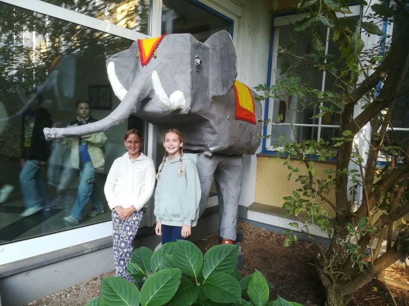 Ganz schön kolossal, der Dickhäuter im Garten vor dem Klassenarum der 6c. Wer auf dem Hof und in den Fluren an ihm vorbeiläuft, schaut zweimal hin. Der imposante Elefant ist eben ein Hingucker. Und bei näherem Hinsehen, kommt bei manchen die Erinnerung, diese Requisite schon mal irgendwan, irgendwo gesehen zu haben. Richtig! Es handelt sich um ein Kunstwerk, das für die Darbietung des Musicals "Zirkus Furioso" im Sommer 2023 gestaltet wurde und das auch auf der Aulabühne Furore gemacht hat. ( https://www.schoenstaetter-marienschule.de/schulleben/archiv Nachrichten vom 25.06.2023)