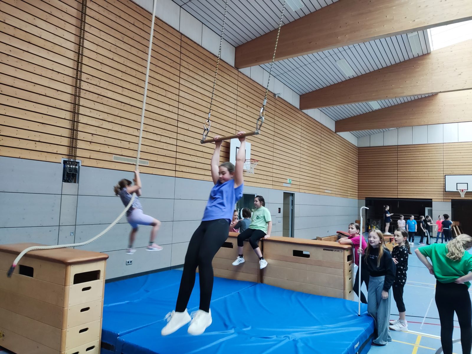 An einer anderen Station konnten sich die Mädchen mit einem Tau von einem Kasten zum anderen schwingen oder mit dem Trapez eine große „Wasserfläche“ überwinden. Einige haben sich sogar getraut an das Trapez zu springen und dann weiter zu schwingen.