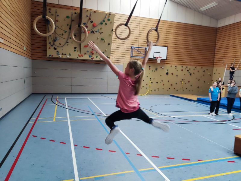 Am 15.01.2025 hat die 5c im Sportunterricht ganz viele unterschiedliche Stationen à la Ninja Warrior aufgebaut. Anschließend konnte der Zweisprung bewältigt, über die Sprossenwand geklettert, am hohen Reck gehangelt und durch die Reihe Ringe geschwungen werden. Einige Schülerinnen haben diese Stationen zu einem Parcours zusammengefügt und ausprobiert wer ihn am schnellsten bewältigen kann.