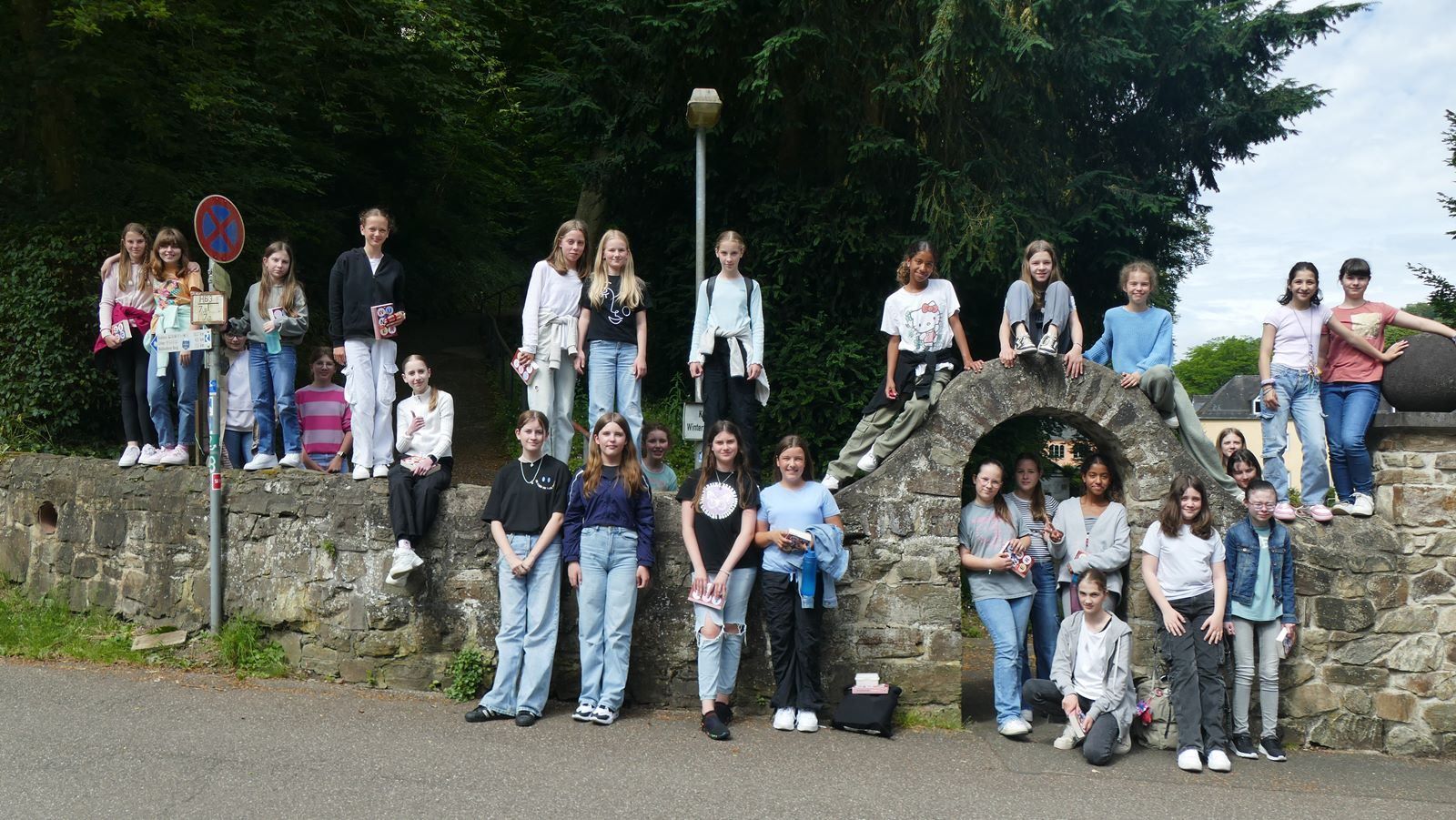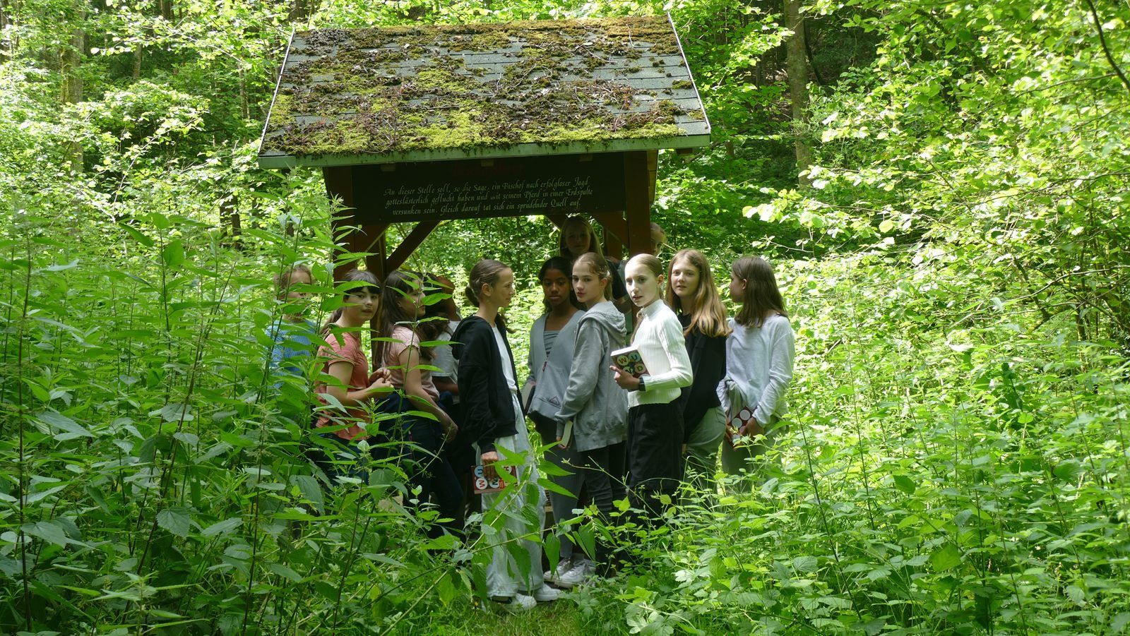 Am 18.06.2023, am Ende der Unterrichtsreihe, war es für die Schülerinnen der 6d an der Zeit, sich auf den Weg zu machen, wenn auch nicht auf den ganzen „Rheinischen Sagenweg“ zwischen Mainz und Düsseldorf, an Rhein, Lahn und Nahe – das wäre etwas für die Sommerferien –, so doch immerhin zum Handlungsort einer Lokalsage, dem Vallendarer Bischofsborn im Wambachtal. Nicht weit von der Wambachhütte entfernt, fanden die 33 Schülerinnen den „Bischofsborn bei Vallendar“. Nach einem Sprung über den Bach war man an der sagenhaften Stelle angelangt. Um den Bischofsborn bzw. das Bischofsbrünnlein rankt sich die folgende Sage.