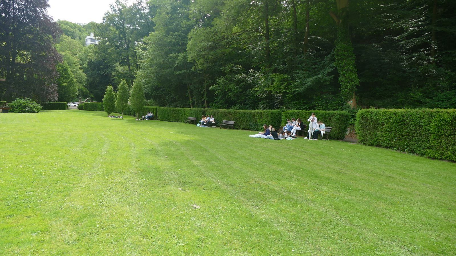 Nachdem der Sagenort ausgekundschaftet worden war, spazierte die Gruppe durch die sommerlich-schwüle Natur zur Pilgerwiese neben dem Urheiligtum. Dort fand die Doppelstunde Deutsch ihre Fortsetzung mit der Lektüre des Jugendbuches „Wunder“ von Palacio. Die Besprechung des Romans schließt sich an die Sagenreihe an.