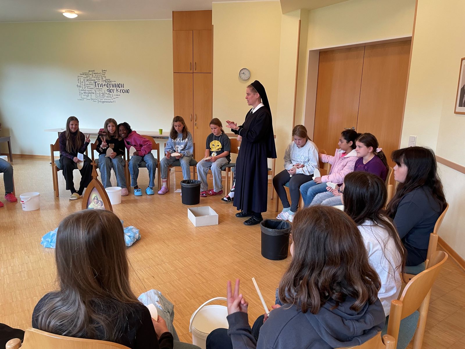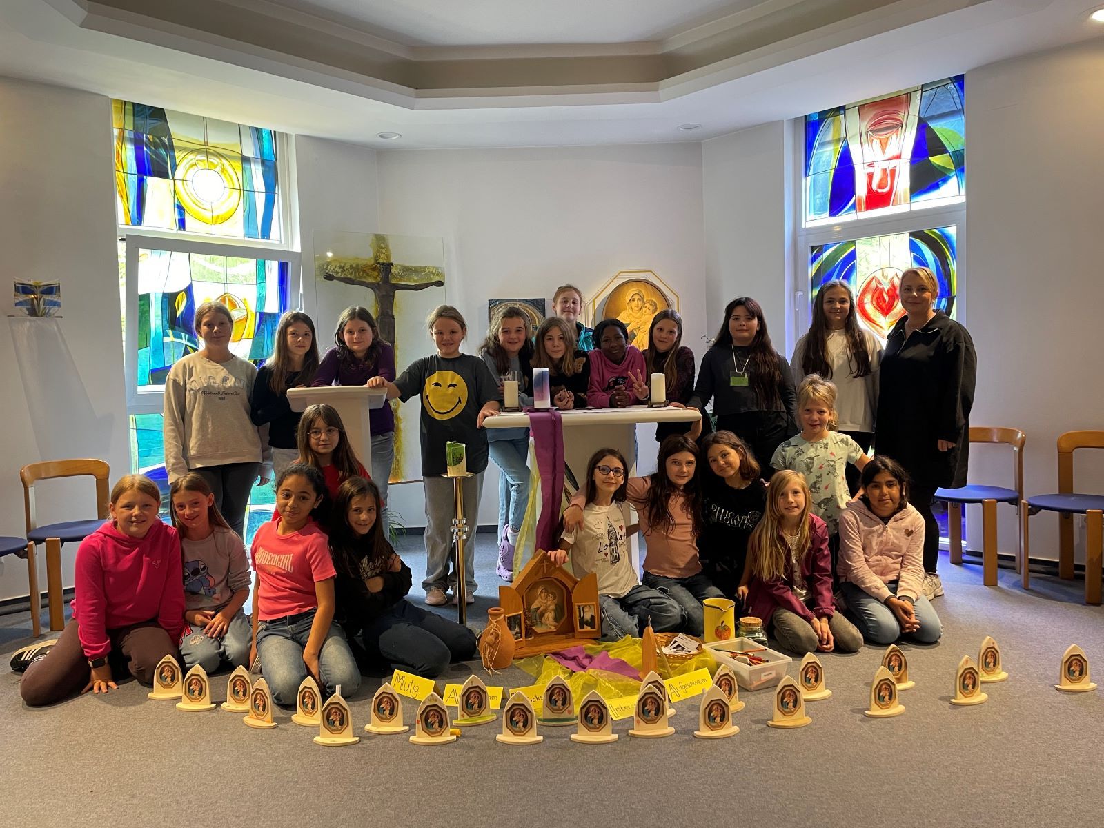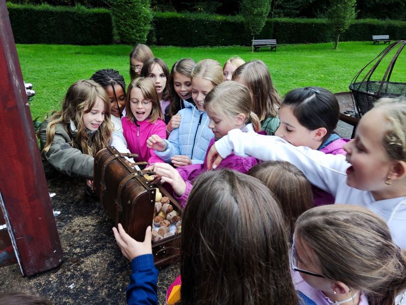 Die Schülerinnen der Klassen 5b und 5c haben bereits vor den Herbstferien ihre erste kleine Klassenfahrt im Haus Sonnenau unternommen, nämlich am 23. und 24. sowie am 25. und 26.09.2024. Begleitet wurden sie von ihren jeweiligen Klassenlehrerinnen Frau Helfer und Frau Franke, die zusätzlich Unterstützung von Schwester Mariette erhielten. Während der Fahrt erhielten die Schülerinnen einen Einblick in die Geschichte von Schönstatt und hatten vielfältige Gelegenheiten, sich untereinander besser kennenzulernen. Zu den Aktivitäten gehörten unter anderem die gemeinsame Suche nach einem Schatz, das Erleben eines Barfußbades im Bach, gemeinsames Singen und ausgiebige „Zimmerzeit“, in der Klopfstreiche nicht fehlen durften.