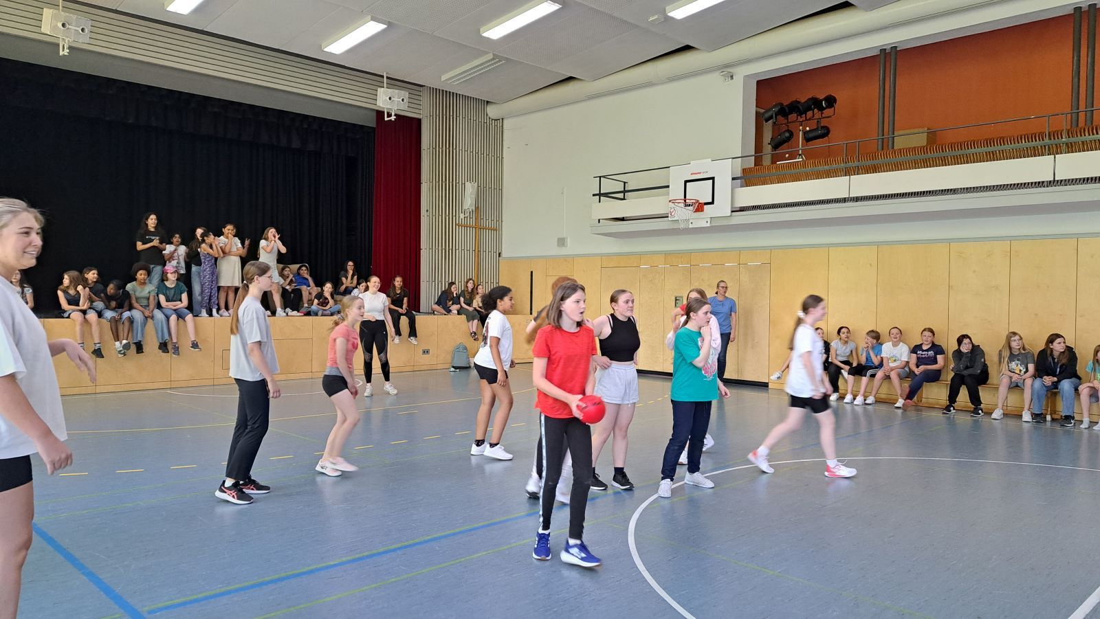 Unsere verschiedenen Lernzeiten traten täglich im Völkerball gegeneinander an und feuerten sich dabei lautstark gegenseitig an. Ein besonderes Highlight war das Freundschaftsspiel der Schülerinnen gegen die Lehrerinnen, das für ausgelassene Stimmung sorgte und sogar Zuschauerinnen von außerhalb der Ganztagsschule anzog.
