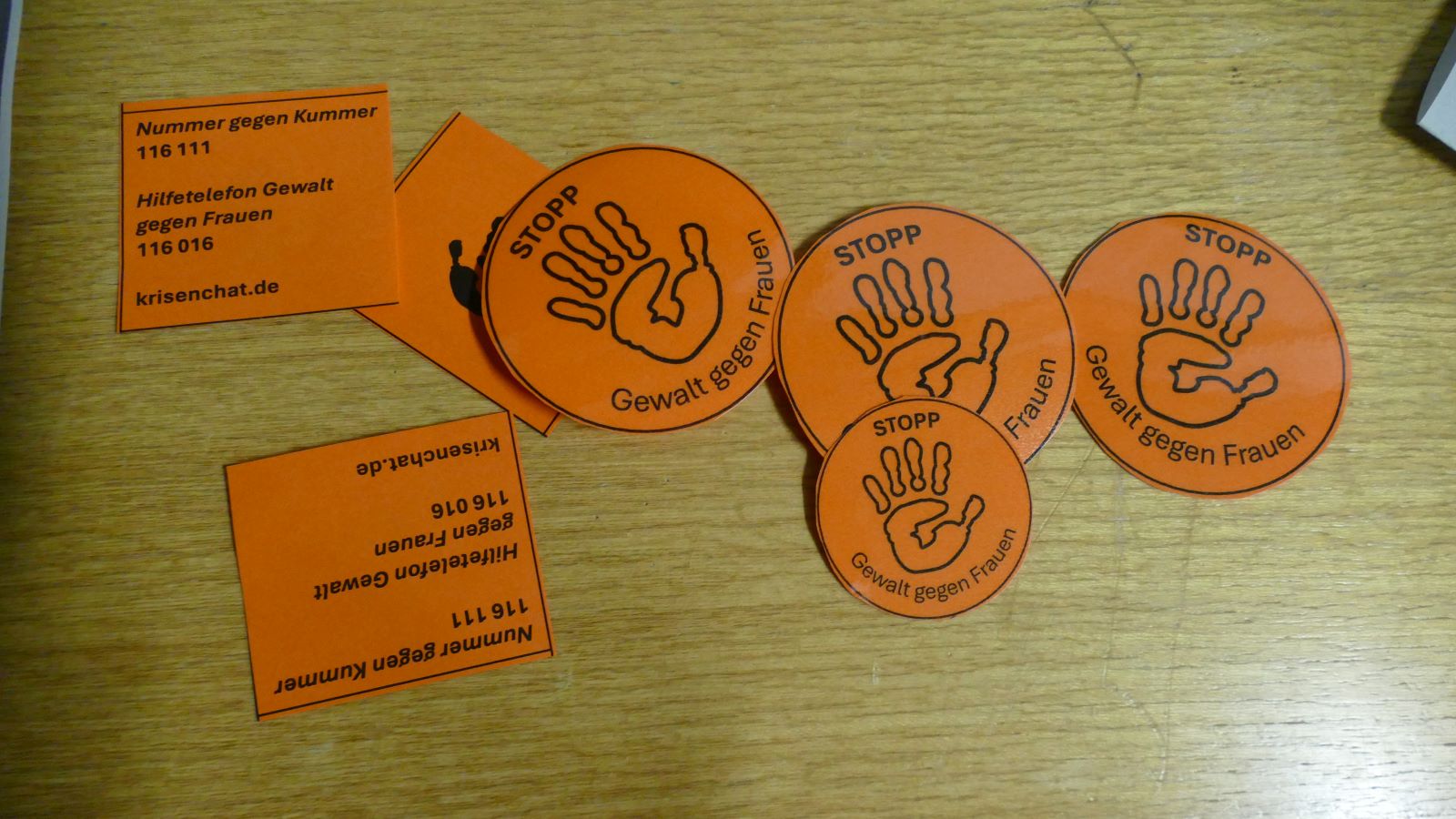 Ganz wichtig ist den Lehrkräften die Schülerinnen dafür zu sensibilisieren, dass das Opfer keine Schuld trägt und dass es kompetente Hilfsangebote gibt, die man früh wahrnehmen sollte. Sie ermutigen die Schülerinnen Gewalt gegen Frauen niemals zu tolerieren und solidarisch Verantwortung für die Frauen um sich herum zu übernehmen: Gute Freundinnen schauen hin, fragen nach, unterstützen, bieten Hilfe an. Sie wenden sich nicht ab, wenn die Freundin sich seltsam verhält und „Red Flags“ ignoriert. Unterstützt durch Schülerinnen der Jahrgangsstufe 12 teilen sie deshalb eine Hilfekarte aus, die in die Handyhülle passt und die wichtigsten Telefonnummern und Anlaufstellen zeigt.