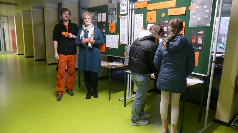 Initiiert und vorbereitet wurde die Aktion durch Fr. Böhm und Hr. Kiefer. Die beiden Lehrkräfte gestalteten einen Aktionsstand, an dem vielfältige Materialien (Poster, Flyer, Buttons etc.) ausgestellt und verteilt werden. Die Schülerinnen können sich über das Thema informieren, miteinander ins Gespräch kommen, eine Haltung entwickeln und Handlungsoptionen kennenlernen, sollten sie selbst oder Freundinnen davon betroffen sein.