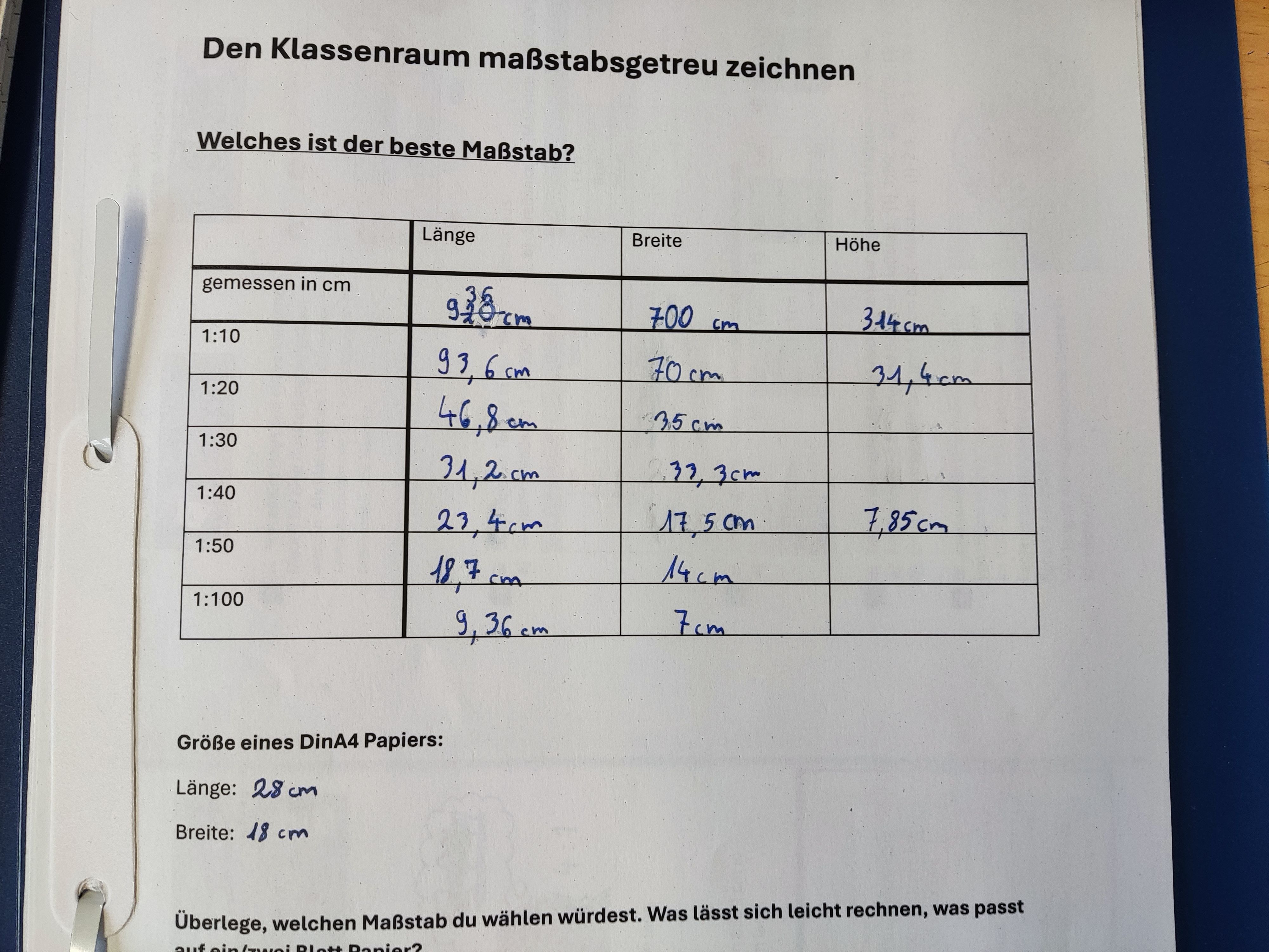 Jetzt mussten wir herausfinden, wieviel Farbe wir jeweils brauchen. Da im Fach Mathematik gerade Längen, Flächen und Maßstab behandelt wurden und im Fach Erdkunde ebenfalls der Maßstab, wurde der gesamte Klassenraum ausgemessen und maßstabsgetreu gezeichnet. Anschließend konnten wir die Flächen für die einzelnen Farben berechnen. Das Umrechnen von Metern in Zentimeter, und von Quadratzentimetern in Quadratmeter wurde dabei viel geübt.