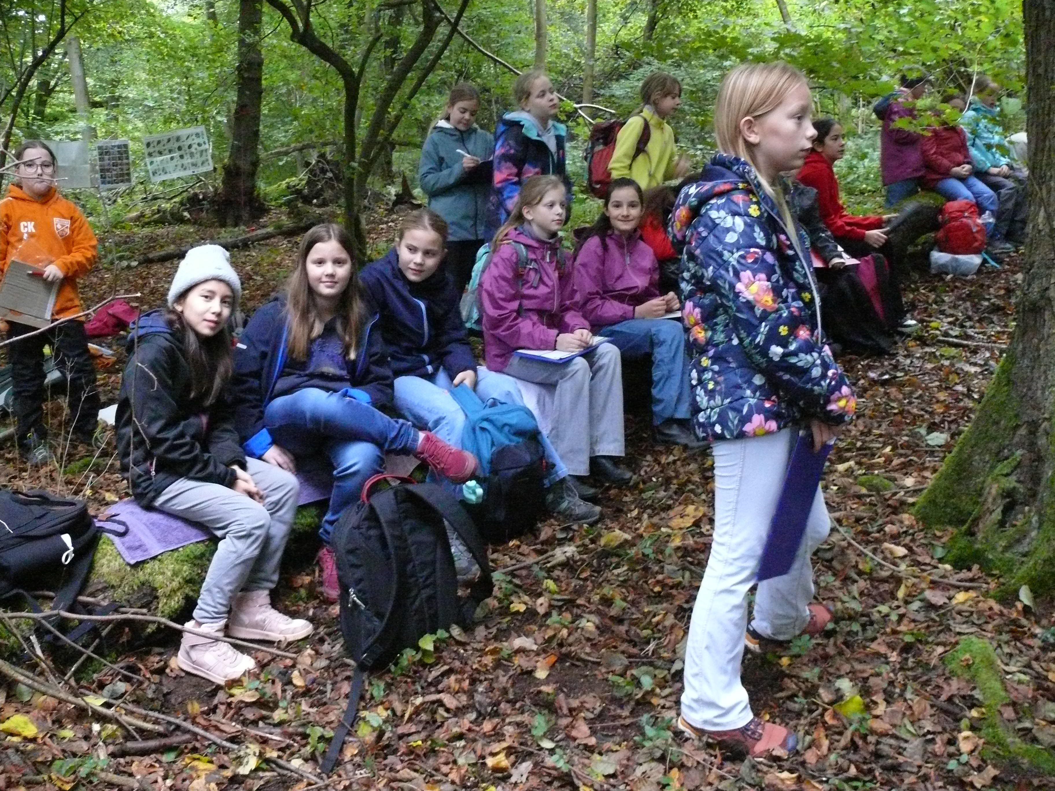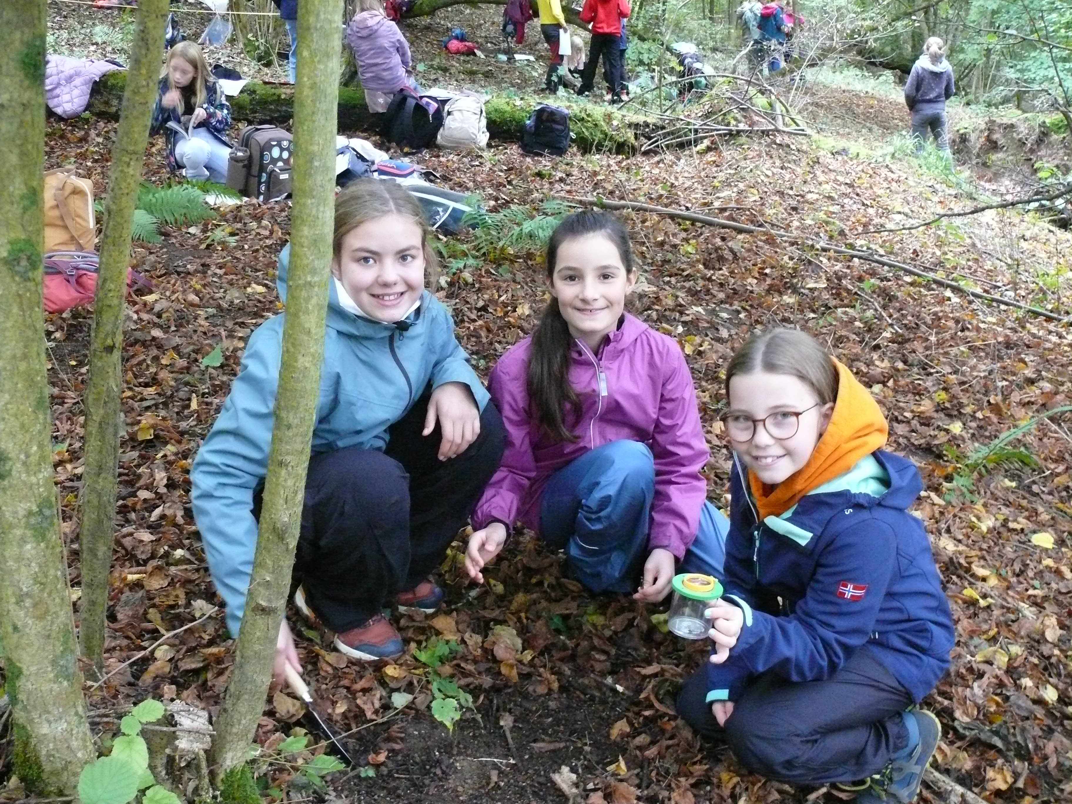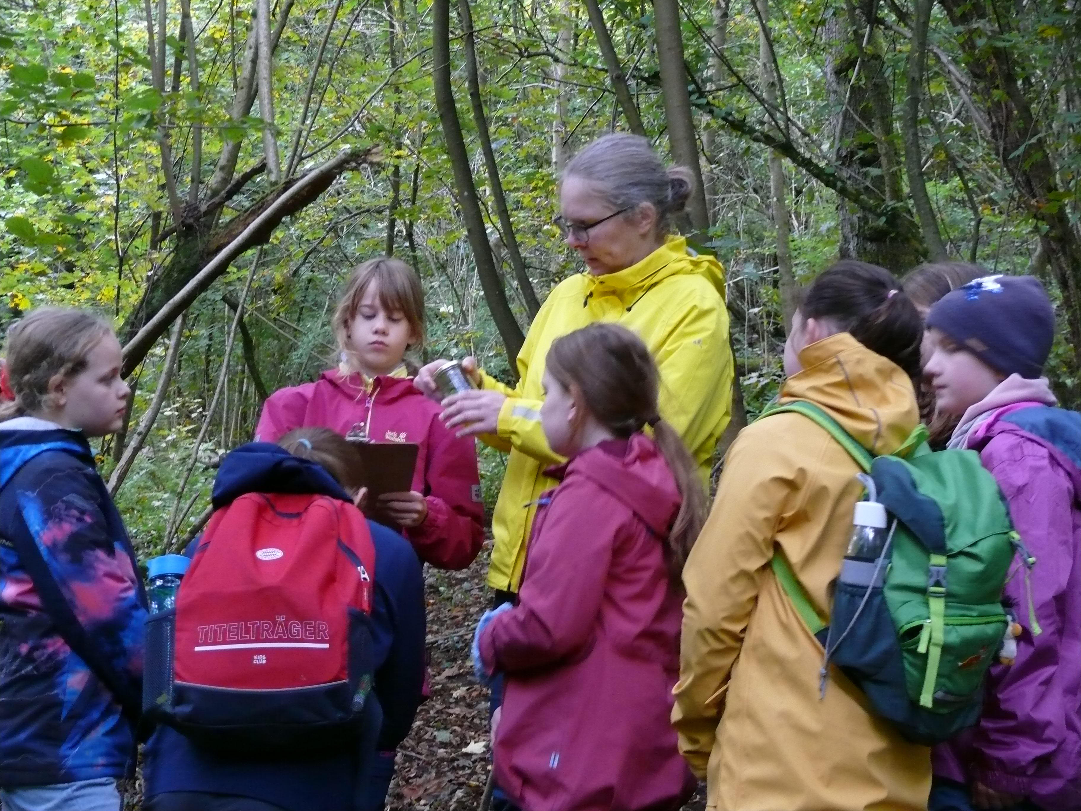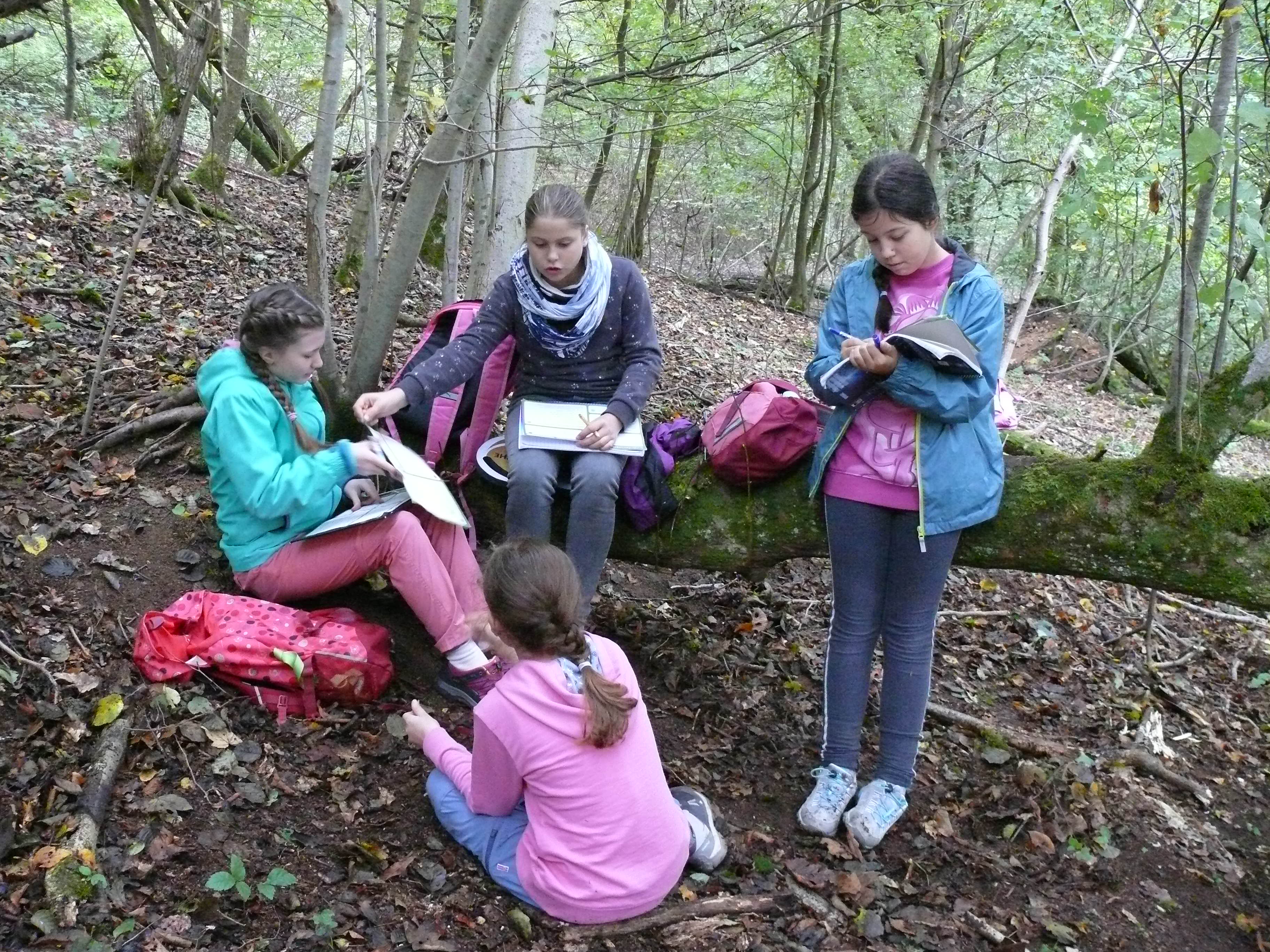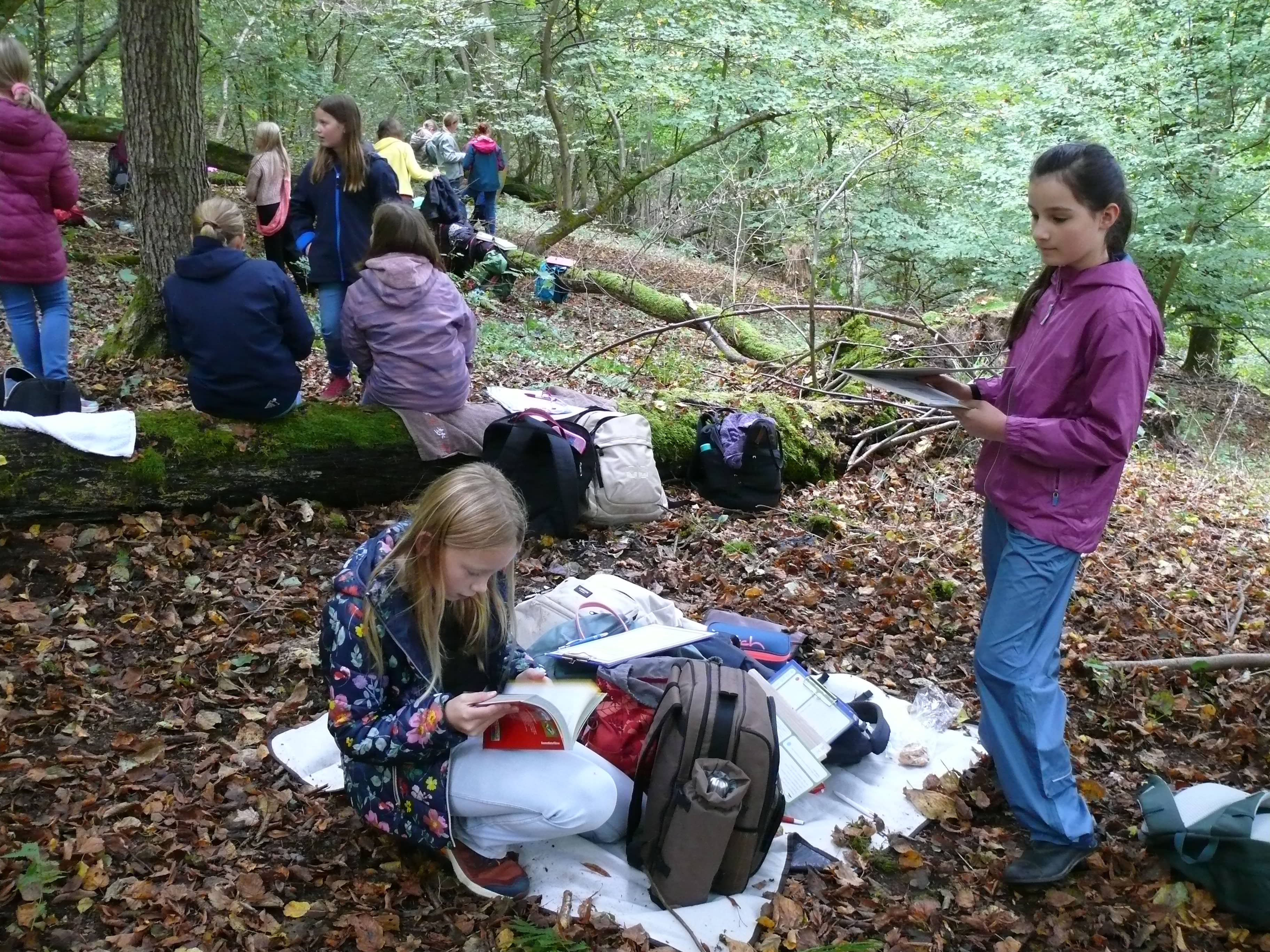 Anschließend erforschten die Schülerinnen in Kleingruppen verschiedene Aspekte des Waldes. So machten sie sich mit Becherlupe und Bestimmungsbuch auf die Suche nach den kleinen Bewohnern des Waldbodens; sie identifizierten verschiedene Pflanzen, Tiere und Pilze und lernten dabei mehr über die verschiedenen Stockwerke des Waldes.