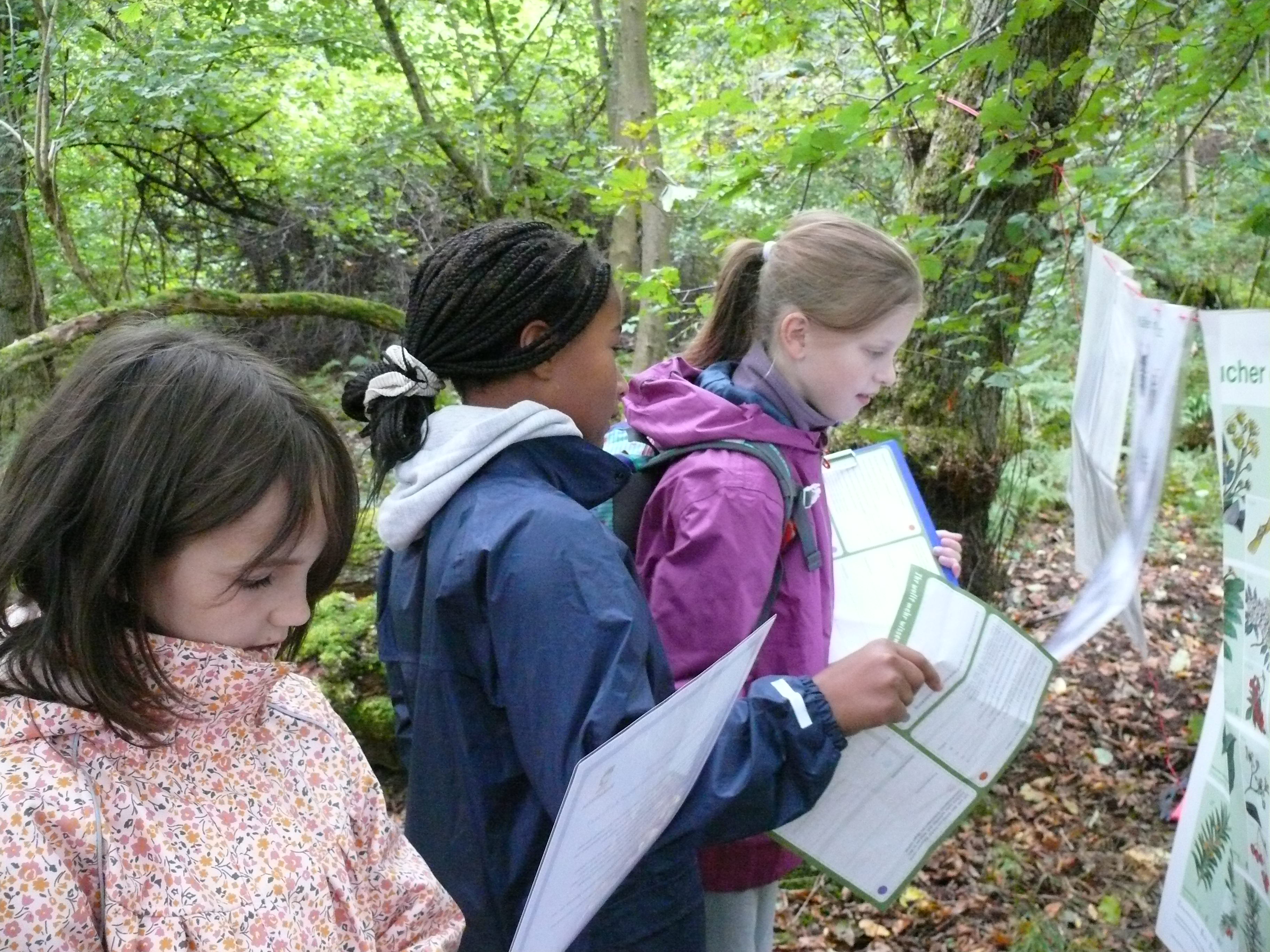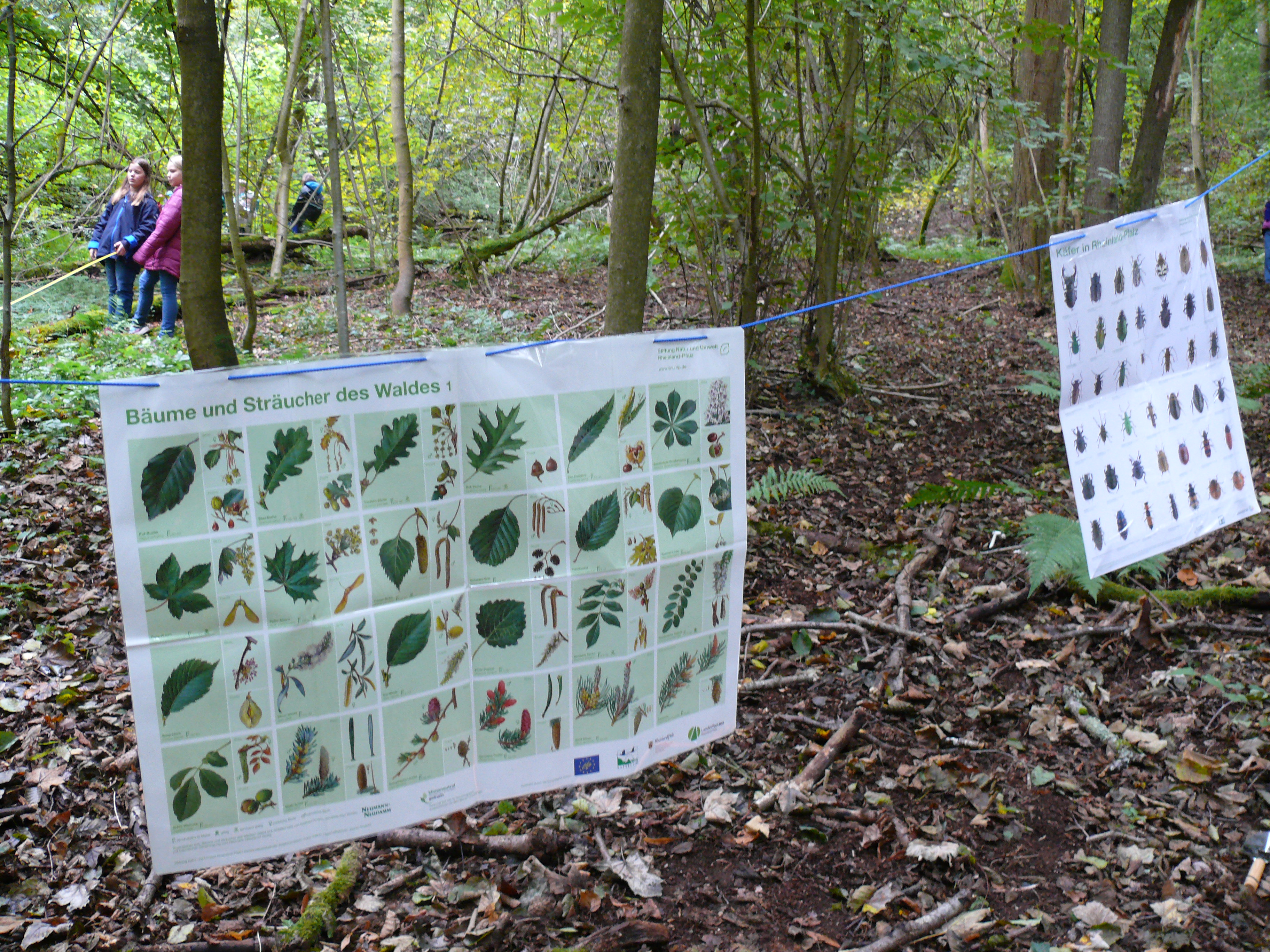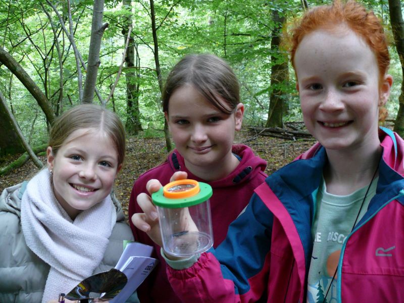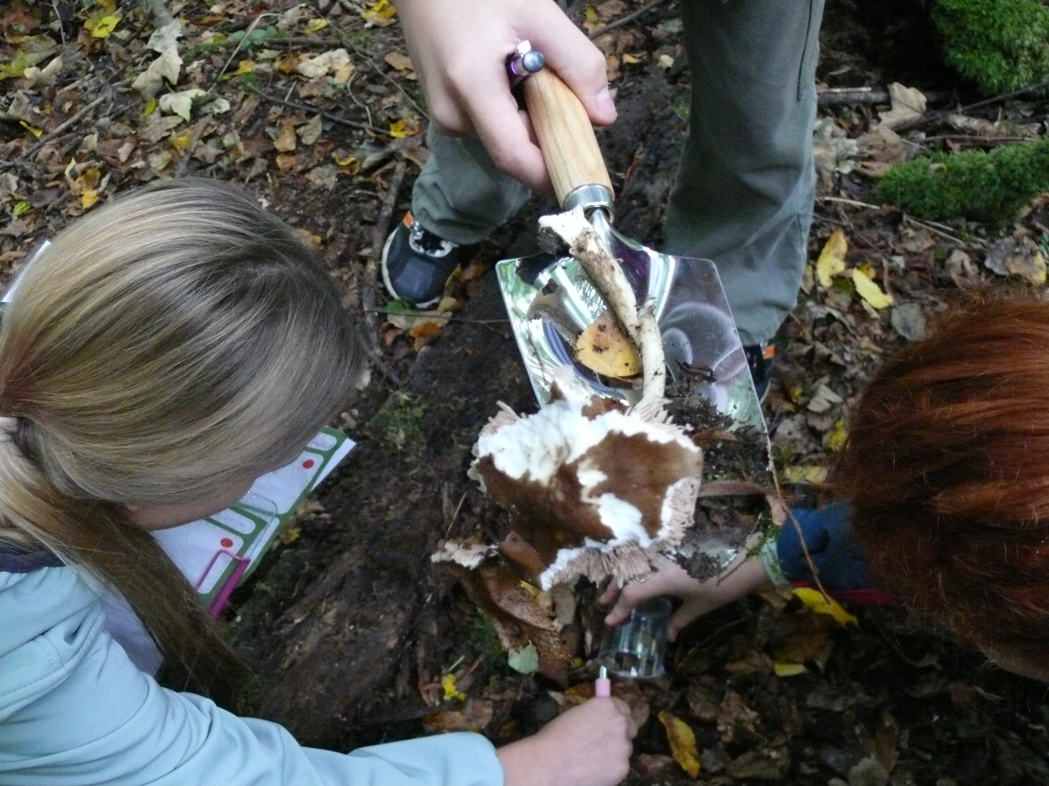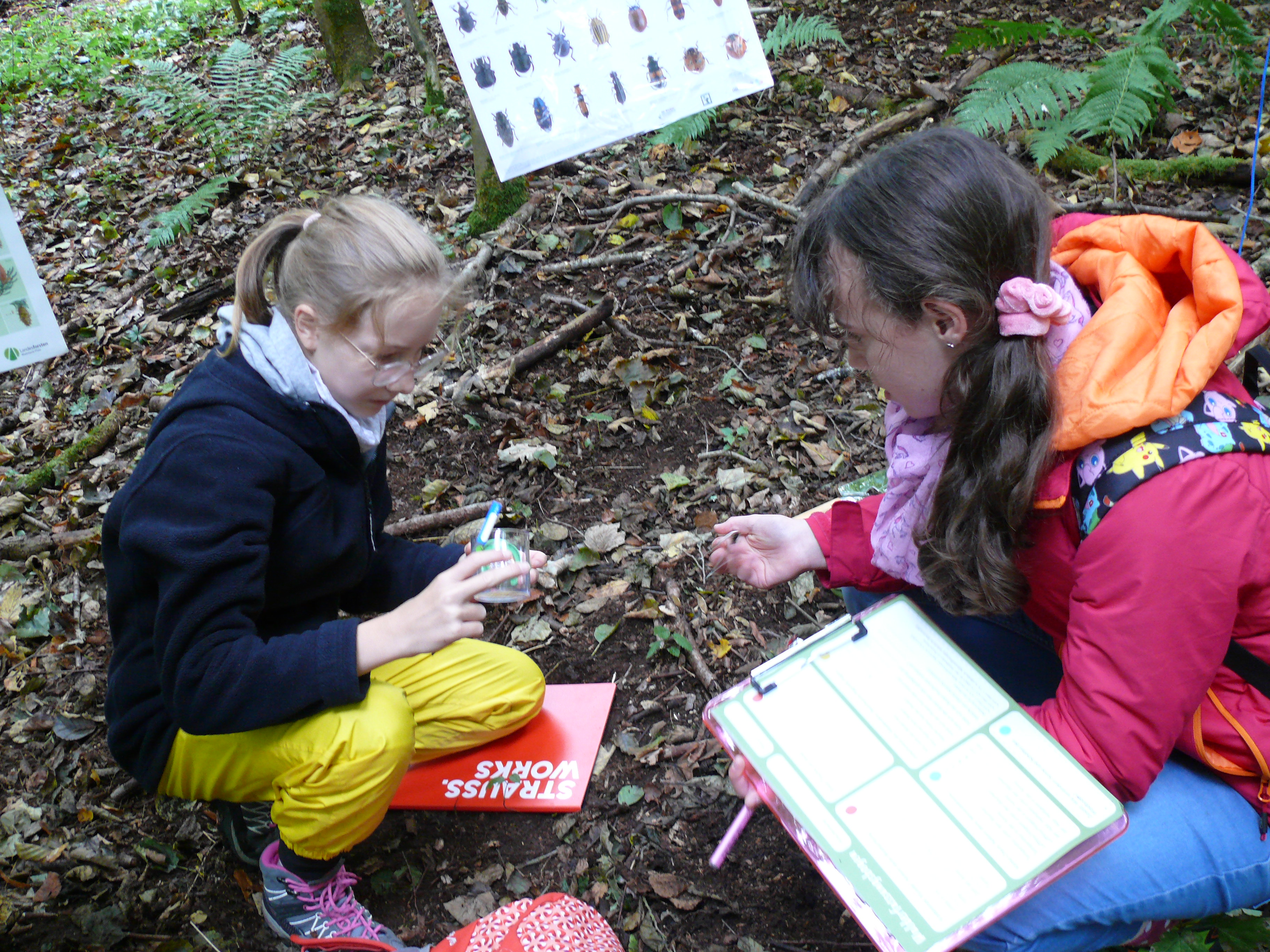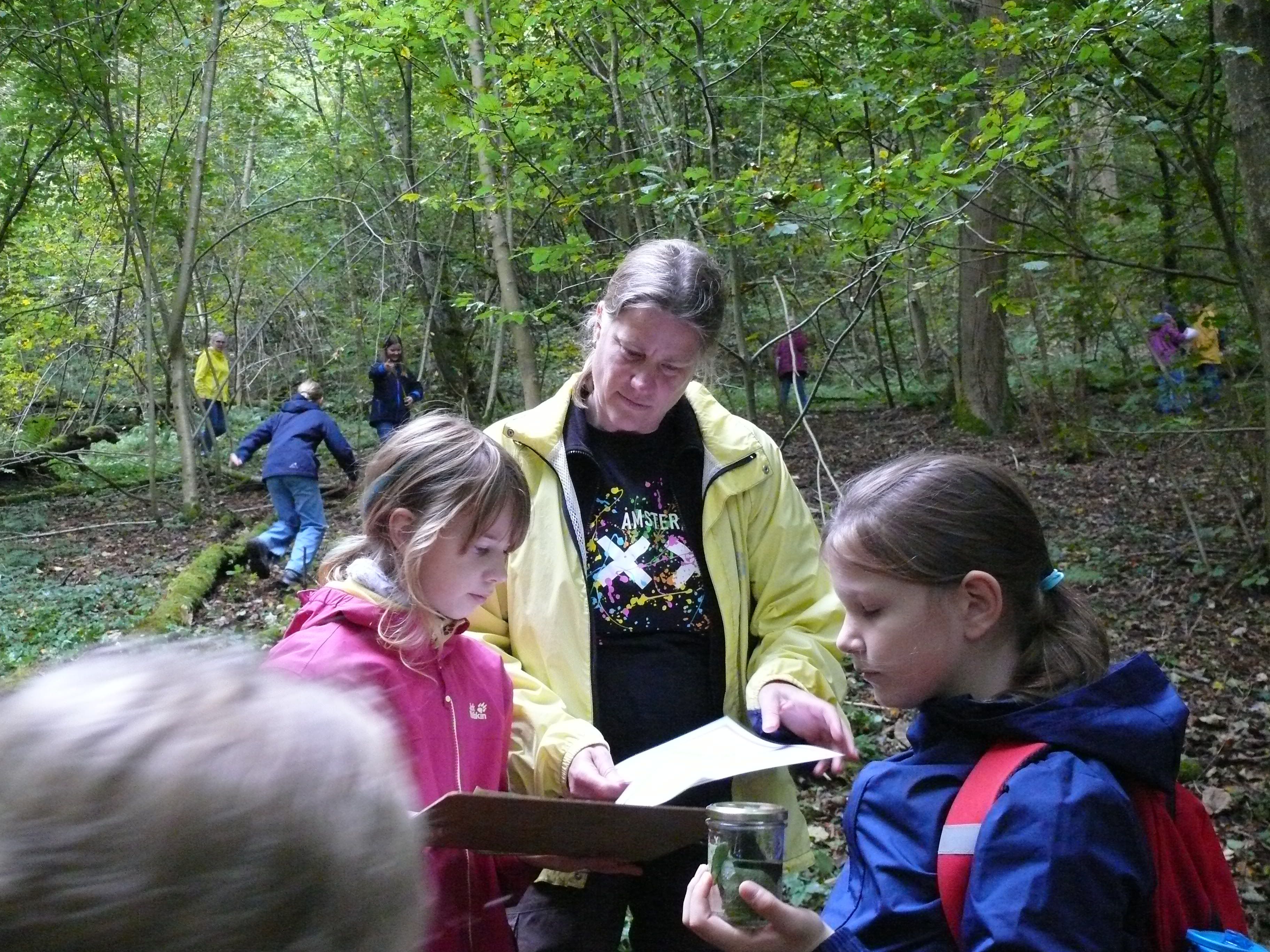 Anschließend erforschten die Schülerinnen in Kleingruppen verschiedene Aspekte des Waldes. So machten sie sich mit Becherlupe und Bestimmungsbuch auf die Suche nach den kleinen Bewohnern des Waldbodens; sie identifizierten verschiedene Pflanzen, Tiere und Pilze und lernten dabei mehr über die verschiedenen Stockwerke des Waldes.