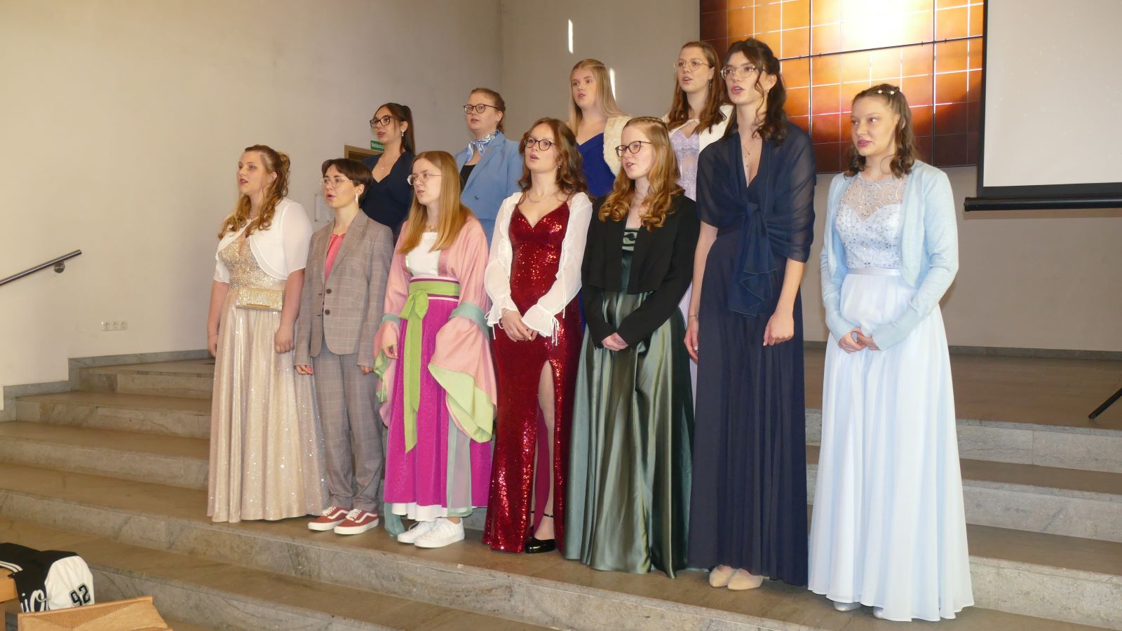 Fortgeführt wurde die Entlassfeier der Abiturientinnen in der Marienschule. Dort nahmen die jungen Damen Aufstellung für das Jahrgangsfoto. Schülerinnen der MSS 12 bewirteten die Familienangehörigen und Freunde mit Kaffee und Gebäck. Danach begann das Programm der Abiturfeier in der Aula unter dem Motto: „Abi springs - follow the call of the discoball“